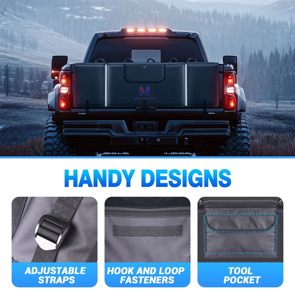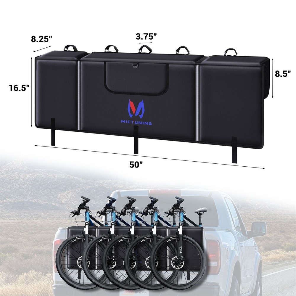 Tailgate Pad Bike Rack for 5-Bikes Tailgate Pad Pickup Truck Bed Protector Cover MICTUNING Tailgate Bike Pad for Mountain Bike, Secure 5 Bikes on Truck, with Reflective Strips and Tool Pocket, for Outdoor Bicycle Transportation About the item: Secure Transport for up to 5 Bikes - Our 50"L X 16.5"H X 8.25"D Tailgate Pad Features Adjustable Straps That Hold up to 5 Bikes Firmly in Place, Protecting Both Your Truck and Your Bikes from Scratches or Damage During Transport Built for All Weather Conditions - Made from 600d Pvc, the Bike Pad's Waterproof and Abrasion-resistant Outer Layer Protects Against the Elements. the Soft Flannelette Inner Layer, Combined with a Thick Shock-absorbing Pad, Ensures Your Bikes Stay Safe and Steady on Bumpy Roads Enhanced Safety with Reflective Strips - High-visibility Reflective Strips Improve Safety During Nighttime or Low-light Trips, Making Your Truck Easily Noticeable to Other Drivers Backup Camera-friendly Design - Features a Roll-up Window That Aligns with Your Backup Camera, Maintaining Full Functionality for Hassle-free Parking and Navigation Tool Pocket on the Back - Keeps Your Repair Tools and Small Accessories Organized and Easily Accessible, Ensuring You're Always Prepared for Your Outdoor Adventures Payment Delivery details Terms of sales About us Contact us Payment -PayPal - We ONLY ship your item to your PayPal shipping address. If you want your package to be sent to any address other than your Paypal shipping address. -Please state it clearly in the PayPal note section and also confirm with us by sending message. -Payment is expected within 5 days after auction end. This is serious business, so please make sure you are serious before bidding the item. Delivery details -All the orders will be processed within 2 business day after payment received. -Tracking number will be uploaded after we ship it. Please don't worry. -If there's any delivery issue, feel free to contact us in time before file a case. Thanks. Terms of sales Replacement is available for wrong or defective item receipt within the first 30 days , it's free of extra charge. Please contact us for the return procedure. About us Our working time: Beijing Time: 9:30-18:00 from Monday 9:30 to Saturday 18:00 New York Time: 21:30 – 6:00 from Sunday 21:30 to Saturday 6:00 Please just leave us message, we will reply you as soon as possible. Contact us -We will leave positive feedback for each buyer firstly . If you are happy with the transaction, please give all 5-star ratings. Thank you in advance! -We value client service as well as product quality. Please don't leave us any negative feed back if there is something wrong with the product or you just not satisfied with the item. Please just feel free to contact us if there is any issue ,you will receive answer within 24 hours and we will offer the best offer to the issue. -We try our best to provide you happy solution by communication. -Welcome to place order from us! Wish you a happy shopping!
