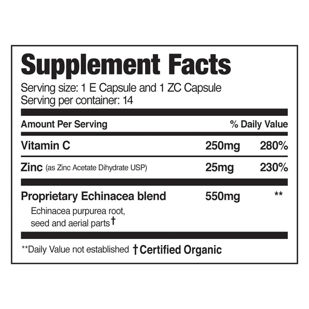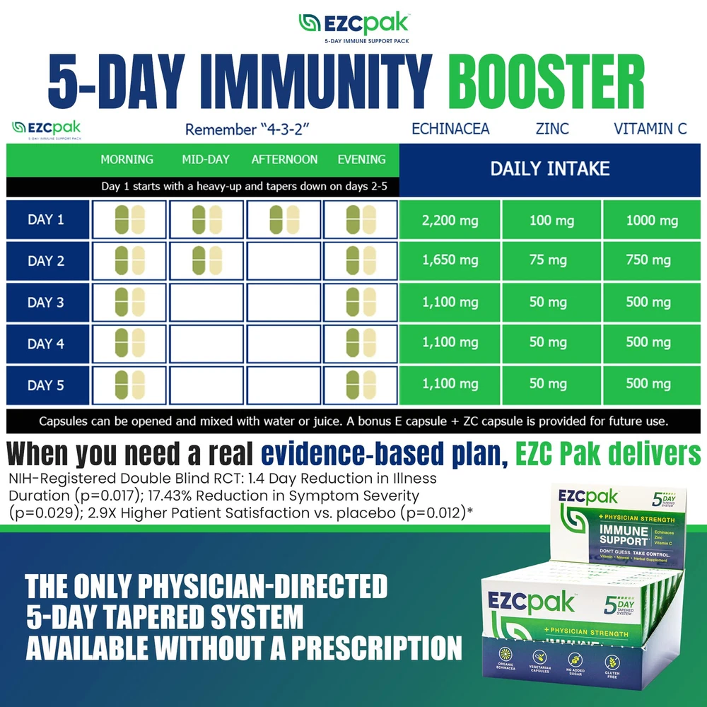PHYSICIAN FORMULATED: Our 5-day tapered immune support system is designed to boost your body's normal immune defense system and reduce antibiotic misuse. Formulated with high strength doses of certified organic Echinacea, Zinc, & Vitamin C provide an immunity boost and tapered over 5 days CLINICALLY STUDIED: showed statistically significant reductions in illness duration and symptom severity and enhanced patient satisfaction in an NIH-registered, open access, double-blind study VEGETARIAN, GLUTEN FREE, DIABETIC SAFE: immune system booster supplements are vegetarian & gluten free with no added sugar; Our professional strength immune booster is formulated based upon the best available clinical data in its active ingredients HIGHER INGREDIENT DOSING: contains much higher ingredient dosing than standard immunity vitamins in a bottle; straightforward formulation contains everything you need and nothing you don't REDUCE ANTIBIOTIC MISUSE: was designed out of growing concern for antibiotic misuse. 's physician-directed 5-day system eliminates guesswork. Don't Guess. Take Control.