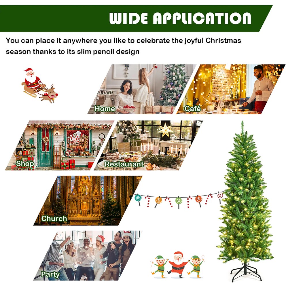 Whether being placed next to the fire place or any corner in your house, our 5ft / 6ft pre-lit Christmas tree will be a perfect decoration. There are 150 warm white LED lights on the Christmas tree, which beautiful like the stars. Thanks for the hinged design, you can assemble and disassemble it easily. Our pencil tree will let you get into such joyful atmosphere and share happiness with your family and friends!Features:Made of 100% new PVC material, which is odorless, non-toxic and flame-retardantComes with a sturdy metal stand to keep the Christmas tree in an upright positionUL-listed LED lights will make the whole night become extremely warmSlim lifelike pencil design takes up less space which is perfect for any cornerHinged design allows you to set up with less effortFantastic Free Shipping Over $49.99* Details 5FT 6FT Artificial Christmas Tree Hinged Fir Pencil Tree with Lights Product Description: Whether being placed next to the fire place or any corner in your house, our 5ft / 6ft pre-lit Christmas tree will be a perfect decoration. There are 150 warm white LED lights on the Christmas tree, which beautiful like the stars. Thanks for the hinged design, you can assemble and disassemble it easily. Our pencil tree will let you get into such joyful atmosphere and share happiness with your family and friends! Features: Made of 100% new PVC material, which is odorless, non-toxic and flame-retardant Comes with a sturdy metal stand to keep the Christmas tree in an upright position UL-listed LED lights will make the whole night become extremely warm Slim lifelike pencil design takes up less space which is perfect for any corner Hinged design allows you to set up with less effort Fantastic decoration which will enchant your family and friends 5Ft Halloween Christmas Tree ColorGreen MaterialPVC, Iron Length5 ft Base Width2.2 ft Net Weight6.5 lbs Number of tips:300 tips Number of LED lights:150 6Ft Halloween Christmas Tree ColorGreen MaterialPVC, Iron Length6 ft Base Width2.3 ft Net Weight11 lbs Number of tips743 tips Number of LED lights250 Package Includes: 1 x Pre-lit Christmas Tree 1 x Metal Stand 1 x Stand