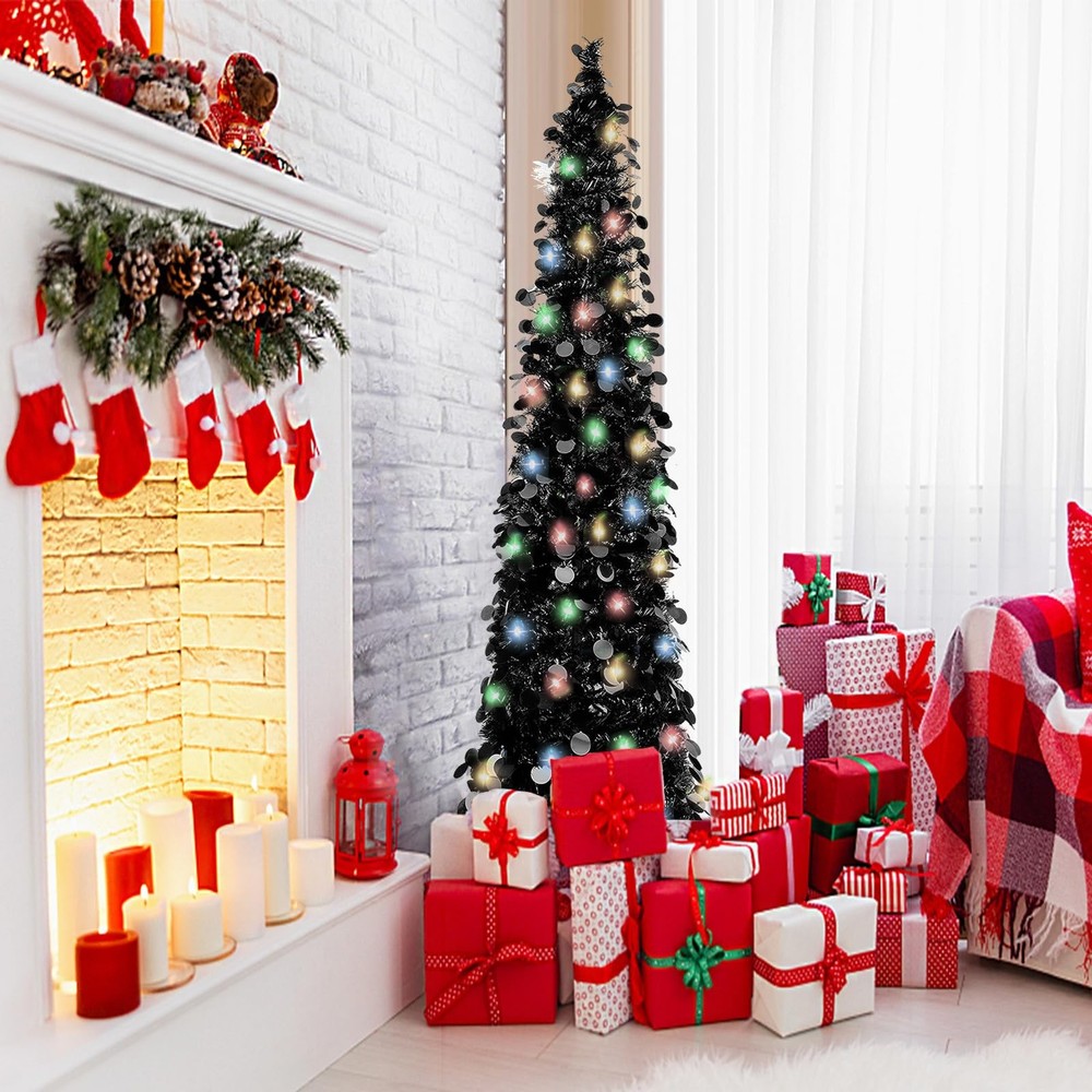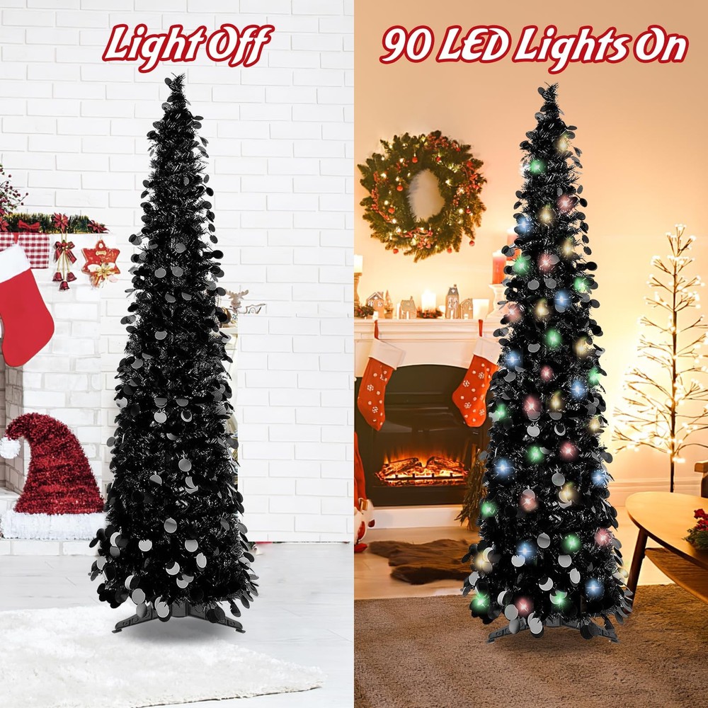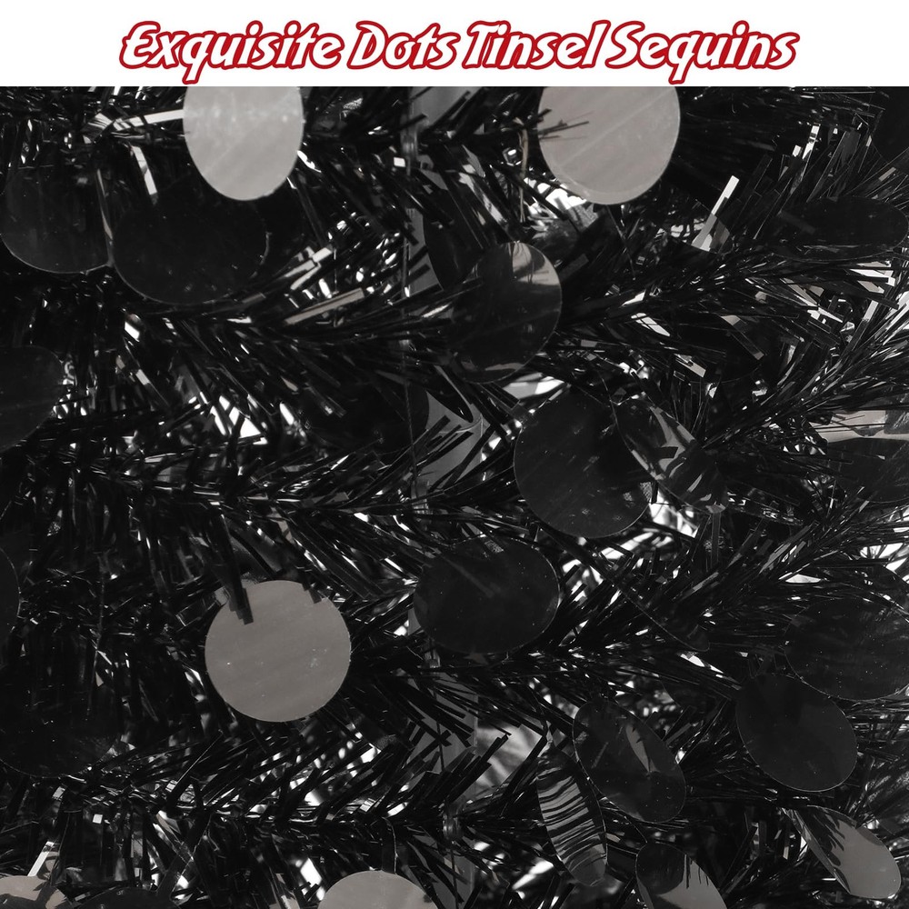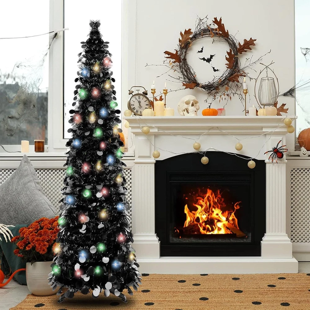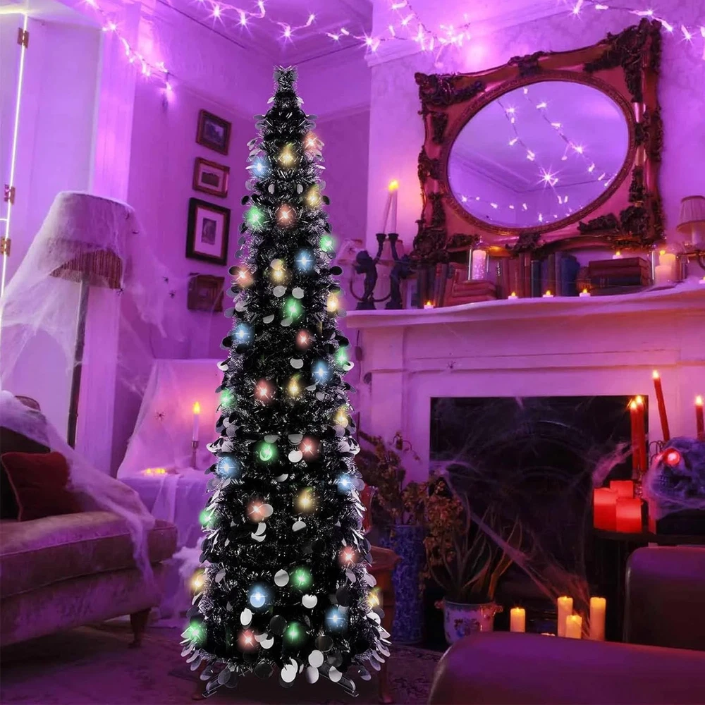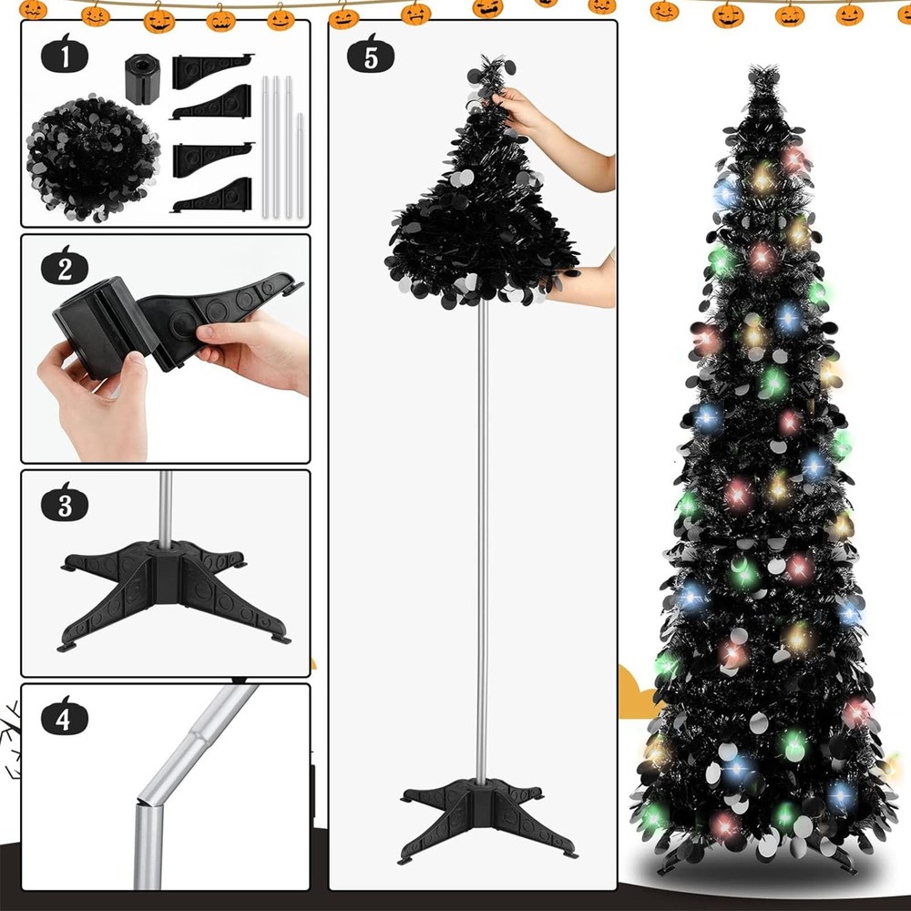 Tinsel Skinny Pop Up Halloween Tree with 50 LED Colorful Light for Home Decorations Durable & Stable Made of high-quality eco-friendly tinsel material, lightweight and durable. Sturdy metal tube with a Four-legged tri-pod stand made of quality thick plastic, it is evenly stressed to improve the stability of the tree. Wide Application Versatile for festivities, events, settings, and arrangements - Decorate it in home, party, office, shopping mall, restaurant, bar, apartment, classroom, school, bedroom, entrance. Use in entryway, near fireplace, front porch, backyard, garden, bedroom, living room, patio, or front desk lobby, enhance the Halloween atmosphere. How To Assemble The Pop Up Halloween Tree 1>Install base - the plastic tripod stand. Putting the base and four plastic feet together. 2>Insert slender metal center pole. 3>Set up tinsel pull-up tree, pull it over the base and pole. 4>Wrap the string of lights on the Halloween Tree. Package Included 1 x Halloween Tree (Need to be DIY assembled) 1 x Installation Instruction 5FT HALLOWEEN TREE : This Halloween tree is designed with tinsel artificial and round shimmering sequins. It is a perfect decoration for your house, home fireplace, stairs, bedroom, living room and porch. Giving you a scary theme for your Halloween celebrations and making your holiday decorating easier than ever PREMIUM MATERIAL: This Christmas tree is made of eco-friendly tinsel material, plump glitter foil sequin is sparkling bling. This tree bracket made out of top quality PVC and metal, and its surface has an anti-rust coating to prevent rust for extra durability, extended service life EASY TO INSTALL & STORAGE: This pop up Halloween tree is easy to install, just take 2 minutes to assemble without tools. First, assemble the trunk frame of the tree, then lift the tree from the head, the tree will unfold, and then put them on the frame and fixed at the top. Collapsible & reusable, when you don’t need to use it, you can fold up the tree and store it in a box PERFECT DECORATE FOR HALLOWEEN: Our Collapsible Halloween tree doesn’t take up very much space as a traditional tree, it is slim and space-saving. You can decorate it in your living room, porch, bedroom, hallways, office, mantel, fireplace, shelf, supermarket, enter way, door, make this Halloween more interesting PERFECT HALLOWEEN GIFTS: This Halloween tree is a perfect gift to your family children and friends. We’re certain you and your children will love it as much as we do. You can hang some Halloween decoration on tree to enhance the Halloween atmosphere, exactly what you need for Halloween Décor With Glitter decorative Sequins on the Tree, which makes it look scary, shiny, sparkling and more festive,great halloween decorations supplies for scary party, doorway, small room, window sill, next to the stairs, balcony, shopping mall etc