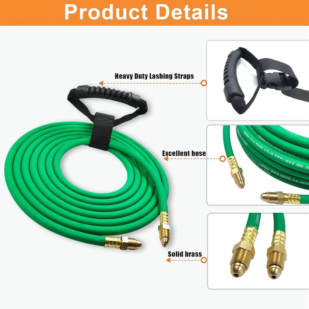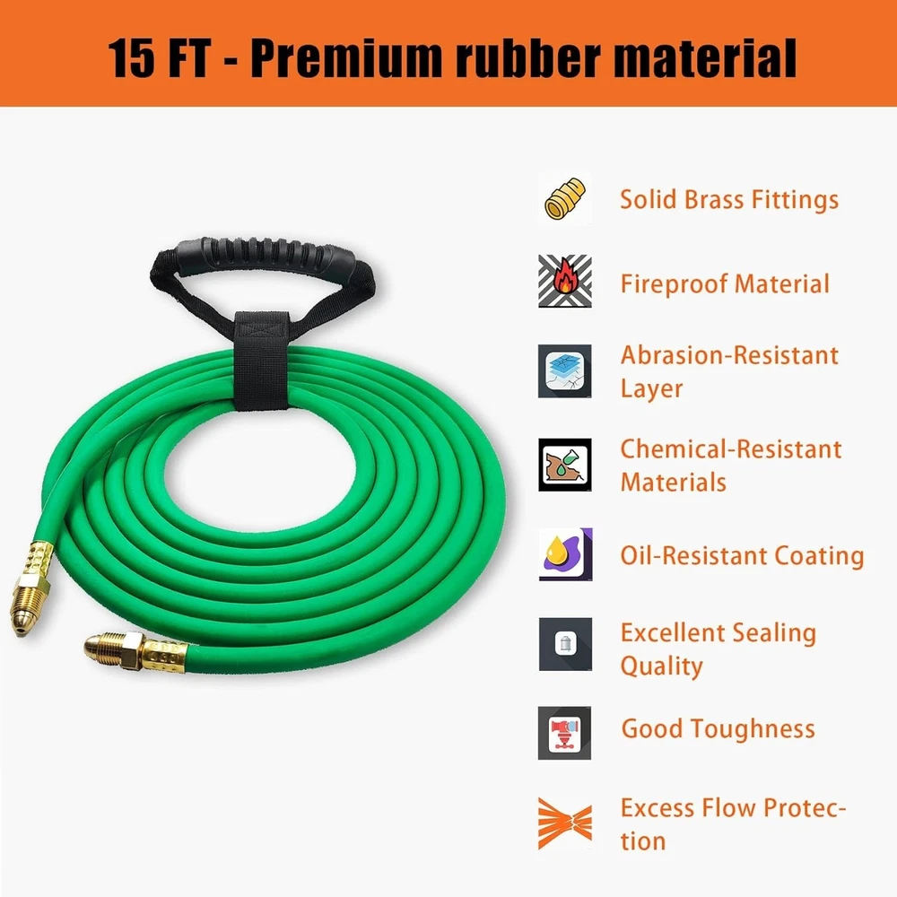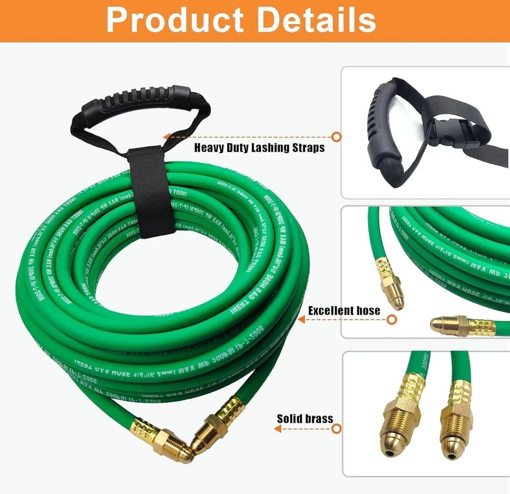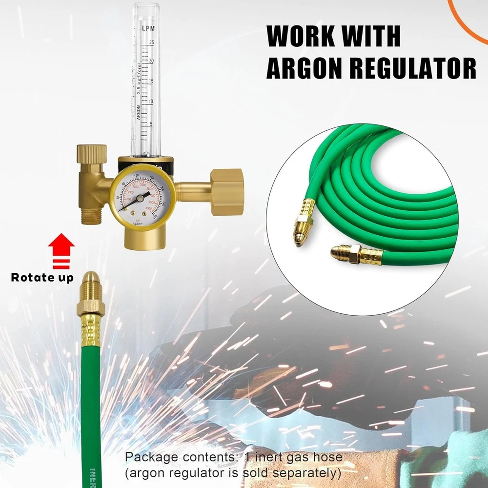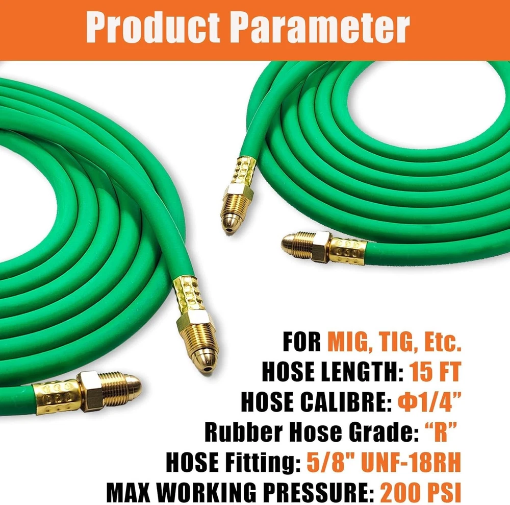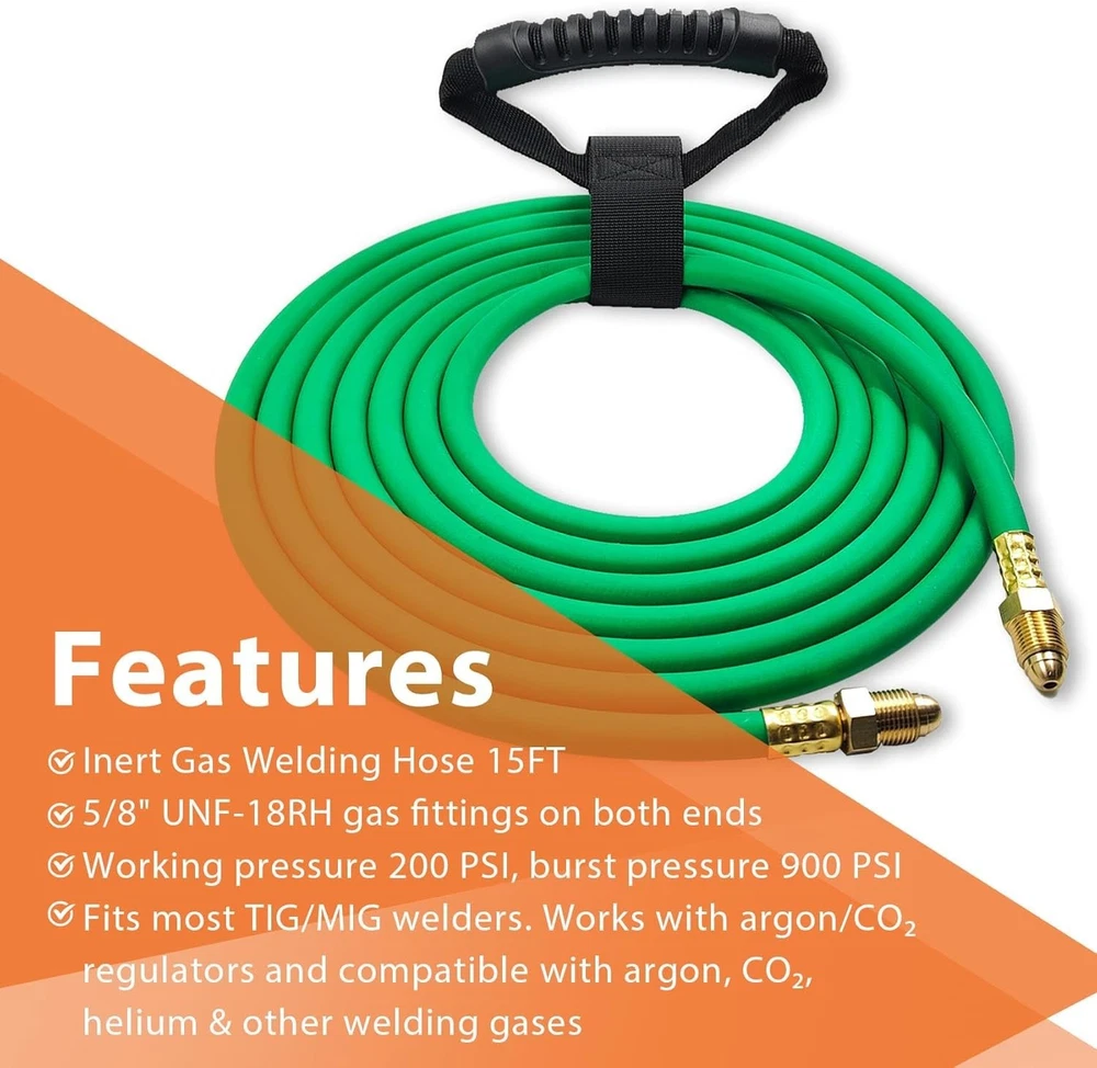 5FT Argon Gas Hose, Inert Gas Welding Hoses for MIG/TIG Welding Regulator,Argon/CO2 Flowmeter Regulator Hose, 5/8" UNF-18RH, NPT Fittings, Welding Accessories for MIG/TIG Welder About this item 【Argon Hose Material & Fittings】5FT Argon hose designed for inert gas welding hose systems, compatible with Miller/Lincoln TIG/MIG welders and argon/CO2/Helium mixtures. Fits standard welding gas hose regulators, flow meters, and welding accessories, ensuring seamless integration with argon regulator setups 【Argon Gas Hose Size & Compatibility】Inert gas welding hose Maximum Working Pressure - 200 PSI makes this gas hose ideal for high-demand welding gas applications. Premium rubber construction resists abrasion, with flame-resistant, oil-resistant, and self-extinguishing properties offers dual-layer protection against harsh welding environments (-40°F to 150°F) 【Argon Welding Hose Pressure Rating】Three-layer explosion-proof design (rubber core + polyester braid + anti-UV outer layer) prevents leaks, paired with 5/8" UNF-18RH fittings for secure connections to argon hose quick connector and argon regulator for TIG/MIG welding 【Argon Gas Hose Features & Protection】5FT argon gas hose suits workshop setups, mobile trucks, or confined spaces, supporting TIG welding, MIG welding.Compatible with argon tank, gas cylinder, and 75/25 argon/CO2 mixtures for versatile gas shielding 【Satisfaction Commitment】We value every customer's voice and are dedicated to addressing all inquiries about our argon gas hose. Whether before purchase (compatibility questions) or after (installation support), reach out to us if you’re less than satisfied—we’re here to ensure your experience aligns with expectations