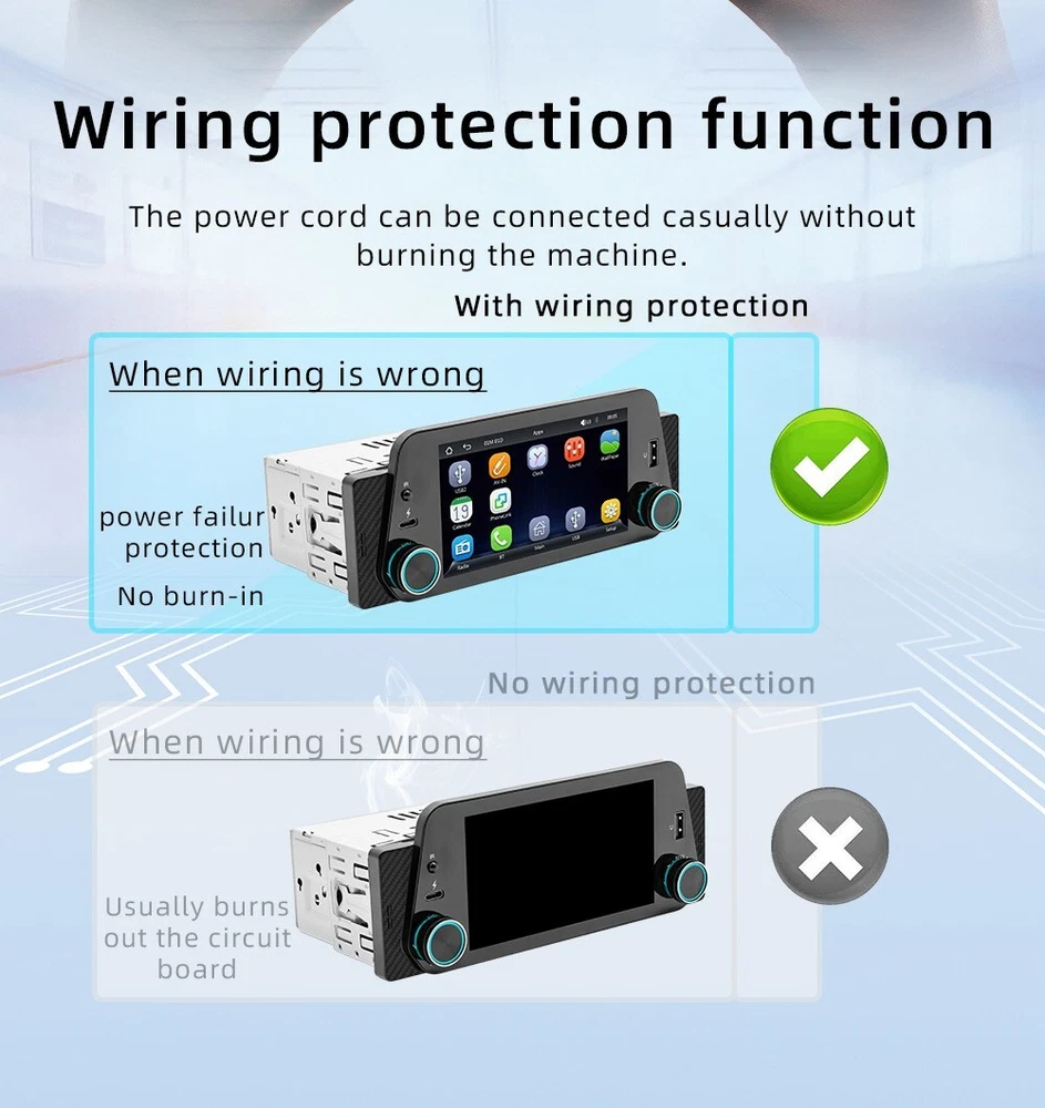 Home Payment Shipping About us Contact us Store Categories Store Categories Other Details Car Radio 1 Din Wireless CarPlay Android Auto Car Stereo 5in Radio Multimedia MP5 Player Bluetooth Handsfree Mirror Link FM Note:Please check size with your car Product selling points: ♦ The wiring protection function directly reduces the customer complaint refund loss by at least 20% for cross-border customers (customers install wiring themselves, and if the positive and negative poles cannot be clearly distinguished, it will normally directly burn out the machine motherboard or fuse, leading to customer complaints of returns or negative reviews. Our latest research and development of this product's power cord can be easily connected N times without burning the machine and fuse until the customer connects it correctly); ♦ High definition reverse video input (camera optional), automatically switches to full screen reverse image when the vehicle is in reverse gear, intelligent assistance for safe reverse; ♦ Mobile car mode, connected to CarPlay or Android Auto, allows your machine to use various functions of the phone; Basic parameters Type: single din System:wide Melis system Software solution: F133 Bluetooth chip: AB5301B Power amplifier chip: CD7388CZ Radio IC: QN8035 Output power: 60Wx4 Working voltage: 10-14.8V Working temperature: -20~60 ℃ Bluetooth version: 5.0 (default name: SWL-BT) CPU: F133 Running memory: 1Gbit DRAM Display resolution: 1280x720 Screen size: 5.0 inches Installation size: 178x50MM Shell size: 188x75MM) Host depth :80MM Functional parameters Mobile internet: support Reverse image: support Video playback warning: support Driving recorder :support (optional recorder) USB interface: USB 2.0 read x2 Audio output: 2 channels (left channel+right channel) Video output: 2 channels External microphone input: support (optional external microphone configuration) Video input: 1 channel Reverse video input :1 channel Language parameters:English, Chinese, Spanish, Portuguese, Russian, German, French, Polish, Türkiye, Arabic, Hebrew, Italian, Czech, Japanese, Korean, Thai Factory Set Password: 113266 Accessories 1. Host 2. Instructions 3. Power cord 4.21 key silicone remote control (accessories, instructions, and packaging may be updated from time to time, subject to actual receipt) Basic functions 1. FM radio 2. Read USB flash drive (audio/video/images) 3. Bluetooth function 4. RCA audio output can be connected to a subwoofer 5. Reverse rearview function 6. Video input and output functions 7. Original car steering wheel learning function 8. Wired mobile phone interconnection wired and wireless Android AUTO/Apple CarPlay 9. Colorful lighting 10. Rear USB 11. Power supply positive and negative pole reverse connection protection function, the wrong connection of the positive and negative poles of the power line will not cause circuit board burning 12. TYPE-C interface charging function Shipping Policy Payment Method Returns Policy Shipping Policy Payment Method Returns Policy Home Payment Shipping About us Contact us Home Payment Shipping About us Contact us Store Categories Store Categories Details Car Radio 1 Din Wireless CarPlay Android Auto Car Stereo 5in Radio Multimedia MP5 Player Bluetooth Handsfree Mirror Link FM Note:Please check size with your car Product selling points: ♦ The wiring protection function directly reduces the customer complaint refund loss by at least 20% for cross-border customers (customers install wiring themselves, and if the positive and negative poles cannot be clearly distinguished, it will normally directly burn out the machine motherboard or fuse, leading to customer complaints of returns or negative reviews. Our latest research and development of this product's power cord can be easily connected N times without burning the machine and fuse until the customer connects it correctly); ♦ High definition reverse video input (camera optional), automatically switches to full screen reverse image when the vehicle is in reverse gear, intelligent assistance for safe reverse; ♦ Mobile car mode, connected to CarPlay or Android Auto, allows your machine to use various functions of the phone; Basic parameters Type: single din System:wide Melis system Software solution: F133 Bluetooth chip: AB5301B Power amplifier chip: CD7388CZ Radio IC: QN8035 Output power: 60Wx4 Working voltage: 10-14.8V Working temperature: -20~60 ℃ Bluetooth version: 5.0 (default name: SWL-BT) CPU: F133 Running memory: 1Gbit DRAM Display resolution: 1280x720 Screen size: 5.0 inches Installation size: 178x50MM Shell size: 188x75MM) Host depth :80MM Functional parameters Mobile internet: support Reverse image: support Video playback warning: support Driving recorder :support (optional recorder) USB interface: USB 2.0 read x2 Audio output: 2 channels (left channel+right channel) Video output: 2 channels External microphone input: support (optional external microphone configuration) Video input: 1 channel Reverse video input :1 channel Language parameters:English, Chinese, Spanish, Portuguese, Russian, German, French, Polish, Türkiye, Arabic, Hebrew, Italian, Czech, Japanese, Korean, Thai Factory Set Password: 113266 Accessories 1. Host 2. Instructions 3. Power cord 4.21 key silicone remote control (accessories, instructions, and packaging may be updated from time to time, subject to actual receipt) Basic functions 1. FM radio 2. Read USB flash drive (audio/video/images) 3. Bluetooth function 4. RCA audio output can be connected to a subwoofer 5. Reverse rearview function 6. Video input and output functions 7. Original car steering wheel learning function 8. Wired mobile phone interconnection wired and wireless Android AUTO/Apple CarPlay 9. Colorful lighting 10. Rear USB 11. Power supply positive and negative pole reverse connection protection function, the wrong connection of the positive and negative poles of the power line will not cause circuit board burning 12. TYPE-C interface char
