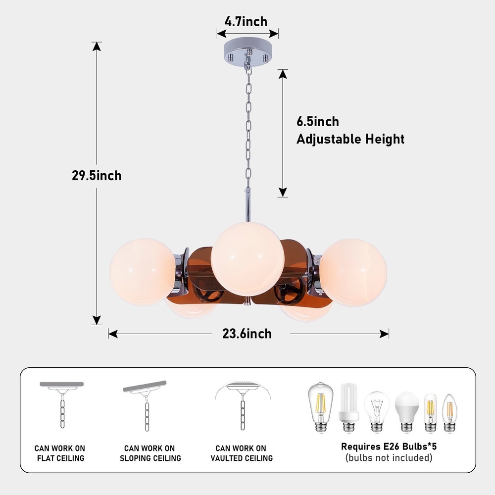 5-Lights Glass Globe Chandelier Vintage Pendant Lamp Semi-Flush Ceiling Fixtures PARAMETER ● Packing Size:22.8"L x 15.8"W x 13.4'"H ● Gross Weight: 9 lb ● Type: VintagePendant Lamp ● Color: Silver ● Material:Metal+Glass+Acrylic ● Base Type: E26 ● Number of light: 5 Lights(Bulbs are not Included) ● Installation method: Hanging pendant light ● Full installation size: Height:75cm/29.5",Width:60cm/23.6" ● Hanging Rod length: 16.5cm/6.5" ● Power Supply: AC Power 110V-220V ● Use For: Living Room/Dining Room/Bed Room/Baby Room/Study Room/Restaurant/Bars/Hallway etc. Payment Delivery details Terms of sales About us Contact us Payment We only accept several paymeny ways as follow: Delivery details Your goods will be shipped within our handling time after your full payment. This excludes these locations: Alaska, Hawaii and Puerto Rico.APO/FPO’s are definitely excluded. Terms of sales Return: We accept return within 30 days,but we are not responsible for human damage.The return shipping cost is the buyer's responsibilities and try to keep it in your original package. About us We are selling all kind of ceiling fan,crystal chandelier,pendant lights in high quality with best discounted price. Our goal is providing all our customers 100% satisfaction and best customer service. Contact us If you have any questions please contact us through "Ask seller a question" link. We will respond within 2 business day or less.