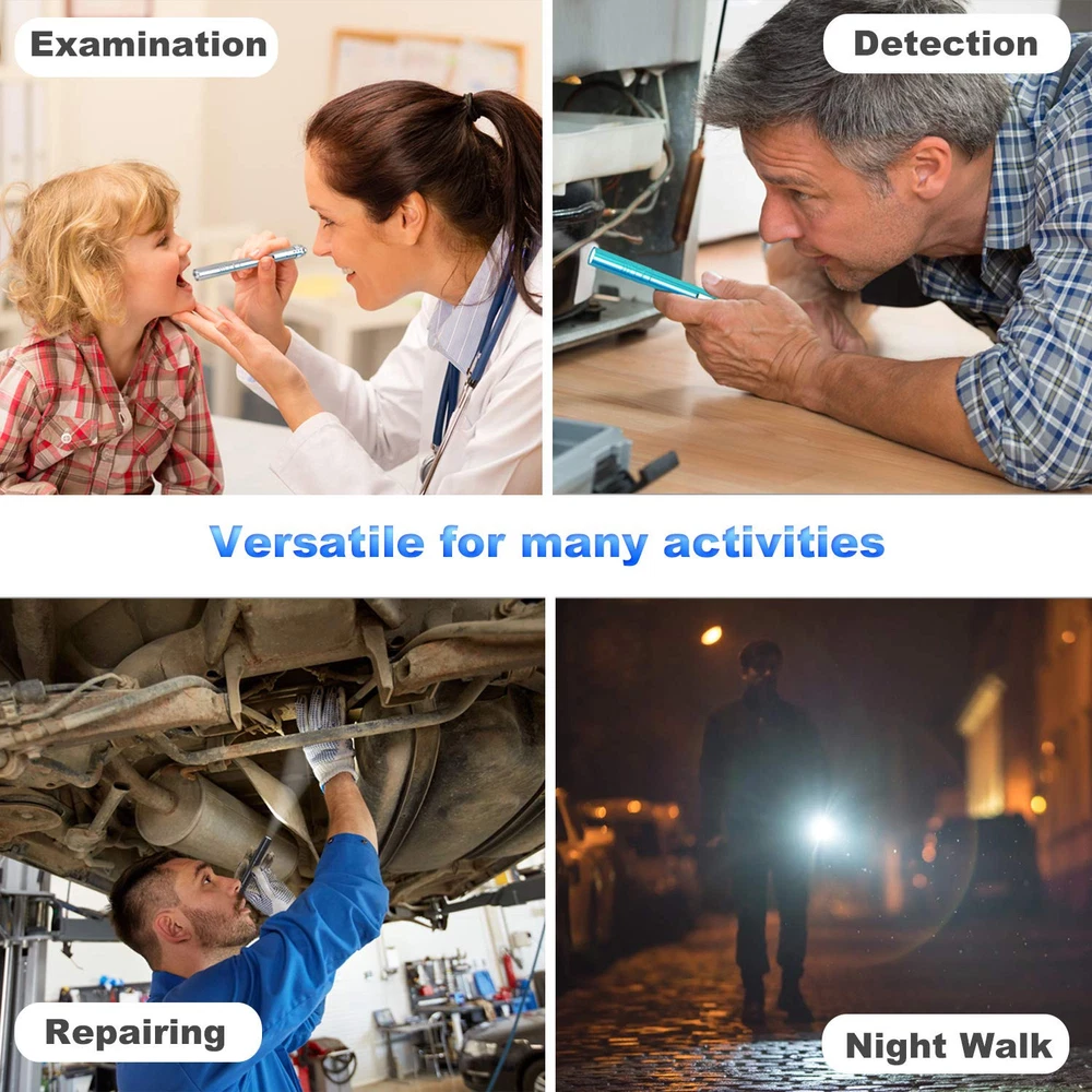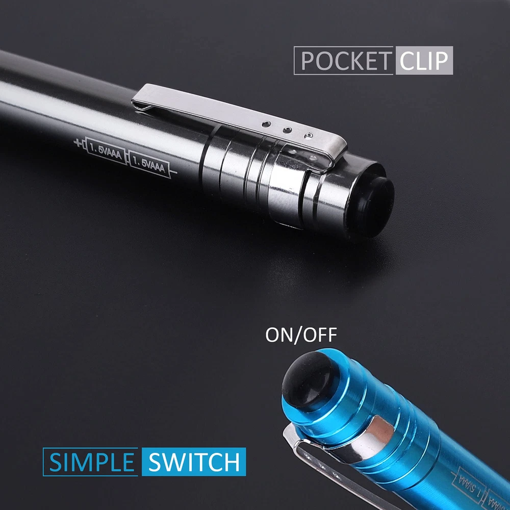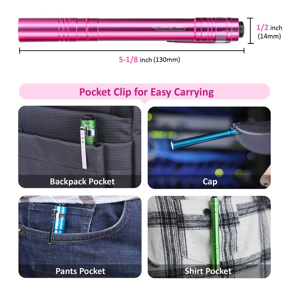 DURABLE CONSTRUCTION: These penlights are made from anodized machined aircraft aluminum, which makes them won't wear out overtime and withstand drops and bumps. QUICK-ACTIVATION BUTTON AND BEND CLIP: The single-mode button on the tail end of the flashlight enables swift on/off functionality,edroom reading, camping, hiking, fishing, nursing, BBQ. BATTERIES INCLUDED: Each flashlight comes with 2 preloaded AAA batteries,which is suitable for . Please remove the red insulated sheet before use. SUPER BRIGHT ILLUMINATION: These flashlights are equipped with a powerful Super Bright LED, delivering an impressive light output of 30 lumens. This makes them perfect for a wide range of activities such as night walking, reading in the bedroom, camping, hiking, fishing, and even BBQ gatherings. LONG-LASTING LED: Never need to replace the LED bulb since it is made to support a super long-lasting life of 100,000 hours.