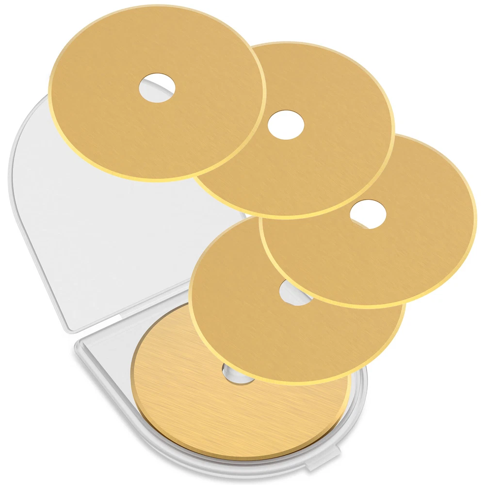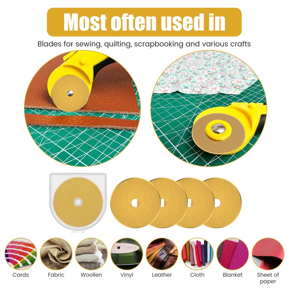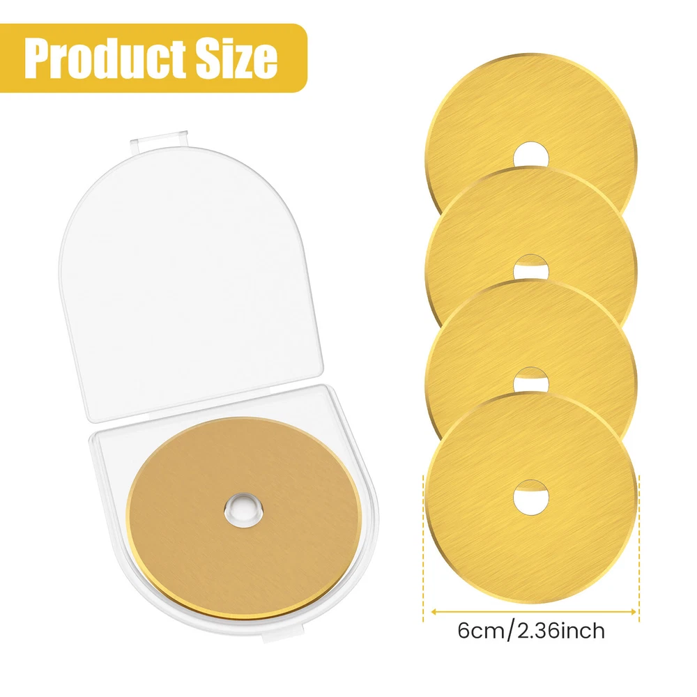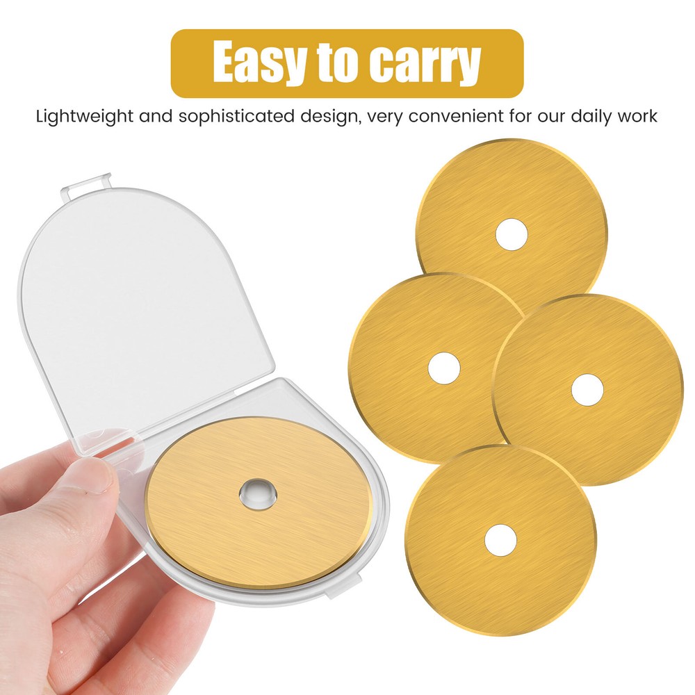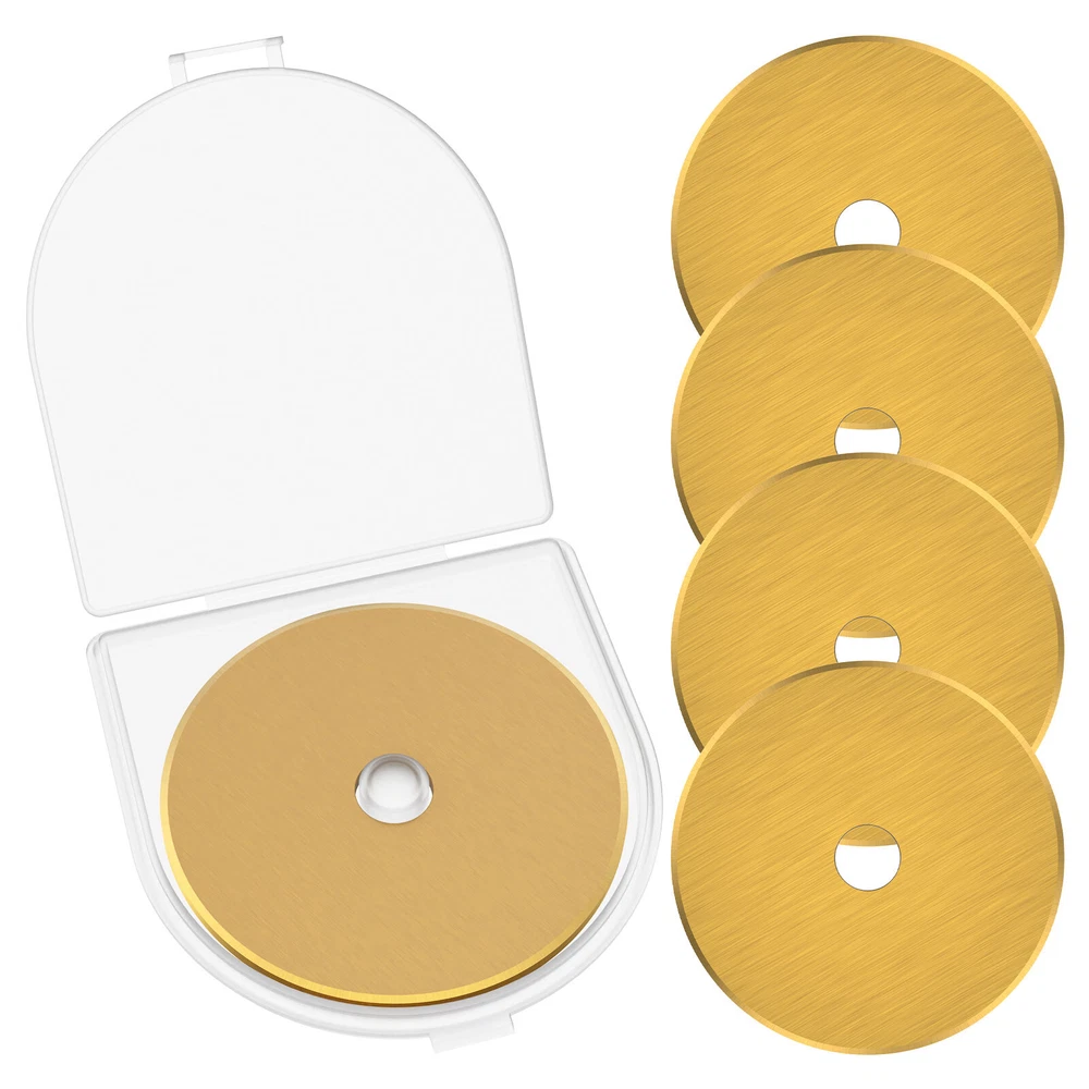 Parts List: 5 x Rotary Cutter Blades Highlight description: Quality Materials: Our rotary cutting blades are made of quality steel (SKS 7), which is strong in construction and not easy to break and damage, ensuring sharpness and long term use Package Contains: Our rotary cutting blade set contains 5pcs 60 mm rotary cutting blades with a storage container for neat storage and quick access Wide Application: These rotary cutting blades are suitable for sewing; quilting; scrapbooking and various crafts. It can cut multiple layers of cards; wool; vinyl; leather; fabrics; felt; paper; etc. at a time Compatibility: This rotary cutting blade is compatible with different 60 mm rotary knives such as for Fiskars; for OLFA; for DAFA; for Martelli; for Drits; for Kisswill; for Havel; for Ultima; etc Easy to Carry: This rotary cutting blade set contains a storage box that makes it easy to carry, lightweight and delicate, very convenient for our daily work Detailed description: Description: Made of premium SKS 7 steel material, these rotary cutter blades are wear resistant and not easy to break for long term use. It can be used for cutting multiple layers of cards, wool, vinyl, leather, fabrics, felt, paper, etc. at a time. Key Feature: Storage Box: This steel rotary cutter blade set is designed with a storage box, which helps keeps the blades in organized and easy to access. Specification: Product Name: Rotary Cutter Blades Material: SKS 7 Steel Color: Gold Size: Diameter: 60mm/2.36 inch Note: 1.There may be slight differences between the picture and the actual color of the commodity. We will try our best to show you the exact color. 2.Please allow slight dimension difference due to manual measurement.