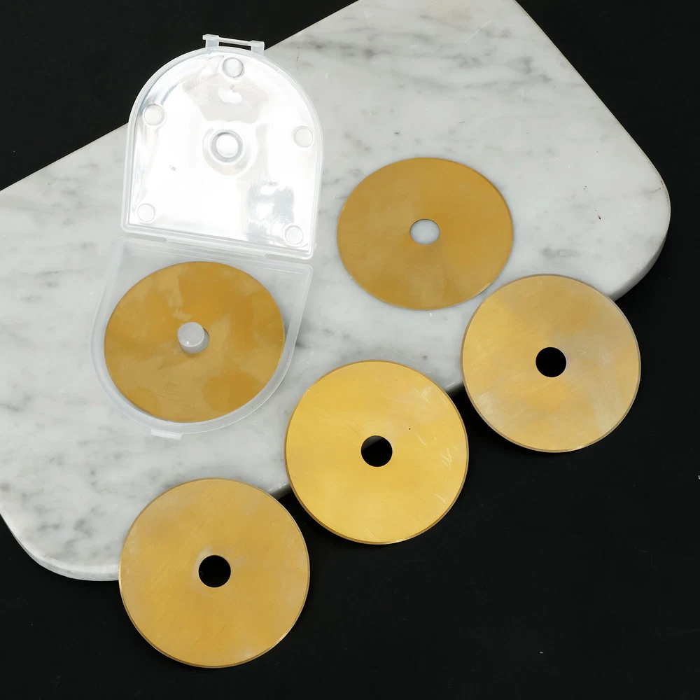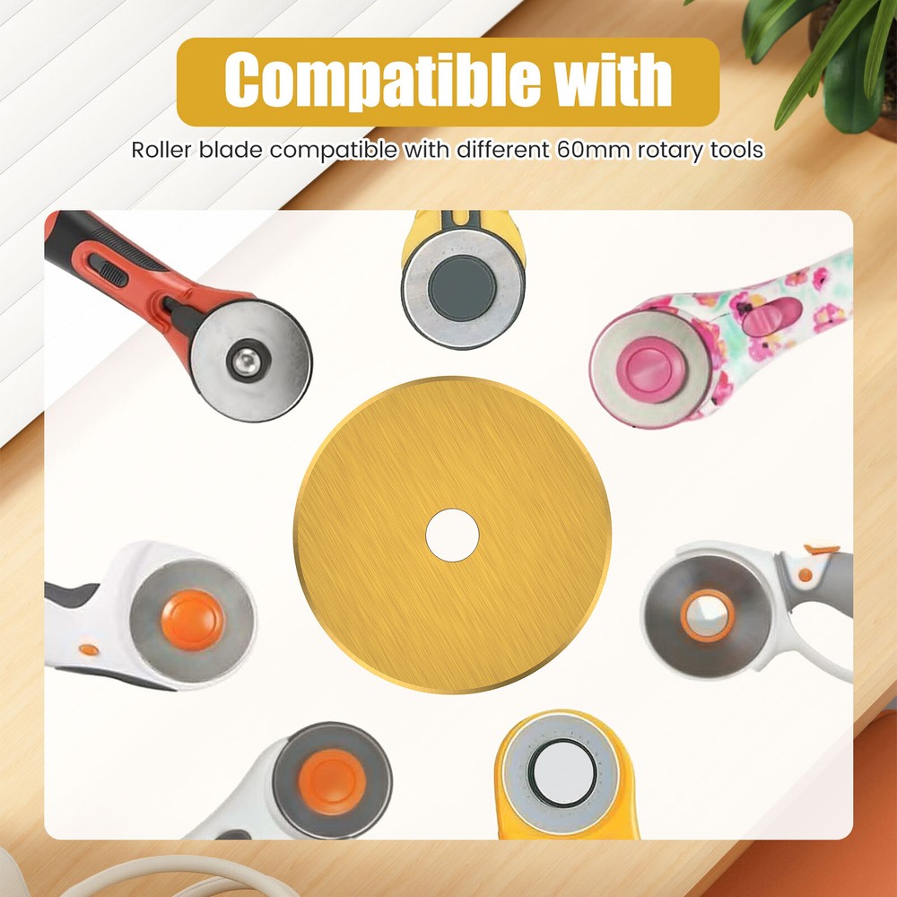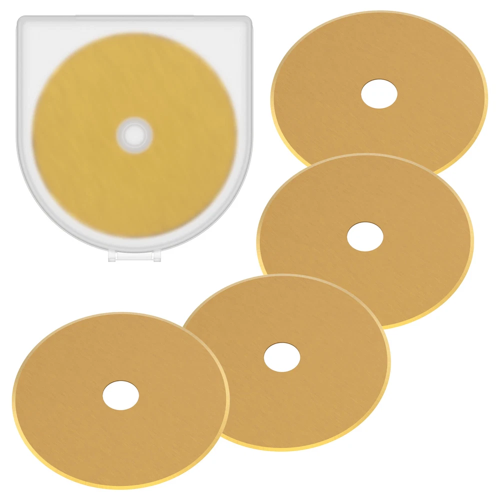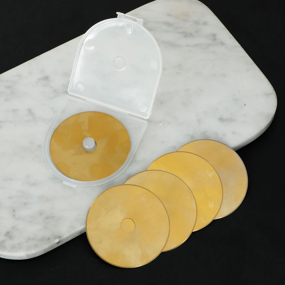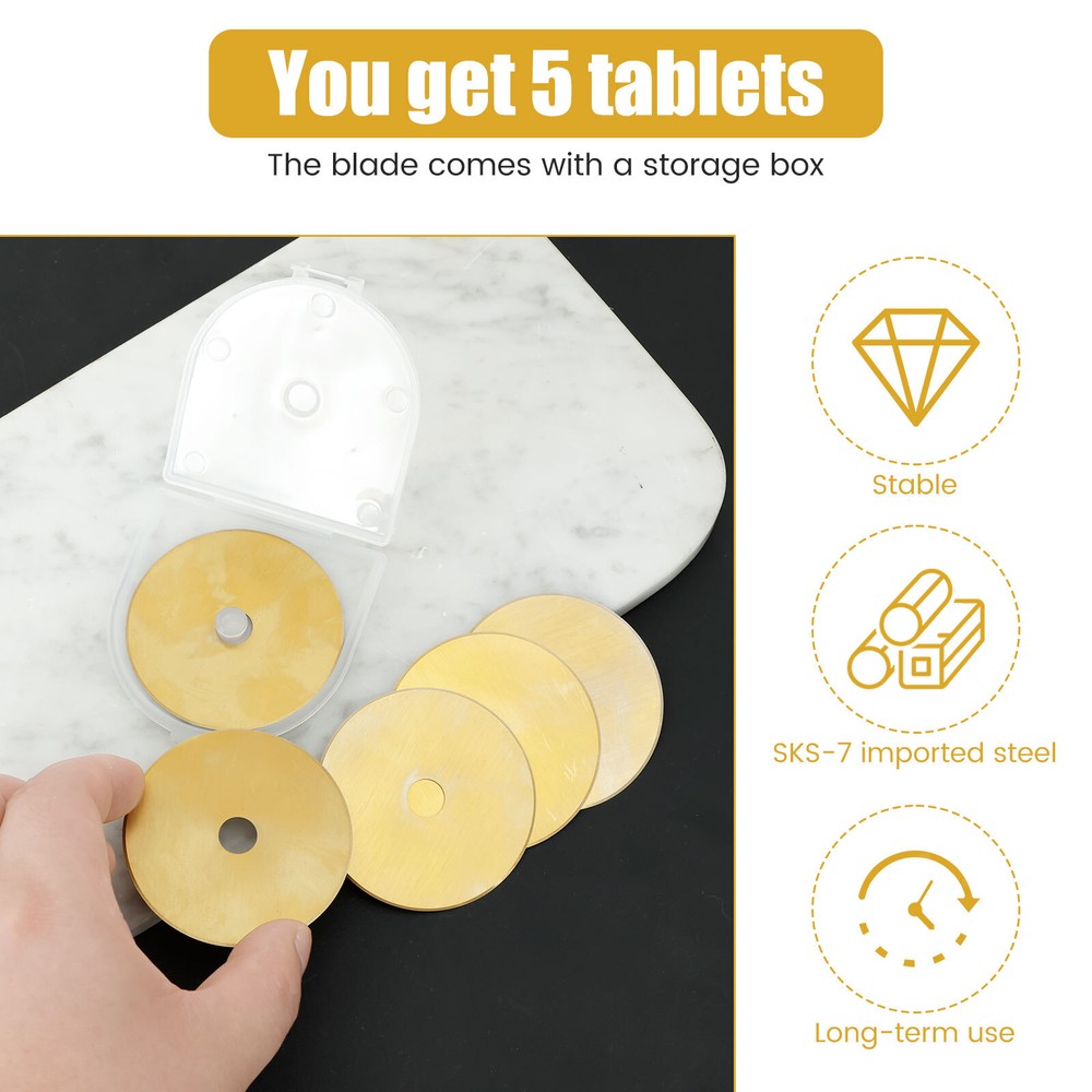 Parts List: 5 x Rotary Cutter Blades Highlight description: Quality Materials: Our rotary cutting blades are made of quality steel (SKS 7), which is strong in construction and not easy to break and damage, ensuring sharpness and long term use Package Contains: Our rotary cutting blade set contains 5pcs 60 mm rotary cutting blades with a storage container for neat storage and quick access Wide Application: These rotary cutting blades are suitable for sewing; quilting; scrapbooking and various crafts. It can cut multiple layers of cards; wool; vinyl; leather; fabrics; felt; paper; etc. at a time Compatibility: This rotary cutting blade is compatible with different 60 mm rotary knives such as for Fiskars; for OLFA; for DAFA; for Martelli; for Drits; for Kisswill; for Havel; for Ultima; etc Easy to Carry: This rotary cutting blade set contains a storage box that makes it easy to carry, lightweight and delicate, very convenient for our daily work Detailed description: Description: Made of premium SKS 7 steel material, these rotary cutter blades are wear resistant and not easy to break for long term use. It can be used for cutting multiple layers of cards, wool, vinyl, leather, fabrics, felt, paper, etc. at a time. Key Feature: Storage Box: This steel rotary cutter blade set is designed with a storage box, which helps keeps the blades in organized and easy to access. Specification: Product Name: Rotary Cutter Blades Material: SKS 7 Steel Color: Gold Size: Diameter: 60mm/2.36 inch Note: 1.There may be slight differences between the picture and the actual color of the commodity. We will try our best to show you the exact color. 2.Please allow slight dimension difference due to manual measurement.
