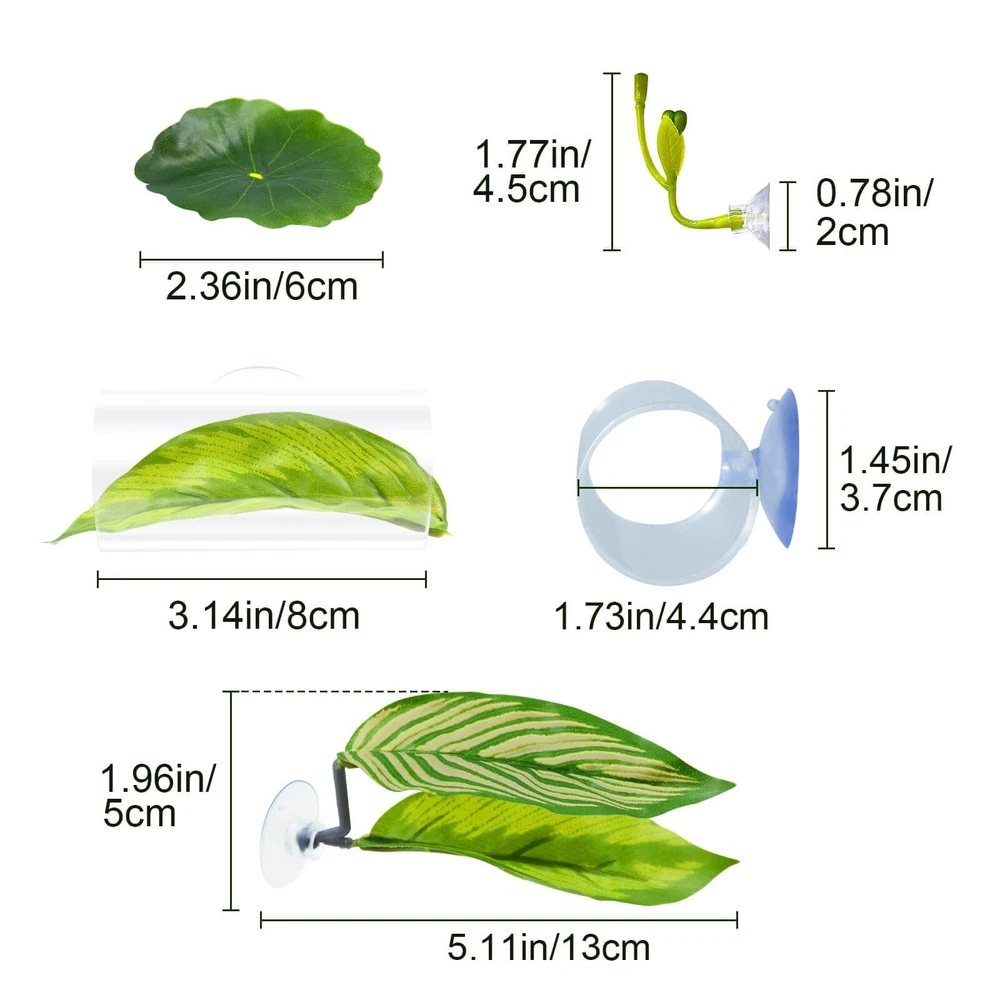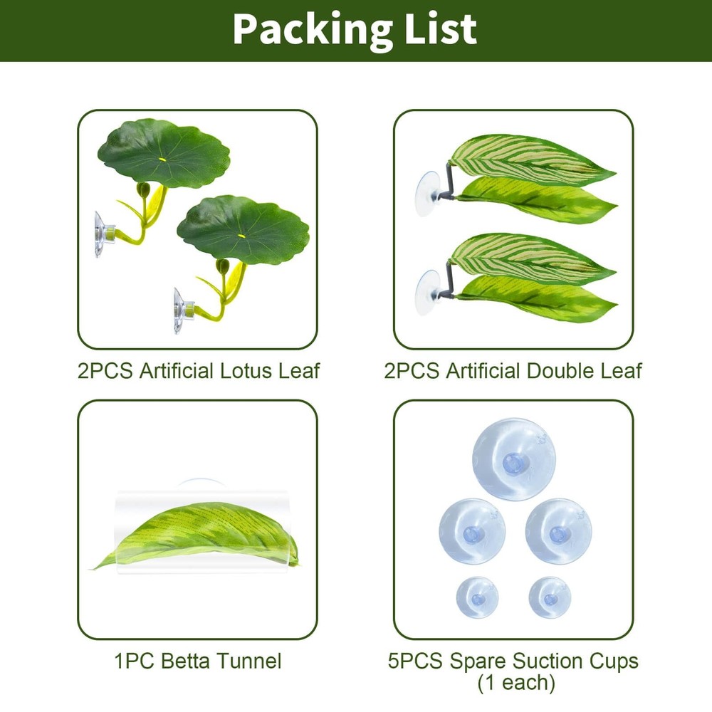 5Pcs Betta Hammock Set, Plastic Adjustable Betta Leaf Hammock with Suction Cup & 5 in 1 Betta Accessories Set: Includes 2 artificial lotus leaves, 2 double-layered leaves, and 1 betta fish tunnel. The leaf simulating the natural habitat for betta, while the transparent tunnel allows for better observation of your fish’s activity. These items also serve as great fish tank decorations and betta fish toys, providing both visual appeal and entertainment for your betta. Premium Materials for Betta Fish: The leaf is made from soft plastic, designed to be gentle on your betta's tail. The acrylic tunnel features smooth, polished edges to minimize risk of harm. These materials are designed for aquariums and do not affect water conditions. Easy to Install & Clean: Installation takes only 15 seconds—simply connect the branches to the suction cups and leaves. The mushroom-shaped suction cups provide a firm grip on your aquarium, which ensures the accessories stay securely in place. The hollow tunnel and detachable leaf design make cleaning effortless—simply rinse with water to maintain their appearance. Compact Design for Aquariums: The artificial lotus leaf measures 1.77 x 2.36 inches, the dual-layer leaf measures 1.96 x 5.11 inches, while the tunnel is 3.14x1.73 inches, making them compact and space-efficient. They provide ample room for your fish to rest and explore without overcrowding the tank. Extra Suction Cups for Extended Use: Each set includes additional suction cups to keep your product securely attached over time. No need to worry about wear and tear—enjoy long-lasting performance and peace of mind. This 5-in-1 Betta Accessories Set includes 2 artificial lotus leaves, 2 double-layered leaves, and 1 Betta fish tunnel, all designed to replicate a Betta’s natural habitat while allowing you to easily observe your fish. The soft plastic leaf is gentle on your Betta’s tail, while the acrylic tunnel features smooth, polished edges to minimize any risk of injury. Made from high-quality materials, these accessories are perfect for use in aquariums without impacting water conditions. Installation is simple with the mushroom-shaped suction cups, which provide a secure hold on your tank. The hollow tunnel and detachable leaf design make cleaning quick and easy—just rinse with water to maintain their appearance. Shipping We offer FREE shipping on all orders! We ship within Three business days of payment, usually sooner. We use a selection of shipping services such as UPS, FedEx, USPS etc. We only ship to the lower 48 states, no APO/FPO addresses or PO Boxes allowed. Local pickups and combined shipping options are not provided at this time. Return You can return a product for up to 30 days from the date you purchased it. Any product you return must be in the same condition you received it and in the original packaging. Please keep the receipt. Payment We accept payment by any of the following methods: PayPal Please pay as soon as possible after winning an auction, as that will allow us to post your item to you sooner! Feedback Customer satisfaction is very important to us. If you have any problem with your order, please contact us and we will do our best to make you satisfied. Contact Us If you have any queries, please contact us via ebay. We usually respond within 24 hours on weekdays. Please visit our eBay store to check out other items for sale! Thank you for shopping at our store.