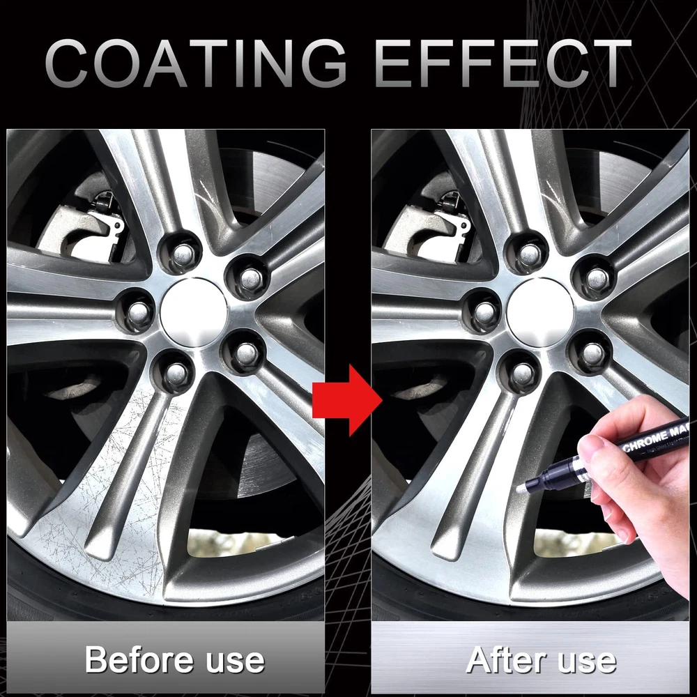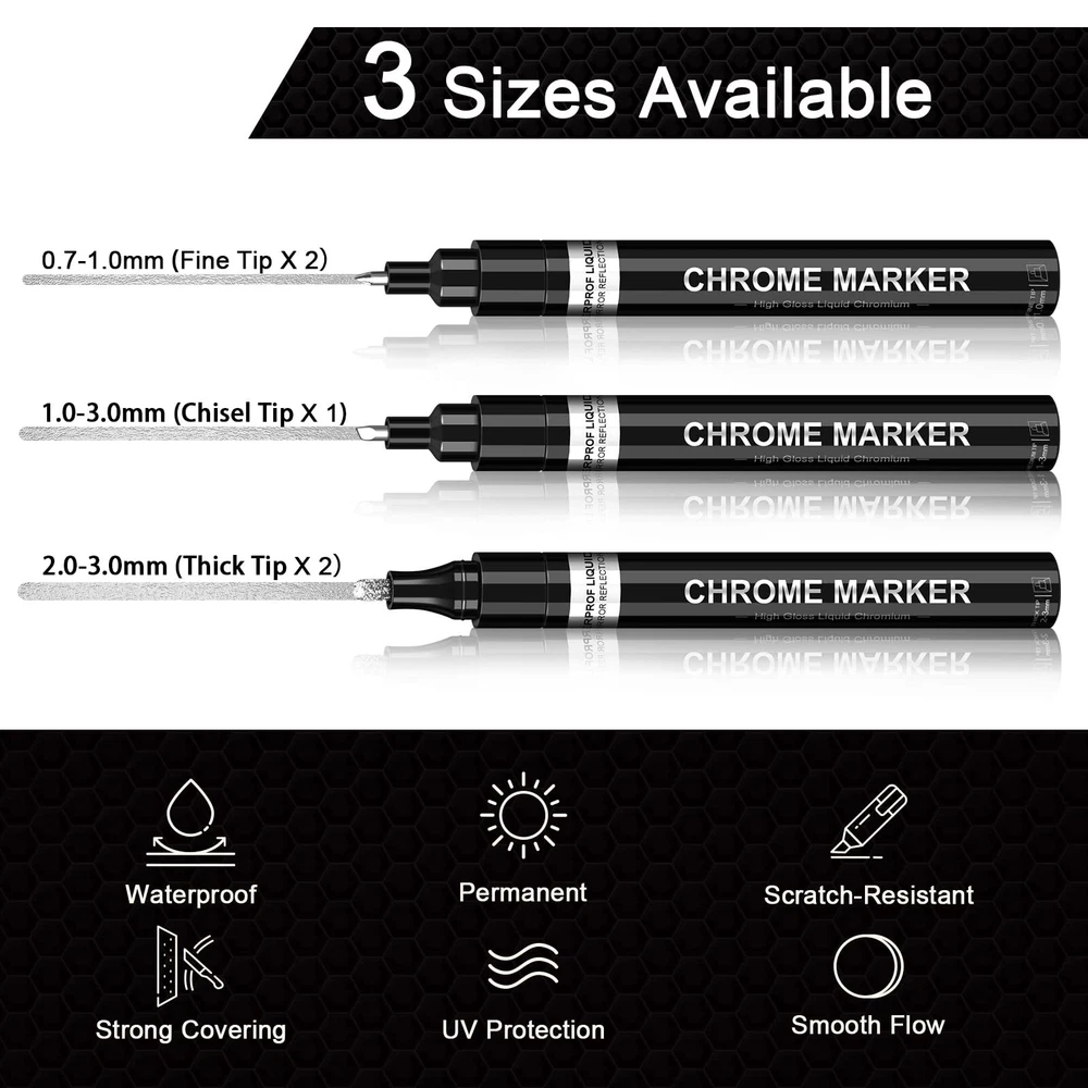 Safe & Durable Ink: Our mirror repair paint pens are made of unique oil-based inks that provide strong coverage. They are non-toxic, low-odor, xylene-free, and meet safety standards, making them safe for children and adults. They also have UV and weather resistance, maintaining a permanent long-lasting mirror effect on the surface of objects for a long time. Additionally, they effectively prevent surface oxidation and provide a protective layer against rust 3 Sizes Tips: The chrome marker set includes 5 silver Pens in 3 sizes to meet your creative needs, 0.7mm & 1mm nylon tip are suitable for Model Tracing or details working, 3mm medium fiber tip is suitable for large area graffiti, covering the unsightly scrape and provided a layer of protection against rust Mirror Chrome Effect: This highly pigmented marker creates a high-gloss real mirror effect in almost all smooth surfaces like plastic and glass. Chrome mirror pens are easier to work with than spray paint, great for DIYers or beginners. Perfect for detailing trim or coloring model cars, and add character to daily creations like illustrations, custom paintings, signature Wide Application: High gloss reflective chrome paint pens can be created on most smooth surfaces (such as plastic, glass, metal, clay, foam, black paper, canvas, gypsum, fiber, crafts and more ). It can be used for rocks painting, Easter plastic eggs, Christmas ball ornaments, wooden sign crafts, ceramic flower pots, photo frames, glasses, mugs, phone cases, shoes DIY, etc. The art chrome markers set is ideal present for beginners, professional artist or graffiti lover Easy to Use: Designed with innovative valve, the ink flows smoothly with no stops, leaks, or bleeding. After completely dry, it will water-resistant, anti-scratch, anti-ultraviolet and longer-lasting display. Shaking WITH THE CAP ON several times make the ink more even before each use. (Warm tips: For maximum luster, Do not touch your painted parts for at least 12 hours, it takes a while to dry and cure)