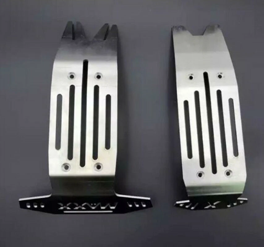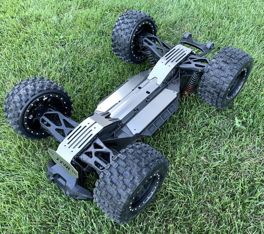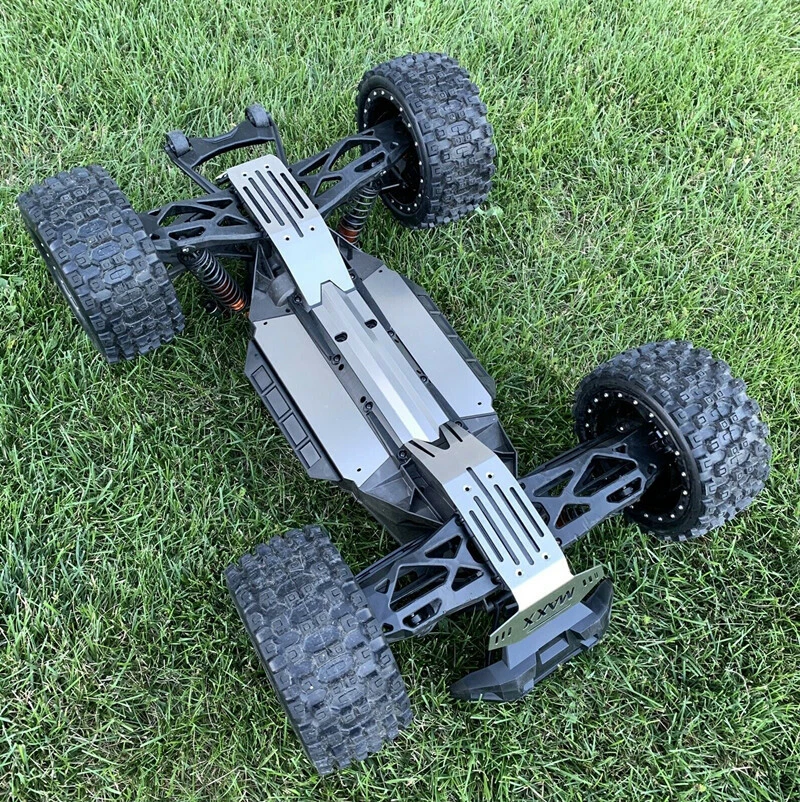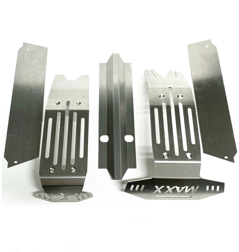 Description: For Traxxas X-Maxx XMAXX Stainless Steel Chassis Armor Complete 5pc Skid Plate Set 5-PC Stainless Steel Set: Provides ultimate protection underneath front & rear differentials, driveshaft, electronics & battery compartments Requires the following hardware (not included): - 4) M3x25 button heads - 8) M4x20 flat counter sink - Double sided tape also required for center section (under driveshaft) and below battery compartments SKU; WYKCHJ005W