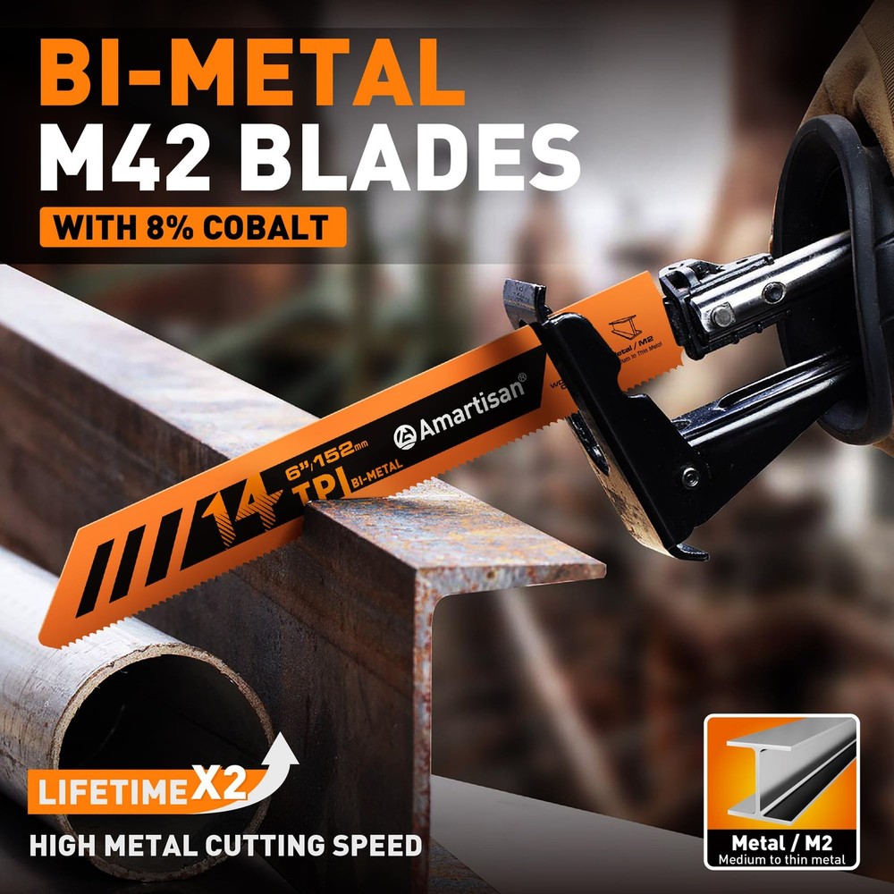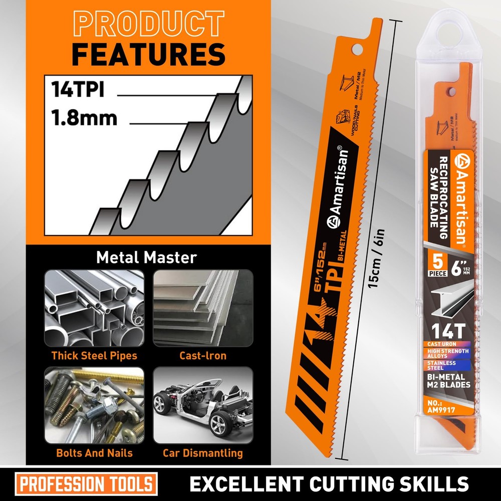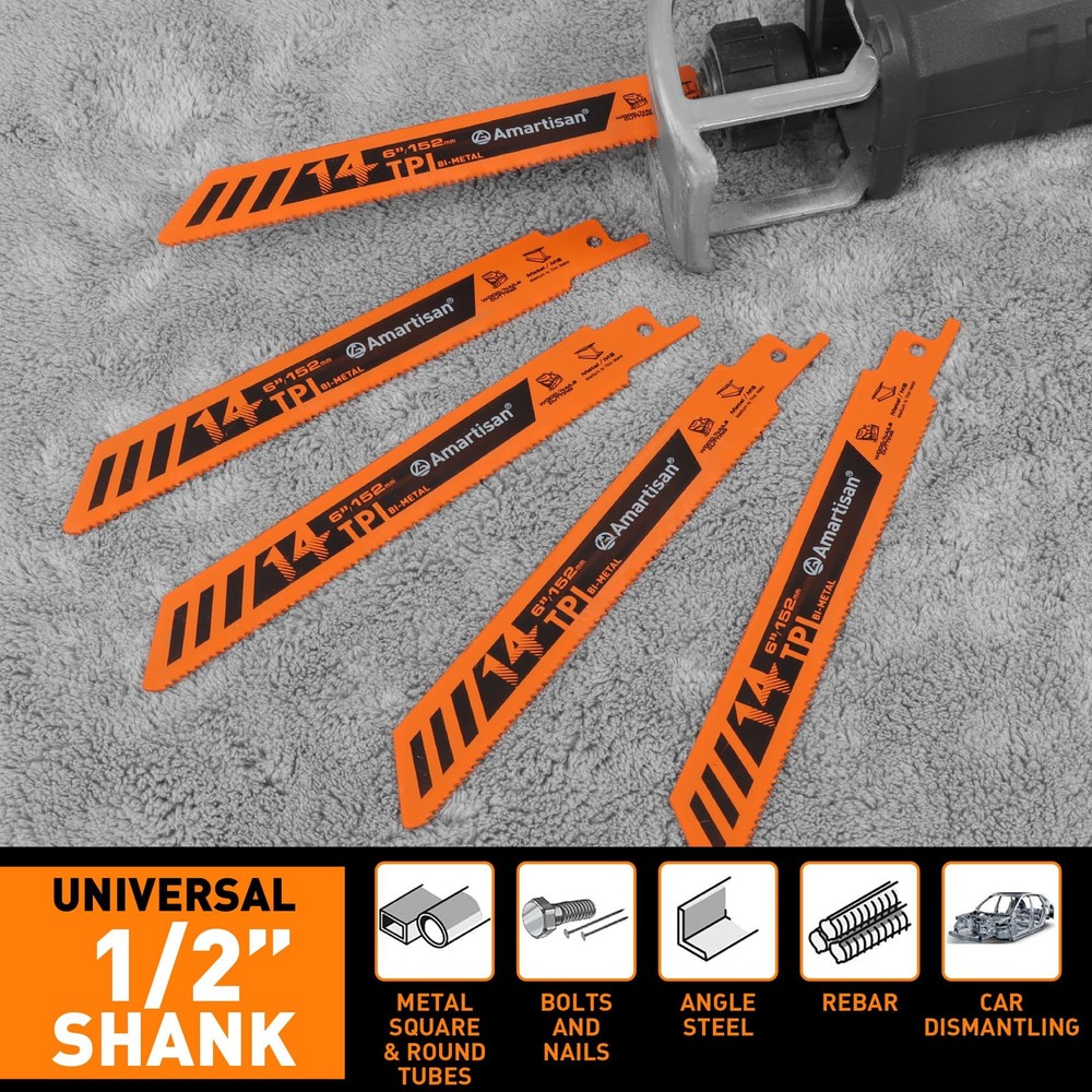 Bi-Metal Reciprocating Saw Blade PRACTICAL SET COMBINATION: It contains 5 pieces of 6-inch 14TPI saw blades, which can meet the needs of multi-scene cutting. There is no need to purchase separately frequently, saving you time and cost. Whether it is professional work or home DIY, it can provide sufficient spare options. HIGH-QUALITY BI-METAL MATERIAL: Made of high-quality bimetal, it has both high hardness and good toughness, excellent heat and wear resistance, can withstand long-term high-intensity cutting, effectively extend service life, and ensure stable cutting performance. EFFICIENT CUTTING PERFORMANCE: 14TPI (number of teeth per inch) design with sharp tooth shape, accurate cutting and fast speed, can easily cope with a variety of materials such as metal sheet, metal pipe, etc, especially suitable for cutting medium-thickness materials, reduce caton and vibration, and improve operating efficiency. WIDELY COMPATIBLE AND ADAPTABLE: It has a universal installation design, compatible with most reciprocating saws and other tools on the market, easy to install and fast to switch, no need to worry about adaptation issues, and make your cutting operation smoother. INTIMATE PACKAGING DESIGN: Equipped with sturdy packaging, easy to and carry, it can effectively protect the saw blade from damage during transportation and storage, ensure that it can be kept in good condition every time it is accessed, and enhance the user experience.