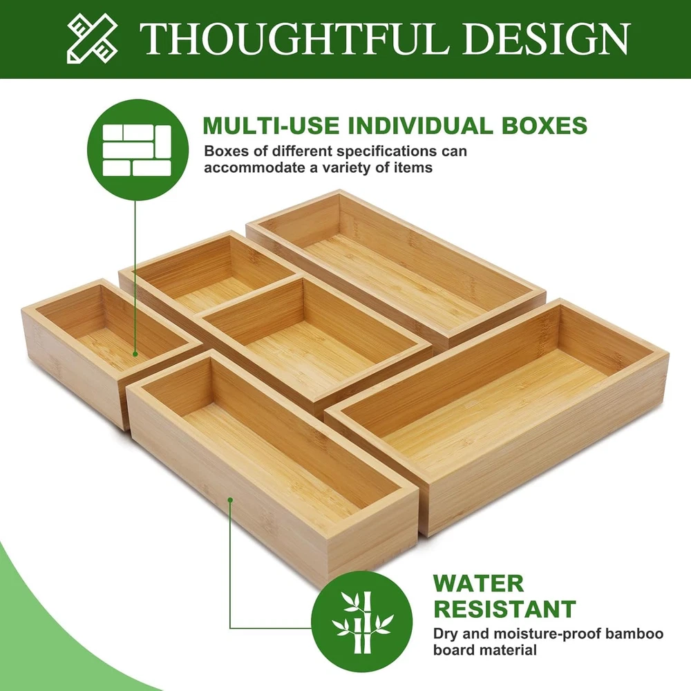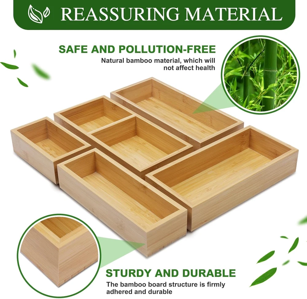 Store New Arrivals Add to Favorite View Feedback Contact Fast deliveries to the customer's home Quality customer service John Make the customers happy! Bamboo Drawer Organizer Set, 5 PCS Multi-Use Individual Wood Storage Organizers, Junk Drawer Divider and Storage Trays Containers for Kitchen, Bathroom, Office Desk, Makeup, Jewelry, Utensils Description Bamboo Storage Boxes Set: These drawer dividers trays are perfect for everyday use with smooth surface and beautiful appearance. Ideal for organizing cosmetics, makeup tools, jewelry, accessories, utensils, cutlery, office supply, craft supplies Different Sizes, Arranged on Demand: A set of junk drawer organizer includes 5 storage bins and fits a variety of drawer in shelf/ closet/ cabinet/ dresser. Includes: 5.7 x 3.5 Inch, 9.2 x 3.2 Inch, 9.8 x 4.5 Inch, 10.4 x 4.5 Inch, 10.4 x 4.7 Inch. Note: Dimensions are manually measured and may have an error within 0.3 inches Individual Design: Bamboo storage organization includes five individual storage boxes. You can use them in the kitchen, bathroom, dresser and other places at the same time. Our storage organizers fit different sizes of drawers, small drawers, standard drawers, and large drawers Sturdy and Resistant: The wooden drawer organizers are made of natural bamboo, which are resistant enough for home organization. The no cover design makes it easy to find what you need quickly, helps you get a neat and organized lifestyle Stackable Storage Organizers: The drawer bins stack into one other to help maximize your space. Easy to clean, just wipe gently with a damp cloth. Do not use the dishwasher to clean Product Description Are you still bothered by a cluttered desktop? Say goodbye to the clutter with our versatile bamboo organizer! Crafted from bamboo, these drawer organizers are not only convenient to use but also versatile, ensuring that your items are easily accessible. This wooden drawer organizer suitable for daily office use, organizing pens and clips. Alternatively, it serves as a bathroom vanity organizer, neatly storing your cosmetics. As a jewelry box, it can store bracelets and rings. As a silverware organizer, it is suitable for kitchen drawers to organize utensils. Stackable & Sturdy Storage Boxes Space saving solution for small space. Different Heights, Different Size Meet your daily needs for different occasions. Natural Bamboo Material Sturdy and resistant, elegant and beautiful. Utilize the bamboo organizer to keep everything organized and accessible. A well-ordered life brings added comfort. Item model number 20230727-00 Unit Count 5.0 Count Batteries Required? No Finish Polished Number of Items 5 Item Package Quantity 1 Part Number 20230727-00 Product Dimensions 15"D x 13"W x 1.9"H Material Bamboo Wood Country of Origin China Specific Uses For Product Cosmetics, Hardware Tools, Jewelry, Stationery Item Weight 2.79 pounds Batteries Included? No Item Weight 127 Kilograms Number of Compartments 6 Special Features Stackable Special Feature Stackable Finish Type Polished Included Components 5 storage boxes ABOUT US We offer the best prices around on high quality products. Our E-store includes media such as books, movies, music and games while offering electronics, toys, sporting apparel, clothing, tools, general home, garden items and more. SHIPPING We are always working hard to ensure your package arrives as soon as possible. Please understand that some factors like weather, high postal traffic, and the performance of shipping companies are outside of our control. We offer free shipping to the lower 48 states and ship within 2 business days of payment, usually sooner. We do not accept P.O. Boxes. Please provide a physical address. For shipping outside of the continental USA, we only use eBay's Global Shipping Program. The item is shipped to KY and then sent to the rest of the world. International customers are responsible for all duties and taxes. Continue to 'check out' to calculate costs for shipping the item to your country. Messages regarding eBay's Global Shipping Program MUST be directed at eBay EXCLUSIVELY. RETURNS We offer a 30-Day Return Policy on items in which you are not completely satisfied with. You have the option of a full-refund or an exchange of the item. No returns are available on items shipped outside of the USA PAYMENT We accept PayPal. CONTACT US This page content is yet to come Please ad us to your favorite seller and visit again later Thank You CUSTOMER SATISFACTION We try our very best to make sure every customer is completely satisfied. If there's a problem, message us! We're happy to help. WE ACCEPT