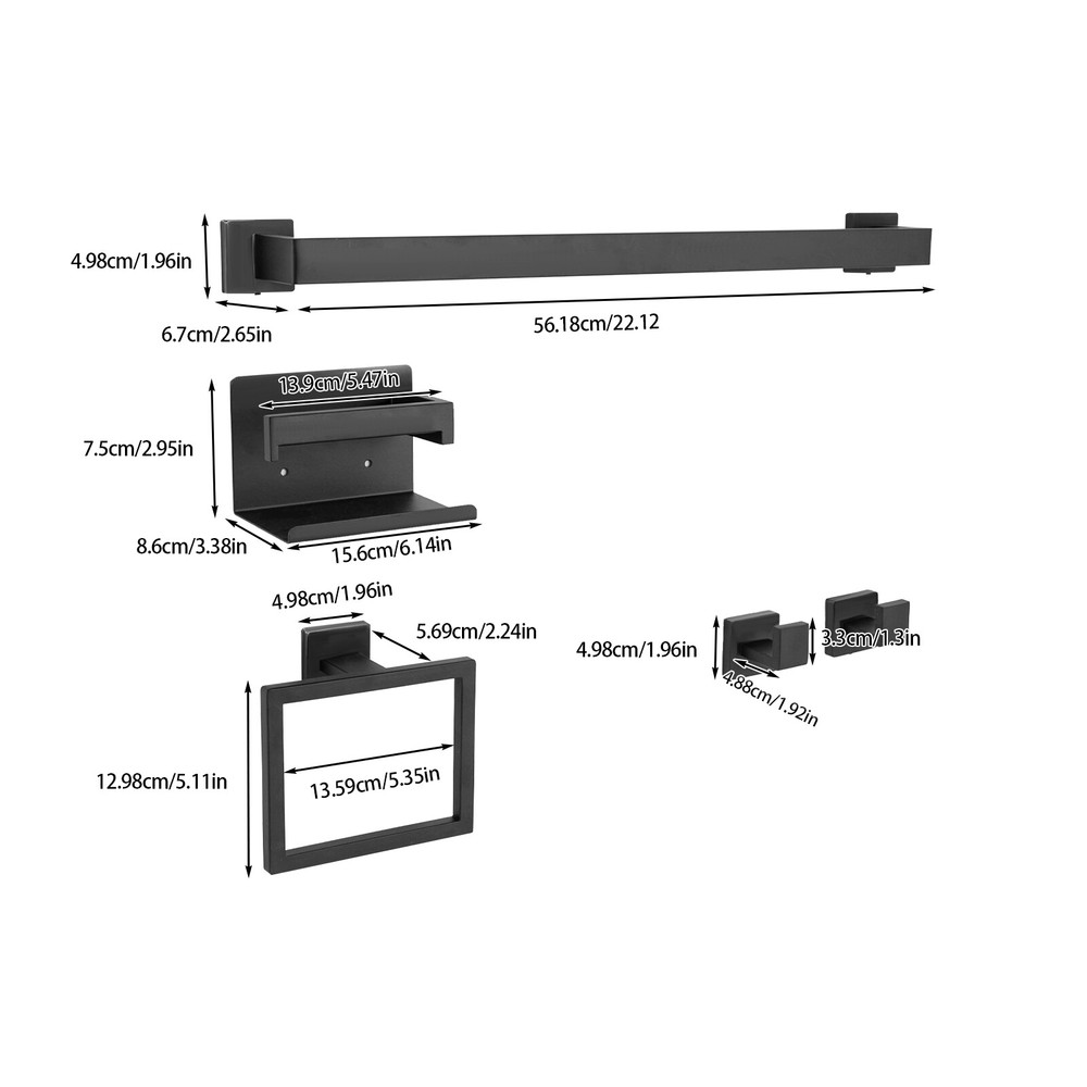 Specification Material: 201 Stainless Steel Color: Black Process: Paint Spraying Style: Modern Installation Required: Yes Number of Items: 5 Mounting Type: Wall Mount Towel Bar Length: 60cm/23.62in Package Size: 64*20.5*11cm/25.2*8.07*4.33in Gross Weight: 1.5kg/3.31lbs Net Weight: 1.2kg/2.65lbs Package Included 1* Towel Bar 1* Towel Ring 1* Toilet Paper Holder 2* Towel Hooks 1* English Installation Diagram Other Accessories for Assembly 5 PCS Bathroom Hardware Accessories Set Towel Bar Set Black Stainless Steel NEW Description Description Our bathroom towel bar set is made of high-quality 201 stainless steel for durability. The product is a five-piece set, which can help you store towels, toilet paper, and other items in the bathroom and fully meet your needs. The simple structure and modern appearance can blend with most home decor styles and add a splash of color to your bathroom decor. It will become your ideal choice. Key Features Made to Last: This product is made of high-quality 201 stainless steel by a paint spraying process, strong and wear-resistant , not easy to corrode and rust, and can be used for a long time without frequent replacement. Complete Set: This set includes 5 pieces of racks, including a towel bar, towel ring, two hooks, and a toilet paper holder with a shelf, which can fully meet your different needs. You don't need to buy them separately, saving your cost and effort. Modern Appearance: The black exterior, simple geometric style, and smooth lines add a touch of modern design to your bathroom and can be better integrated into contemporary home decor. Simple Installation: Simple construction, complete accessories, and a detailed installation diagram allow you to quickly install and experience the joy of installation. Excellent Function: They can be used not only to hang towels and paper but also to hang clothes and organize toiletries, which is functional and space-saving. Effortless Cleaning: It has a smooth surface and a simple structure, so you only need to wipe the dust or residue with a towel. Ideal Gift: With good performance and a modern appearance, it can be used as an ideal housewarming gift for parents, friends, and lovers so that they can also enjoy a more convenient life. Protective Package: To prevent the product from being damaged during transportation, we packed it with a sponge to protect your products to the maximum extent possible. Good Customer Service: We aim to provide quality products and services. If you have problems, please feel free to contact us. We will reply and solve the problem for you as soon as possible. Details Rounded Corners: They prevent you from scratching your hands and skin during installation and use. Pre-drilled Holes: They can facilitate the installation of your product, saving time and effort. Application This product is suitable for the bathroom, kitchen, bedroom, and laundry room. The bathroom towel bar can be used to hang towels and clothes; the hooks can be used to hang bath balls, combs, bathing suits, keys, pants, kitchen utensils, and more. How to Install Clean the wall. Mark the mounting holes with a colored pen (not included). Use a drill (not included) to make holes. Nail the expansion pellets into the holes. Screw on the screw to complete the installation. Specification Material: 201 Stainless Steel Color: Black Process: Paint Spraying Style: Modern Installation Required: Yes Number of Items: 5 Mounting Type: Wall Mount Towel Bar Length: 60cm/23.62in Package Size: 64*20.5*11cm/25.2*8.07*4.33in Gross Weight: 1.5kg/3.31lbs Net Weight: 1.2kg/2.65lbs Package Included 1* Towel Bar 1* Towel Ring 1* Toilet Paper Holder 2* Towel Hooks 1* English Installation Diagram Other Accessories for Assembly Notes Please install this product according to the diagram. Towels, rolls of paper, and other products shown in the pictures are not included in the packaging. Please allow the slight color difference caused by the shooting light and 1-3cm error due to manual measurement, and make sure you do not mind before ordering. Payment Delivery details Terms of sales About us Contact us Payment We accept ebay payment 。 Fees such as import duties, taxes are not included in the item price or shipping costs. These charges are the buyer's responsibility. Delivery details Shipping: 2-9 working days to: USA Terms of sales We maintain high standards of excellence and strive for hundred percent customer satisfaction. Feedback is very important to us. We hope that you contact us immediately before you give neutral or negative feedback, so that we can address your concerns. It is impossible to address issues if we do not know about them! About us Your satis faction is our ultimate goal. We work hard to earn your trust and future business. Our certified technicians have tested each item before shipping. The unit comes with 1 year limited warranty on all manufacturing defects. a) If you receive a defective item, you may return it or ask for a discount. Please contact us within 14 days after you receive the package. b) What you returned must be intact and in its original packaging as re? u. Customer is responsible for shipping costs of the returned item. c) We will cover the cost of shipping back t with the shipping rate indicated in the registration page. We will send you a new unit or refund the full payment you paid. Thank you. Contact us Business Hour Business Hour: Monday To Friday: 8:30 AM to 5:00 PM (Beijing China time) Due to time zones, our reply to your questions may not be immediately. But within above working time, we will reply your email within 24 hours. If it's non-workdays, please kindly be patient and wait till Monday. Please contact us with ebay message. Please feel free to contact us if you have any questions. Monday To Friday: 8:30 AM to 5:00 PM (Beijing China time) Due to time zones, our reply to your questions may not be immediately. But within above working time, we will reply your email within 24 hours. If it's non-workday