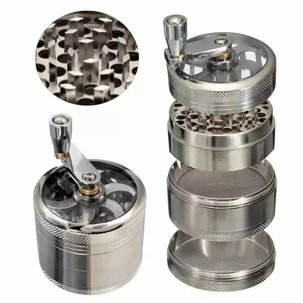 4 PCS Herb Tobacco Grinder Spice Herbal Metal Smoke Crusher Handle Hand Muller 100% brand new and high-quality made. 4 layers made from zinc alloy, solid and durable. Mill handle design makes grind easier. Small size, easily fits into your pockets. Specifications: Dimensions: 40 x 43mm Material: High Grade Zinc Alloy Razor sharp diamond-shaped grinding teeth Steel micro mesh screen to filter pollen Magnetic top enclosure Package Includes: 1x Grinder 1X Dugout Pipe