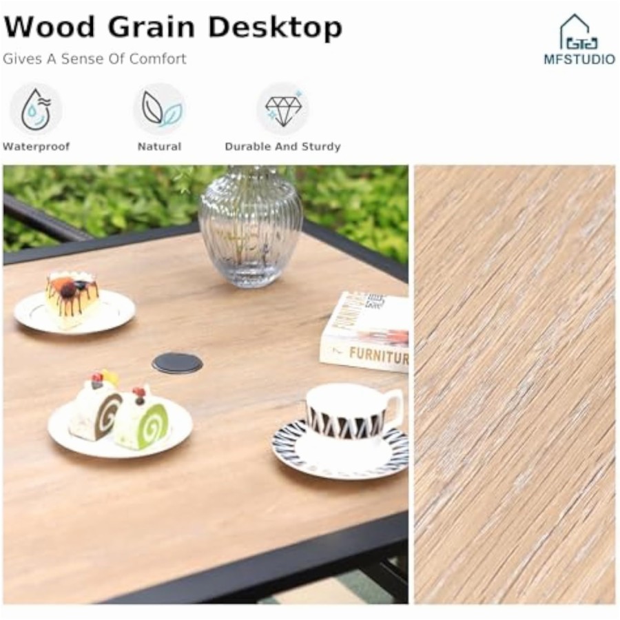 4 Person Patio Table - Heavy-duty elegant black steel frame, with e-coating for weather resistant and longevity, which makes wood-like table needs no special and easy to clean. With umbrella hole (1.57''), the metal dining table is fully capable of bearing the weight of most umbrellas Ergonomic Chairs - Boasting weather and fade resistant rattan, chairs features streamlined backrest, which provides optimal relaxation. Steel frame with crossed bottom construction ensure sturdiness of the dining chair. Detachable Sponge-filled cushion with water-resistant fabric for easy clean and maintain Dimension - Table Size: 37"L x 37"W x 28"H, Diameter of umbrella hole: 1.57". Chair Size: 21.5"D x 22.4"W x 34.5"H, Weight Capacity of each chair: 300 lbs What We Offer - 5 pieces outdoor dining set is easy to install. All necessary accessories and instructions with detailed steps are included. lf you have Any question our experienced customer service team will response in 24 hours..