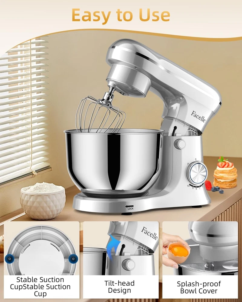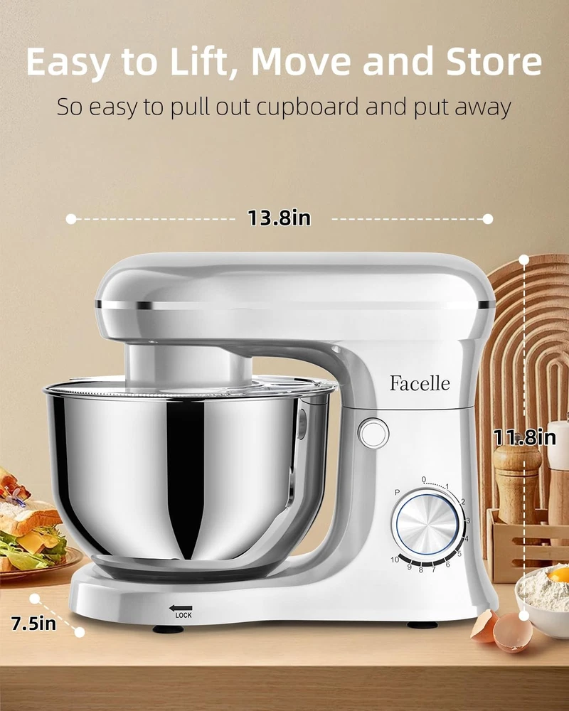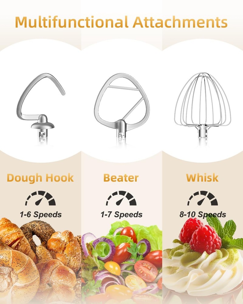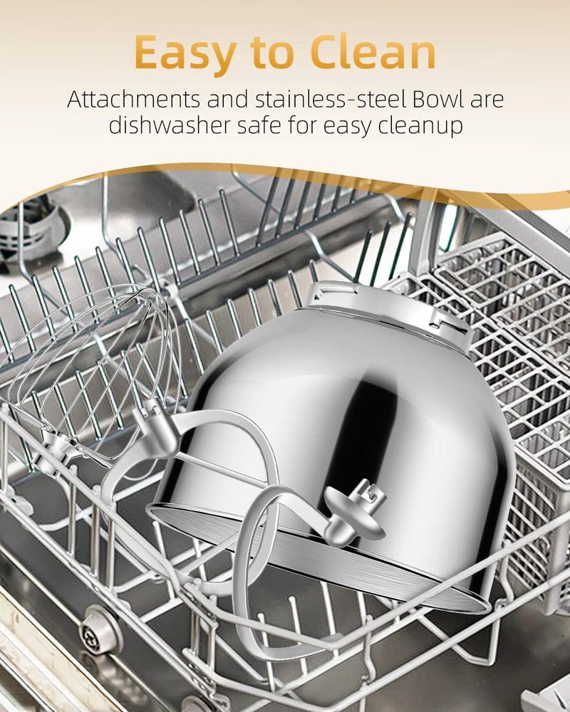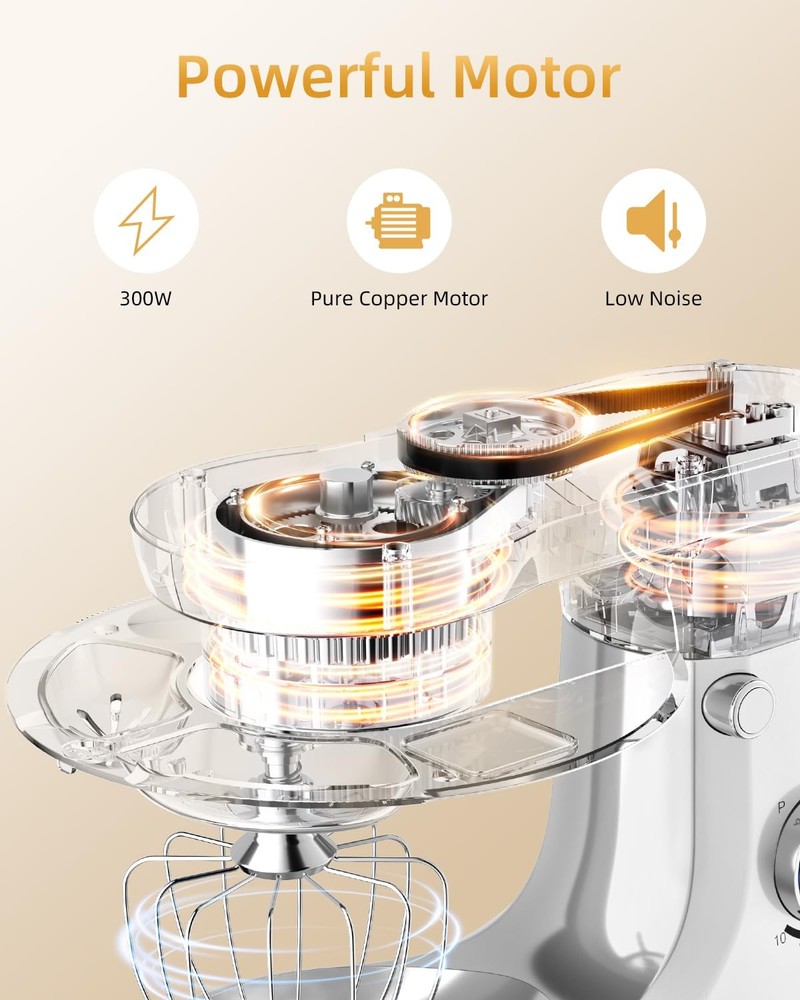 High-Performance Stand Mixer: Your Ultimate Kitchen Companion Mix birthday cake batter, knead brioche dough, whip up meringues and soufflés, bake cookies, mash potatoes, prepare sauces, roll out cinnamon buns, and craft homemade pizzas – that's just the beginning of the culinary versatility you’ll experience with the stand mixer. Designed to handle it all, this kitchen powerhouse combines robust performance, innovative features, and sleek design to make cooking and baking effortless. Unmatched Power and Flexibility 300-Watt Motor: A powerful 100% copper motor and full metal gear system deliver consistent speed and torque, ensuring your stand mixer effortlessly tackles heavy doughs and delicate mixtures alike. Dual-Bowl Design: The innovative 5Qt + 6Qt stainless steel bowls offer unmatched flexibility for your stand mixer. Perfect for both everyday baking and large batches. Thoughtful Design for Seamless Cooking Transparent Pouring Shield: The stand mixer's large chute lets you add ingredients seamlessly while mixing, ensuring a mess-free experience. Lightweight and Portable: At under 8 pounds, this stand mixer is easy to lift and move, blending power with convenience for any kitchen setup. What's Included Attachments: Chef's whisk, flat mixing paddle, and dough hook – everything your stand mixer needs to master every culinary challenge. Dimensions: Compact yet powerful (13" x 11.8" x 7.5"), this stand mixer fits seamlessly on countertops. Warranty: Backed by a 1-year limited warranty, your stand mixer is built to last. Why Choose ? Whether you're a home baker or a seasoned chef, the stand mixer transforms kitchen tasks into effortless adventures. From airy meringues to dense bread dough, this versatile stand mixer delivers professional results every time. Elevate your baking game with a tool designed to grow with your culinary creativity. Greater Control Over Mixing Speed: With a high-efficiency motor and 10-speed slide control, this stand mixer delivers versatile mixing power, from a gentle stir to a rapid whip. Perfect for bakeries or commercial kitchens, its planetary motion ensures that every ingredient is fully incorporated, leaving no batter left in the corners of the bowl. Enjoy perfectly blended mixtures every time Two Bowl Design: The electric stand mixer features a versatile 5 quart + 6 quart bowl design, perfect for both small- and large-batch bakes. Make light work of adding ingredients with the splashguard and large feed tube, which keeps flour from flying all over the place, for mess-free baking fun For Everything You Want To Make: Turn your stand mixer into the culinary center of your kitchen. Come with chef’s whisk, flat mixing paddle, dough hook, you can make everything from birthday cake to bake cookies, bread, frosting, mash potatoes, prepare sauces and more. All removable parts are BPA-free and dishwasher safe, so clean-up is done in a flash Lighter to Move But Still Stable: The suction cup feet stick to solid, smooth surfaces like granite or Corian, ensuring the stand mixer remains firm and sturdy during use, even when handling heavy dough or batter. At under 8 pounds, it’s easy to lift and store in a cabinet when not in use, reducing counter clutter and simplifying countertop cleaning Perfect Holiday Gift & 1-Year Limited Warranty: Whether for a passionate baker or someone just starting their culinary journey, this stand mixer brings the magic of baking to life. Durable, stylish, and practical, it’s the perfect gift for daughters, mothers, or any loved one who enjoys creating in the kitchen. With a 1-year limited warranty and a dedicated 24/7 customer service team, we’re here to support you every step of the way
