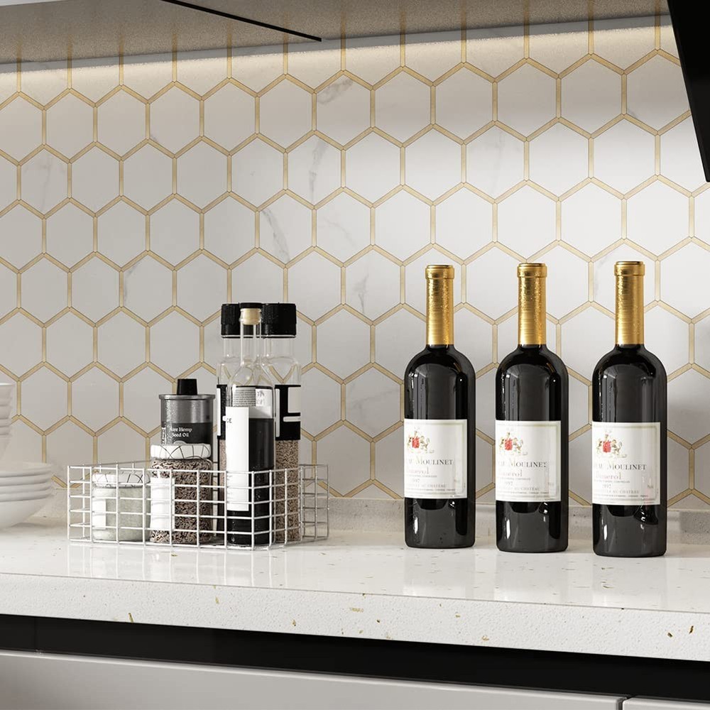 Size: 12-2/5" x 10-4/5" (316x275mm), Thickness: 0.16" (4mm) Just peel and stick, directly stick the tile on wall, save your time and money on labor. Easy for installation. Each backsplash tile sheet has brushed aluminum matted surface and self-adhesive back sticker, no grout.Strong stickiness, will not fall off. Tiles should not directly contact with flames or submerse in water. The tile's surface is resistant to heat and moisture, easy wipe to remove the stains. Please note that The tiles are suitable for installation on very smooth and clean surface, please note that rough surfaces such as orange peel wall, plywood wall, stucco wall, textured ceramic tiles or plywood wall are not suitable to install. We suggest that the tiles should be laid out before installation to get a satisfactory end result. Because its adhesive force is very strong, it's hard to tear them off. PVC peel and stick tiles is available in real wood texture, a variety of choices with today's popular furniture, electrical collocation bringing out the best in each other. Size: 5 sheet/box, 1 sq.ft./sheet, 5 sq.ft./box. Tile size: 12-2/5" x 10-4/5" (316x275mm), Chip size: 3", 4mm thicker design. 1% extra wastage is recommended in every project Easy to Install: Just peel and stick, no glue or grout needed, no mess, save your time and money on labor Strong Adhensive: DIY self-adhesive metal backsplash has strong adhesive and difficult to tear off after attached so please confirm the position carefully Wall Decoration Tile: This hexagon metal mosaic tile is heat-resistant and waterproof, easy to clean. Suitable for kitchen backsplash, fireplace, bathroom wall, laundry room, cabinet, etc Self-adhesive backsplash tiles should not directly contact with flames or submerge in water. Only recommended for clean and smooth surface