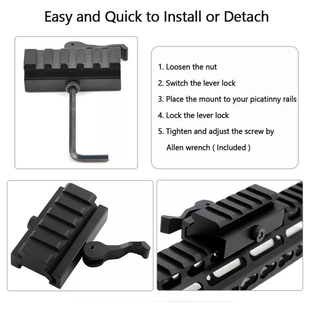 25.4mm/30mm Riflescope Rings Bracket 20mm Picatinny Rail Base Mount Gold 17.99 USD Free shipping Dovetail to Picatinny Rail Adapter Mount w/Low Profile 25.4mm Ring Scope Mount 15.59 USD Free shipping 1 INCH/30mm or 34mm Barrel Scope Ring Mount Adapter 20mm Weaver Picatinny Rail 13.59 USD Free shipping Red Laser Beam Dot Sight Scope/Tri-rail 25.4/30mm Scope Ring Heavy Duty Mount 9.99 USD Free shipping 50-300x 16-14 AWG Solder Seal Sleeve Heat Shrink Butt Wire Connectors Terminals 8.59 USD Free shipping 150Pcs Wire Crimp Terminals Assorted Kit Spade Male Female Car Spade Connectors 8.99 USD Free shipping Extend 11mm to 20mm Picatinny Rail Mount with High Profile 25.4/30mm Ring Mount 16.99 USD Free shipping 12GA 1" Tube Picatinny Light Laser Mount For Mossberg 500 Remington 870 US 8.99 USD Free shipping Tactical Laser Red Lazer Beam Dot Sight Scope w/45 Degree Picatinny 5 Slot Mount 14.99 USD Free shipping High Profile Zero Recoil 25.4mm 30mm Scope Rings Fits 11mm Dovetail Rail Mount 24.99 USD Free shipping Compact Adjustable Red Dot Laser Sight with Quick Release 3 Slot Riser Mount 15.99 USD Free shipping 3-Slot Quick Release Detach QD Riser Block Mount for 20mm Picatinny Weaver Rail 8.99 USD Free shipping 25.4/30 mm High Profile Ring Weaver Picatinny Rail QD Quick Release Scope Mount 9.99 USD Free shipping 4PCS Scope Rings Low Profile Scope Mount 1" Ring for Weaver Picatinny Rail US 12.99 USD Free shipping High Profile 30mm/25.4mm Rings Quick Release Mount with 3 Slot Low Profile Mount 15.99 USD Free shipping 2pcs Scope Mount Rings 25.4MM/30MM High Profile 20mm Picatinny Mount Red 17.09 USD 18.99 USD Free shipping 10% off Tactical 1x 40mm Red Green Dot Sight Scope w/5 Slots Quick Release Detach Mount 27.99 USD Free shipping 5ft Red 1" 25.4mm Heat Shrink Tubing 3:1 Adhesive Glue Dual Wall Marine Tube 11.9 USD Free shipping Quick Release 1/2 Inch Rail Riser Features Raise flat rail line or sight by 1/2 inch 2 1/2 inches (5 Picatinny rail slots) in length with a Picatinny standard rail mount Will accommodate Picatinny or Weaver standard red dots, scopes, and other optics Locks securely in place with quick release lock Easy to install and detach, no tools needed Fit standard 20mm Picatinny rails Durable all metal construction Lightweight, made of aluminum with black anodized matte finish Adjustable locking tension Specifications Dimensions: 1"(height) x 2.5"(length) x 30mm(width) Weight: 81g (2.9oz) Material: Aluminum, Steel Finish: Black Matte Interface: 20mm Picatinny/Weaver Rails Items Included 1/2xMount 1/2xAllen Key