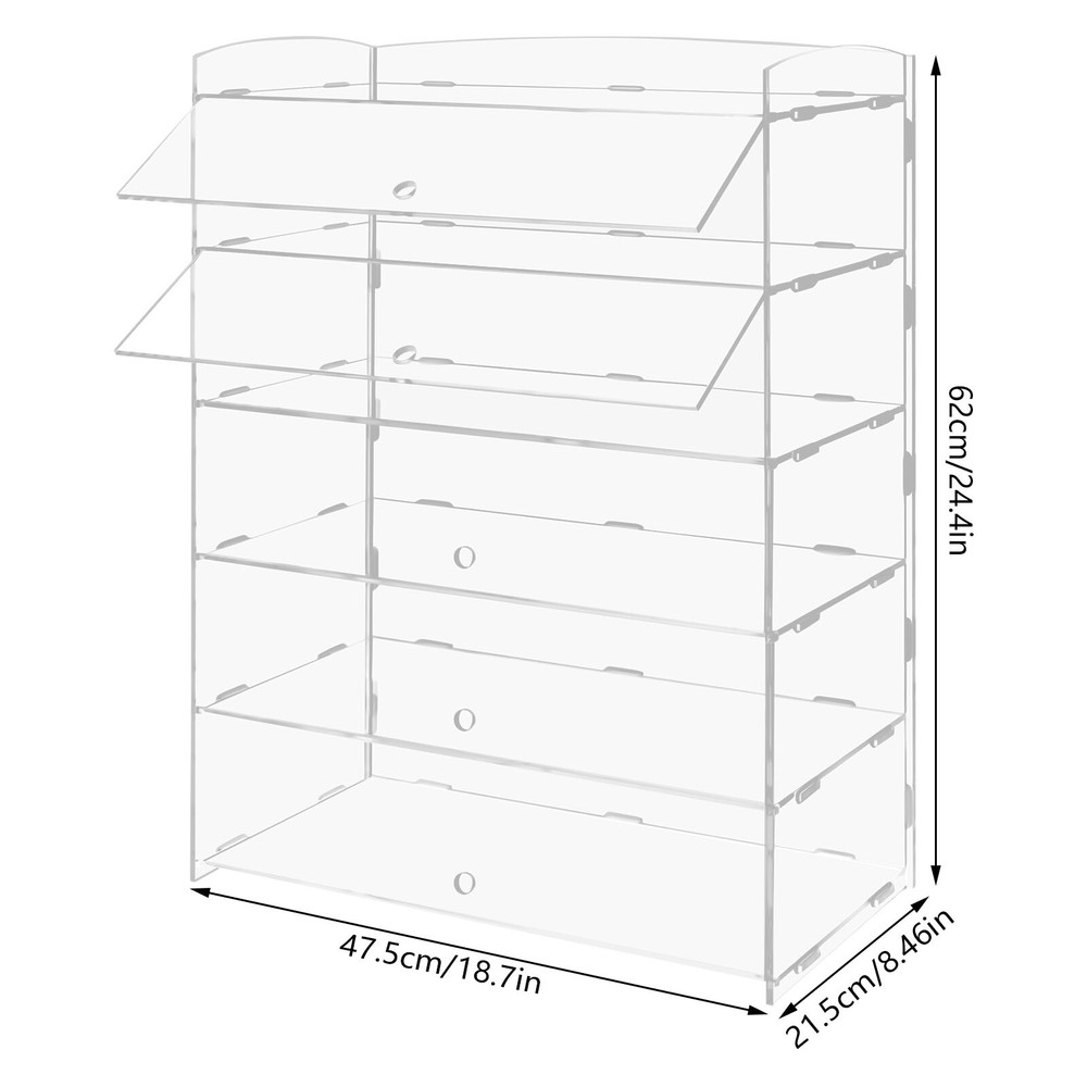 5 Tiers Acrylic Display Case Shelf Dustproof Showcase Holder For Retail Display Description Are you still looking for a storage case with a good display effect? Then you can't miss this 5-tier acrylic display case, which can be used not only for displaying your saleable goods in the mall but also for displaying your collectibles. The sturdy clear acrylic material will make it a practical and stylish solution to your storage needs. Key Features High-quality Material: The premium acrylic with high hardness and rust resistance is less prone to breakage and deformation, ensuring a long service life. 360° Visible : The high-transparency acrylic offers a clear and comprehensive view of the items on display, attracting hungry and potential customers, increasing their interest and engagement, and providing a captivating and informative experience. Neat Storage: This large-size acrylic display case(18.7*8.46*24.4 inches) with 5 tiers and a wide top space helps store cakes, cookies, figurines, coins, candies, cupcakes, etc. in a classified way, making your home or store tidier and bringing you a neat lifestyle. Keep Fresh: This display case with door design and sealed structure is conducive to blocking dust and balancing moisture, thus maintaining the freshness and taste of food to the maximum extent. Easy to Assemble&Disasssemble: Complete accessories, a simple structure, and a detailed installation diagram allow you to quickly complete the installation without drilling. You can easily disassemble and store it without taking up much space when not in use. Effortless Cleaning: The acrylic material, smooth surface, and simple structure allow you simply clean it with a wet cloth or water. Ideal Gift: This product combines practicability and aesthetics in one, making it an ideal gift for your lover, friends, and family on, Christmas, Thanksgiving, and birthdays. Good Customer Service: Communication is the best way to solve problems. If you encounter any problem after purchase, please contact us in time before opening or unpacking the box. We will do our best to solve the problem for you. Details Round Holes: They allow for quick and convenient opening/closing of the doors, providing you or your employees, customers, or guests with a relaxed self-service experience. Smooth Edges: The smooth and burr-free edges won't scratch your hands while improving its beauty. Heightened Guardrail: The heightened guardrails on the top tier can prevent your items from falling off and allow you to hold them for moving this item from one countertop to another. Application It is suitable for storing or displaying cakes, cookies, donuts, candies, cupcakes, pastries, bread doughnuts, hot dogs, fruits, bakeries, buffets, croissants, bagels, muffins, bread, coarse grains, jam cans, etc. in restaurants, delicatessen, convenience stores, gas stations, coffee shops, sandwich shops, grocery stores, homes, bakeries, buffets, parties, offices, and so on. It can be used for home collectors to display figurines, coins, sports memorabilia, weapons, model planes, makeup, and more. Specification Color: Clear Material: Acrylic Process: Cutting Style: Modern Shape: Rectangular Number of Tiers: 5 Number of Items: 1 Assembly Required: Yes Mounting Type: Tabletop, Freestanding Product Size: 47.5*21.5*62cm/18.7*8.46*24.4in Package Size: 66*52*10cm/25.98*20.47*3.94in Gross Weight: 11kg/24.25kg Net Weight: 10kg/22.05 1bs Package Included 1* 5-Tier Acrylic Display Case 1* English Installation Diagram All Accessories for Installation Notes This item is not dishwasher safe. Please tear off the protective film on the product before use. Please allow the slight color difference caused by the shooting light and the 1-3 cm error due to manual measurement, and make sure you do not mind before ordering. Payment Delivery details Terms of sales About us Contact us Payment We accept ebay payment 。 Fees such as import duties, taxes are not included in the item price or shipping costs. These charges are the buyer's responsibility. Delivery details Shipping: 2-9 working days to: USA Terms of sales We maintain high standards of excellence and strive for hundred percent customer satisfaction. Feedback is very important to us. We hope that you contact us immediately before you give neutral or negative feedback, so that we can address your concerns. It is impossible to address issues if we do not know about them! About us Your satis faction is our ultimate goal. We work hard to earn your trust and future business. Our certified technicians have tested each item before shipping. The unit comes with 1 year limited warranty on all manufacturing defects. a) If you receive a defective item, you may return it or ask for a discount. Please contact us within 14 days after you receive the package. b) What you returned must be intact and in its original packaging as re? u. Customer is responsible for shipping costs of the returned item. c) We will cover the cost of shipping back t with the shipping rate indicated in the registration page. We will send you a new unit or refund the full payment you paid. Thank you. Contact us Business Hour Business Hour: Monday To Friday: 8:30 AM to 5:00 PM (Beijing China time) Due to time zones, our reply to your questions may not be immediately. But within above working time, we will reply your email within 24 hours. If it's non-workdays, please kindly be patient and wait till Monday. Please contact us with ebay message. Please feel free to contact us if you have any questions. Monday To Friday: 8:30 AM to 5:00 PM (Beijing China time) Due to time zones, our reply to your questions may not be immediately. But within above working time, we will reply your email within 24 hours. If it's non-workdays, please kindly be patient and wait till Monday. Please contact us with ebay message. Please feel free to contact us if you have any questions. *Festures1 Durable Material,Good quality Manufacturer Warranty 3 Years Country/Region of Manufactur