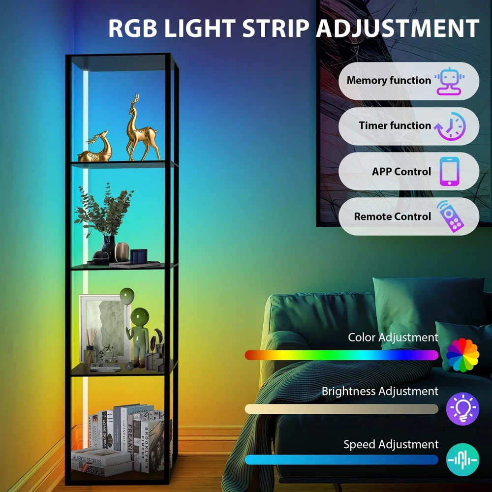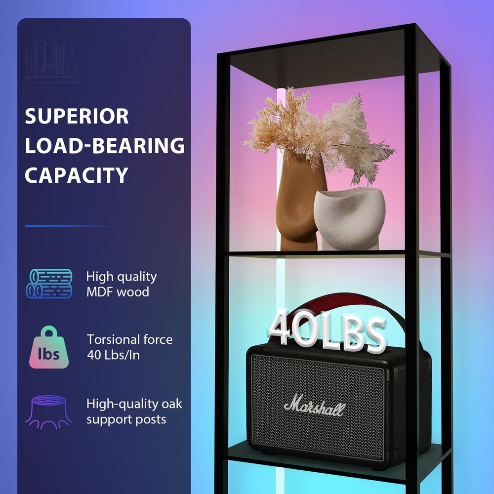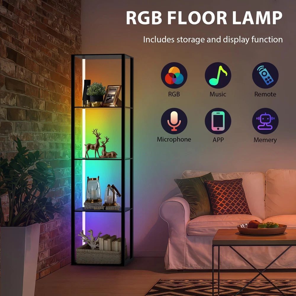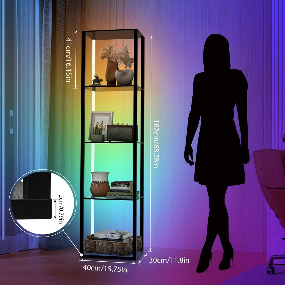 1 3 in 1 Floor Lamp with Corner Shelves:Cleverly integrates color-changing lighting, storage, display.Our display shelf with lights has 60000 RGB multi-color lighting color .5-Tier corner bookshelf with lights can be used as a display rack for statues,memorabilia,plants, books, collectibles, decorations etc,Decorating your bedroom , living room,playroom Remote Control & APP Control LED Light: Offering built in music mode and microphone on APP, the light colors change and flash in sync with the rhythm of music.Turn on/off/timer through it effortlessly, adjust the color and temperature Stability&Storage Corner Shelf Display:It can hold up to 65lbs.The corner display shelf's rectangle upgraded design allows the corner stand to stand smoothly free or flush against the wall,fitting seamlessly into random nooks and crannies. It comes with anti-toppling fittings to anchor it to the wall for safe use.Dimensions of this corner shelf are 15.74" x11.81" x 63.77" when fully assembled Safe and easy to assemble:The surface of lighted display case is coated by advanced UV treatment---odorless and safe which friendly to your children and pets Customer Service & No Worry Purchase:The floor lamp will last 50,000 hours life. If you encounter any problems for using this corner shelf lamp, please directly contact us,'s mission is to be responsible for you to the end
