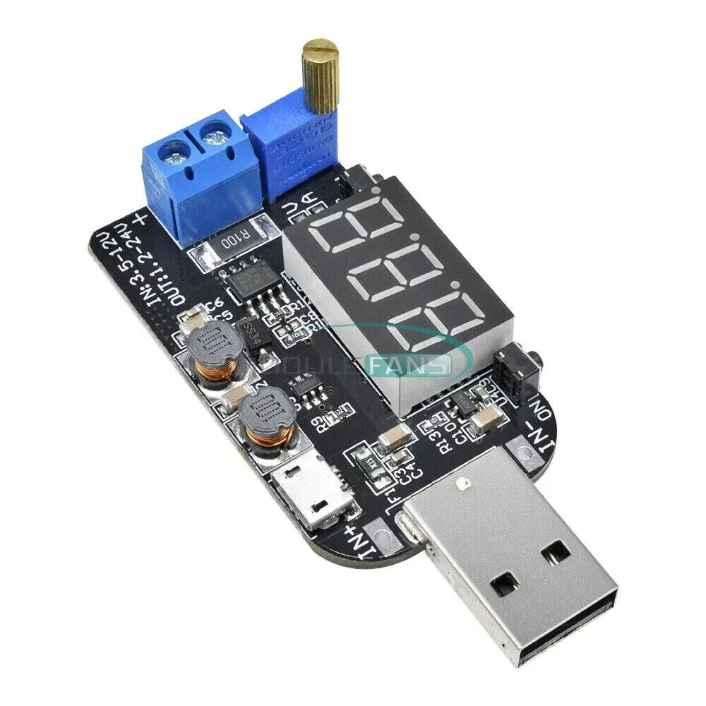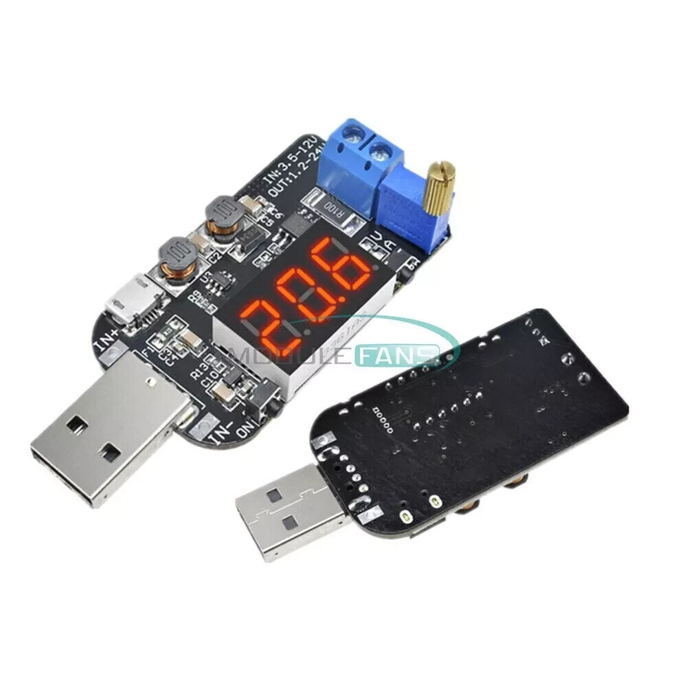 Description: It is a DC adjustable constant voltage constant current step up/down power supply module with LED digital tube display.Display output voltage, output current and output power.Adjustable output voltage and current.Set output current to meet the require.It can be used as ordinary buck power supply module, charger and LED constant current driver.Simple and efficient, practical. Features: Support short circuit protection/anti-backflow protection/constant voltage constant current adjust;4-Bit digital tube display;4-Bit digital tube display;Three input power modes;Support over-current protection/over-current protection/over-voltage protection/over power protection/over temperature protection/charging mode;High resolution;Multiple parameters can be displayed in turn Parameters: Product Name:USB 2A Step Up/Down Power Supply Module Input Voltage for Pads:DC 4.0V-13.0V Input Voltage for USB:DC 5.0V Output Voltage:DC 0.5V-30.0V Output Current:2A Output Power:15W(Max) Voltage Display Precision:+/-0.1V Voltage Display Resolution:0.1V Current Display Range:0~2.2A Current Display Precision:+/-0.05A Voltage Display Resolution:0.001A Power Display Range:0~99.99Ah Capacity Precision:0.00W~15.0W Protection Temperature Threshold:100℃ Conversion efficiency:95% Working current:30mA Working Temperature range:-20℃~85℃ Working Humidity Range:0%-95%RH Button/Potentiometer/LED introduction: 1.Long press means need keep press for more than 3second. 2.Left Button:Long press is used to set default ON or OFF for next re-power at display mode or as ‘Minus -’ in calibration mode.Short press to select whether output voltage at display mode. 3.Right Button:Long press is used to enter or exit calibration setup mode at display mode or as ‘Plus +’ in calibration mode.Short press to switch display output voltage,output current, output power or display these parameters in turn. 4.CV Potentiometer:Adjust output voltage.Increase the output voltage when rotating clockwise.Please rotate the CV potentiometer 10 turns in counterclockwise if the output voltage cannot be adjusted. 5.CC Potentiometer:Adjust output current.Increase the output current when rotating clockwise.Note:It is not keeping a fixed output current.When the load current reaches the set current value, the module starts to fix output this current value. 6.ON LED:Green Output indicator.It will turn ON when there is a output at output terminal.Otherwise it is OFF. 7.CC LED:Red Constant current output indicator.It enters the constant current state when the load current reaches the set current and CC constant current indicator turns ON. Input terminal:There are three input methods: Method 1:Standard Type A USB Male .It just can input DC 5V. .Method 2:Micro USB Female.It just can input DC 5V. Method 3:IN+ and IN- pads.It can input DC 4.0V-13.0V. It can only choose one input method. Output terminal: KF-301-2P 5.08mm blue terminal. It can output DC 0.5V-30.0V. Protective function: Over-Voltage Protection:Module will turn OFF output voltage automatically if output voltage is more then 30.5V. Over-Current Protection:Module will turn OFF output automatically if output current is more then 2A. Over-Power Protection:Module will turn OFF output automatically if output power is more then 15W.It will display ‘-OP-’.User need reduce load power and then press ‘ON/OFF’ button. Current error:Large display error when output current is less than 0.05A.It can not display output current if current is 10~40mA. Over Temperature Protection:Module will turn OFF output automatically if termperature is more then 100℃.It will display ‘-OT-’.User need reduce load power and then press ‘ON/OFF’ button. Note: 1.It is a DC power module,So it can not connect to AC power. 2.Please don’t short output. 3.’IN-’ and ‘OUT-’ Package Included: 1PCS*DC 5V to 1V 12V 24V 15W USB Adjustable Step Up Down Voltage Power Supply Module