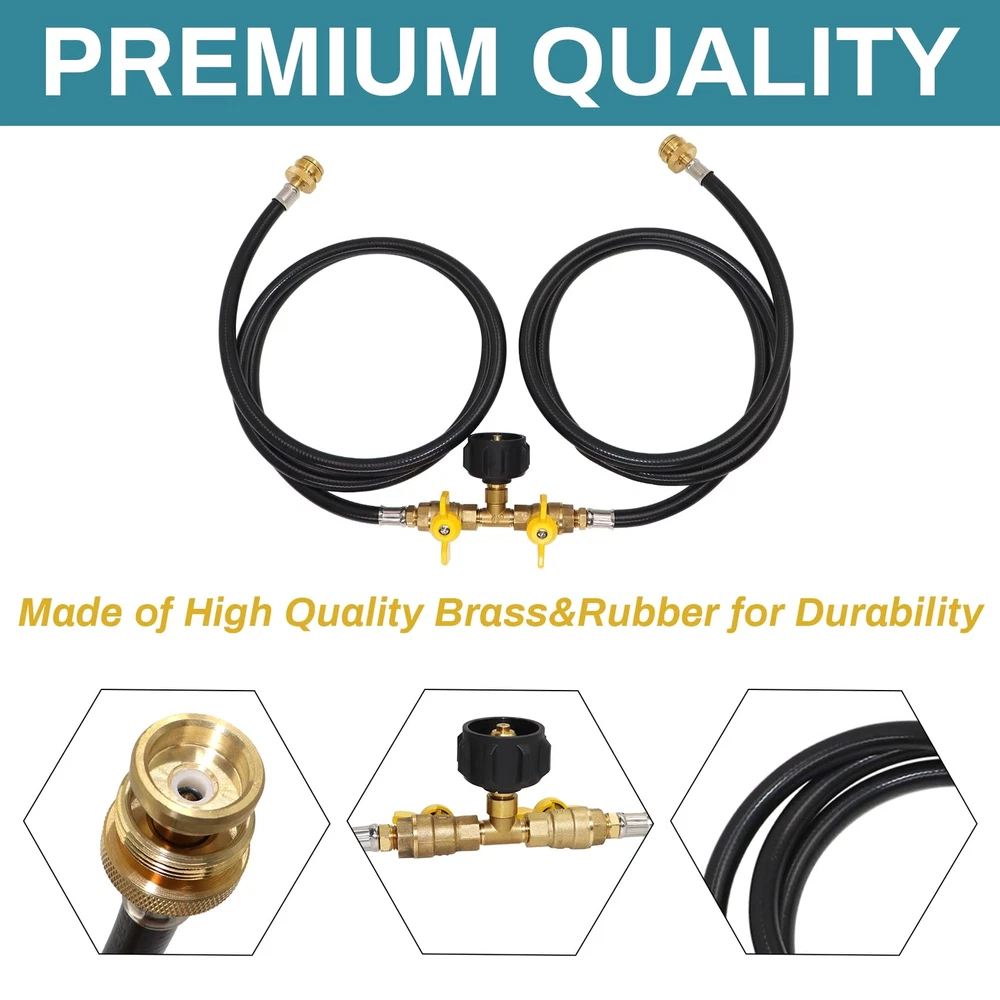 WIDELY APPLICATION: The propane 2 way Y splitter hose is with all equipment with QCC1/Type 1 connection and 1 lb to 20 lb propane tank, suitable for camping stoves, tabletop grills, tailgates, outdoor heaters, coleman camping stove, weber Q grill and more 1-lb portable propane equipment. EASY & CONVENIENT: This propane way splitter hose is a perfect for the 16.4oz/1 pound green small tank, and it can be directly connected to a 1-pound portable propane device without an additional regulator. UPGRADED DESIGN: The 2 way design allows you to connect appliance easily at the same time to the propane tank by hand without any tools. Equipped with a control valve on each way of the hose, convenient to control the flow. SUPERIOR QUALITY: Both adapters are made of solid brass, and the hose is made of high quality rubber, which allows a long-lasting life of the product. 350PSI propane tank outlet pressure, and the over flow&heating protection design can ensure safety. EXCELLENT SERVICE: We are confident with our products, so we provide year Service! If you have any questions, Please feel free to us. We will give you a satisfactory answer within 12 hours.