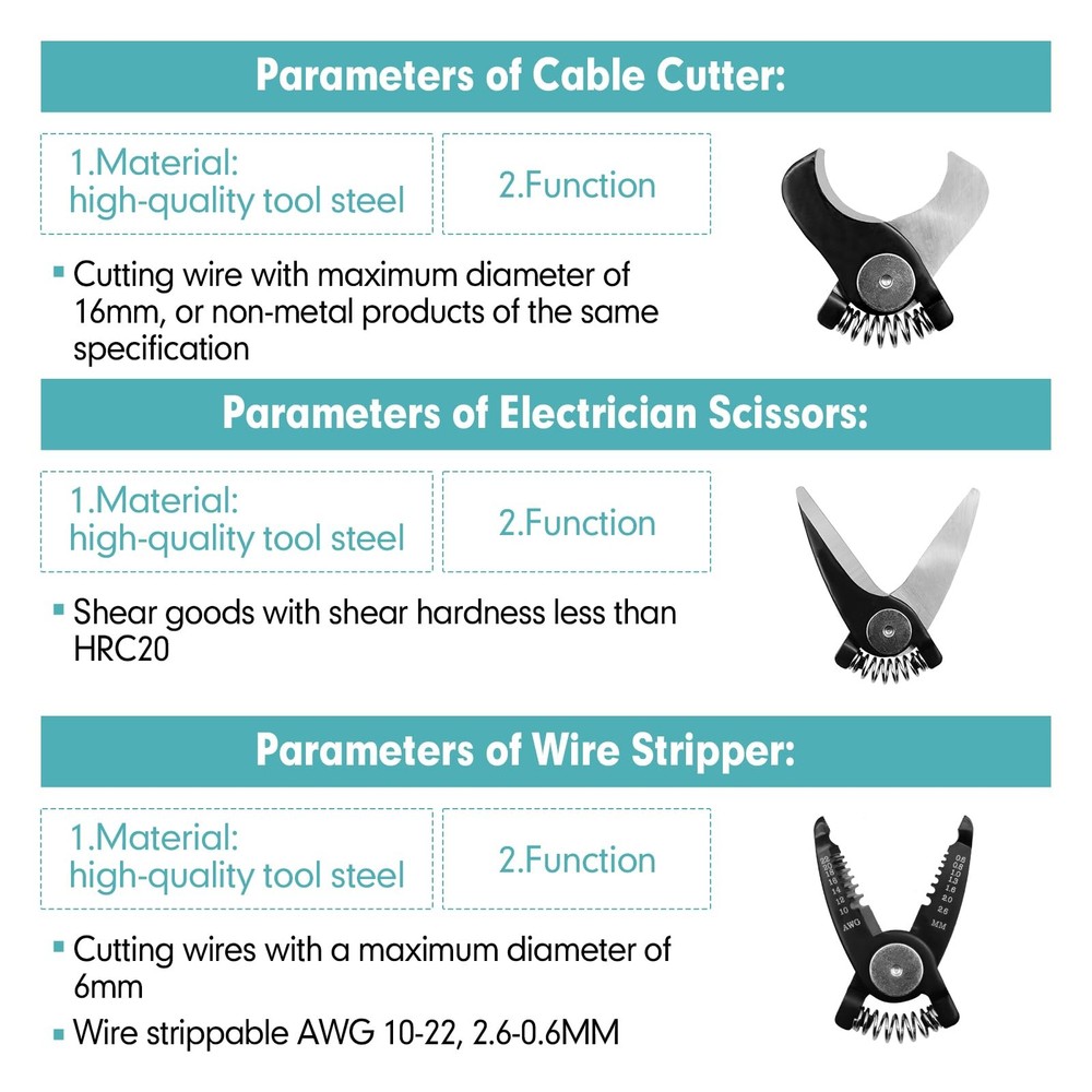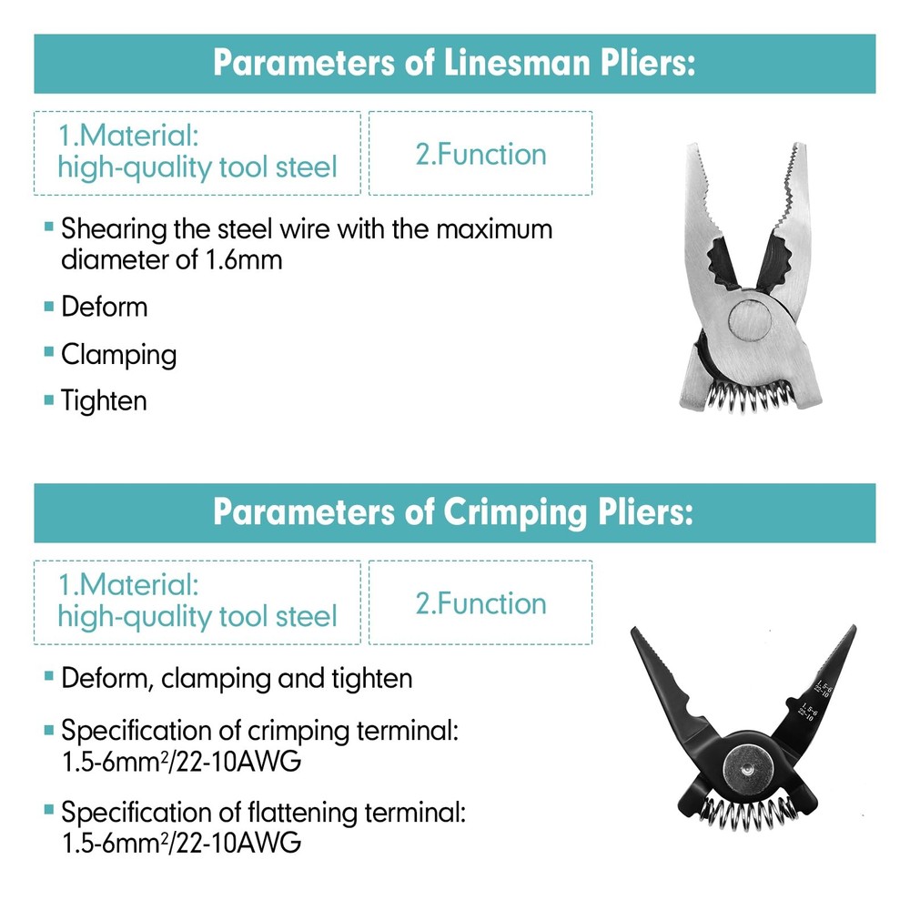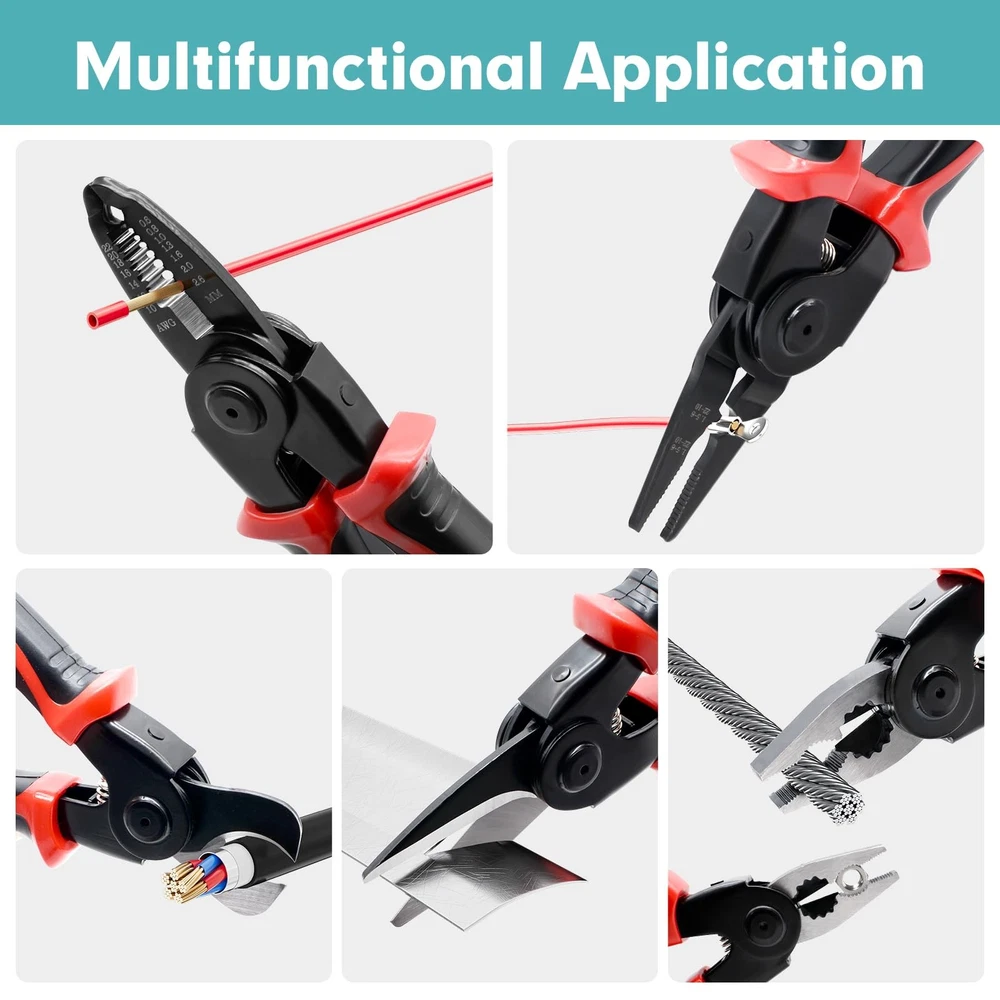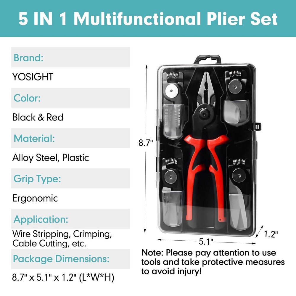 【5-in-1 Multifunctional Plier Set】This set includes 5 interchangeable plier heads for various electrical maintenance needs, including wire stripper, crimping plier, cable cutter, electrician scissors, and linesman plier. 【5-in-1 Multifunctional Plier Set】: This set includes 5 interchangeable plier heads for various electrical maintenance needs, including wire stripper, crimping plier, cable cutter, electrician scissors, and linesman plier. 【High-Quality Material】: The pliers and cutters are made of alloy steel, undergo heat treatment, and feature a black oxide coating for durability, corrosion resistance, and an extended lifespan. 【Comfortable Handle】: The dual-color coated handle is made of PVC plastic, designed with human ergonomics in mind, ensuring safety, comfort, ease of operation, and enhanced work efficiency. 【Widely Applicable】: The 5-in-1 Multifunctional Plier Set is suitable for various electrical repairs, professional electrical work, home repairs, mechanical manufacturing and more. With different interchangeable tool heads to meet various needs, it is a convenient and practical tool kit. 【Product Parameter】: Brand: Color: Black & Red Material: Alloy Steel, Plastic Grip Type: Ergonomic Application: Wire Stripping, Crimping, Cable Cutting, etc. Package Dimensions: 8.7" x 5.1" x 1.2" (L*W*H)