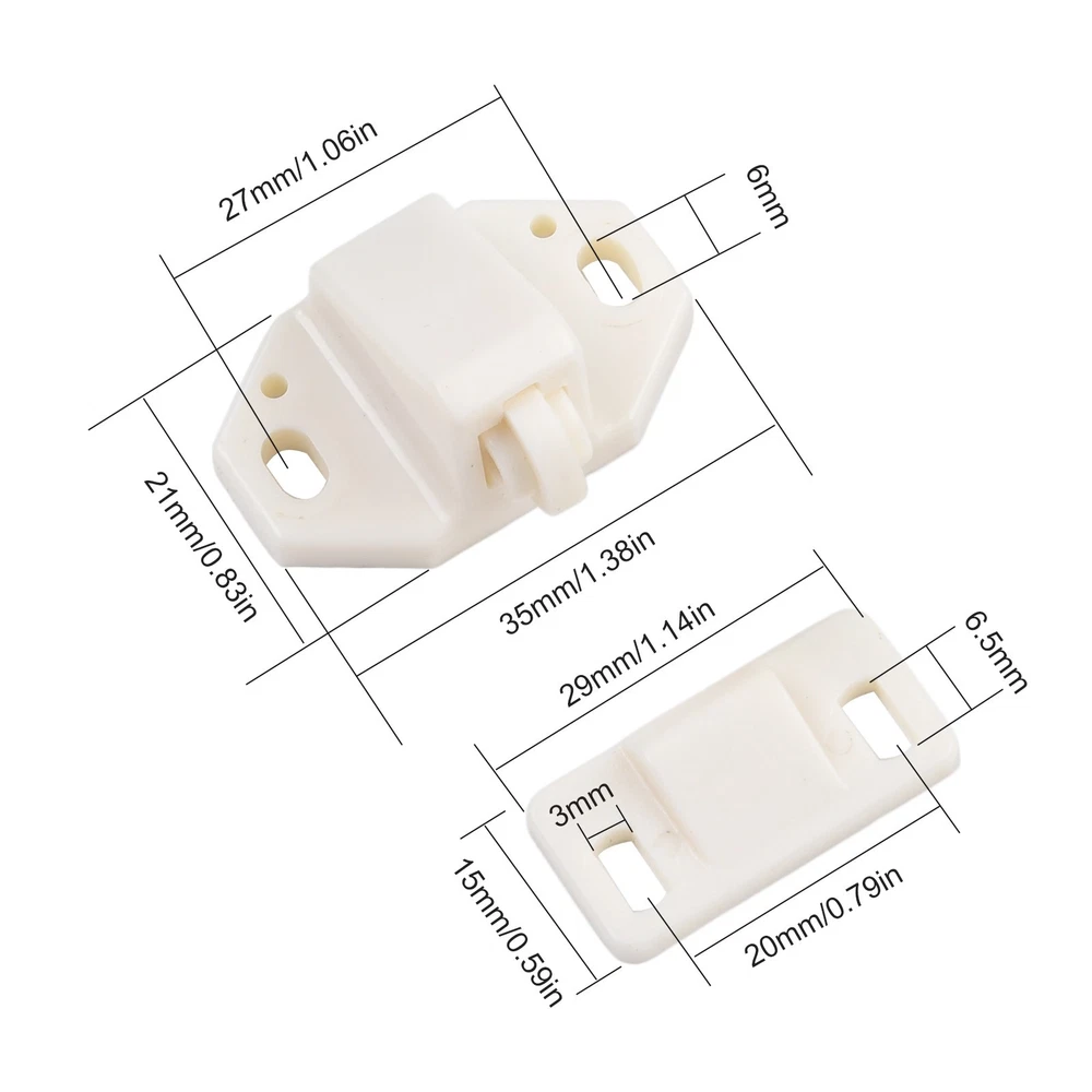 5pc Furniture Cabinet Closet Door Roller Catch with ABS Roller White DESCRIPTION Features: This door catch is constructed from ABS. It features a spring loaded strike roller. This application allows use on any door and comes complete with hardware for a quick and easy installation. Mounting screws not included. Specification: *Product Name:Door Roller Catch *Material: ABS Plastic *Color: White *Size: Body Size: 35mm x 21mm x 20mm / 1.38" x 0.83" x 0.79"(L*W*H) Plate Size: 29mm x 15mm / 1.14" x 0.59"(L*W) Mounting Hole Diameter: 6mm x 4mm; 6.5mm x 3mm (L*W) Mounting Hole Distance: 27mm / 1.06"; 20mm / 0.79" Package Contents: 5Pcs x Door Roller Catch Note: 1. The real color of the item may be slightly different from the pictures shown on website caused by many factors such as brightness of your monitor and light brightness. 2. Please allow slight manual measurement deviation for the data. POLICES Shipping Payment WARRANTY We only ship to confirmed ebay Order addresses. Please comfirm that your Order address is in line with your shipping address. Please kindly note that the c ombined shipping is not provided because the shipping fee is calculated by weight. Also, the each additional item means exactly the the same color and size. It takes about 7 -15 working days to US; about 10-30 working days to other countries. Transit time may be a little delayed because of the bad weather and customs inspection . If you do not receive your item within 30 working days since payment finished, please contact us immediately for further assistance. Payment must be completed within 5 days. If you have any problems about payment, please contact us via ebay message. We strive for 100% customer satisfaction! Positive Feedback is very important to us. If you have any questions, p lease feel free to contact us via "Ask seller a question" . We will reply your email within 24 working hours. On May 21, 2025 at 02:08:47 PDT, seller added the following information: