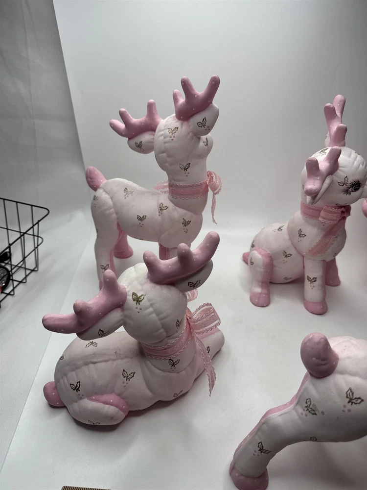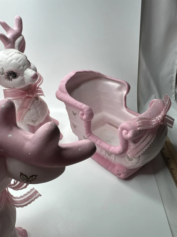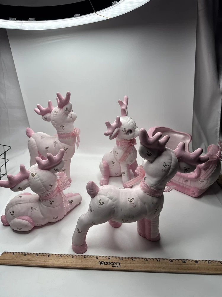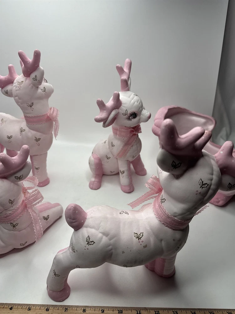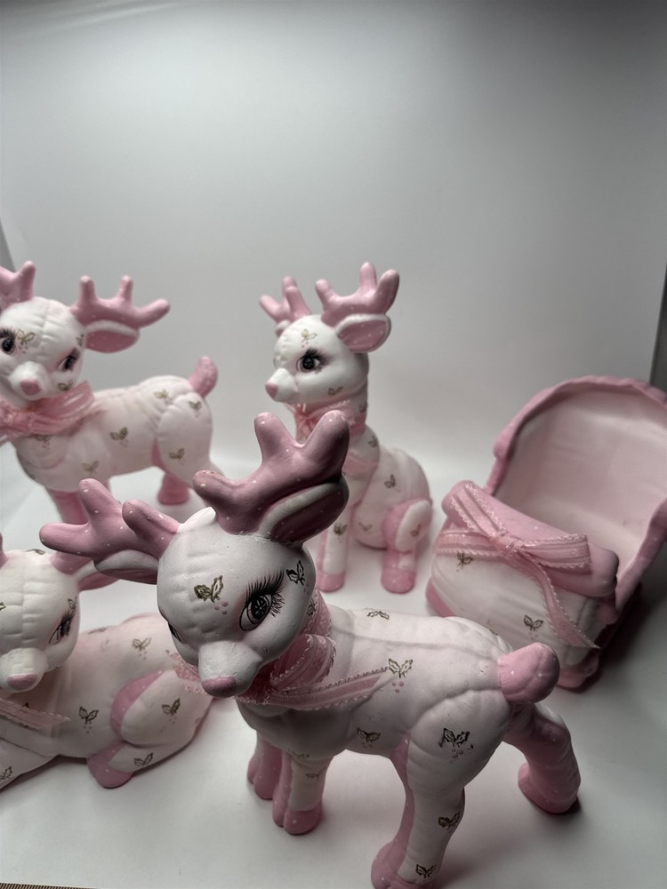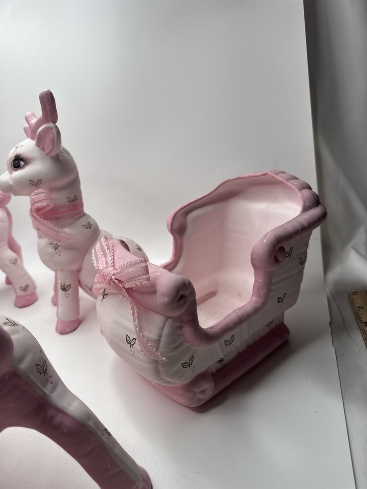 5pc Set of Ceramic Plush Design Pink Reindeer with Sleigh Christmas Decor MCM Item is in vintage pre-owned condition and may show some signs of use and wear/tear. Please check out the pictures and let me know if you have any questions. Thank you for checking out my shop! :) Our hand-selected products are carefully examined, photographed, and stored in a smoke-free environment. Orders received by 2pm ET generally ship the next business day from Pennsylvania via USPS. I'm happy to combine shipping on orders; eBay should provide a combined shipping quote in many cases. I can always combine shipping manually as well if that is helpful.