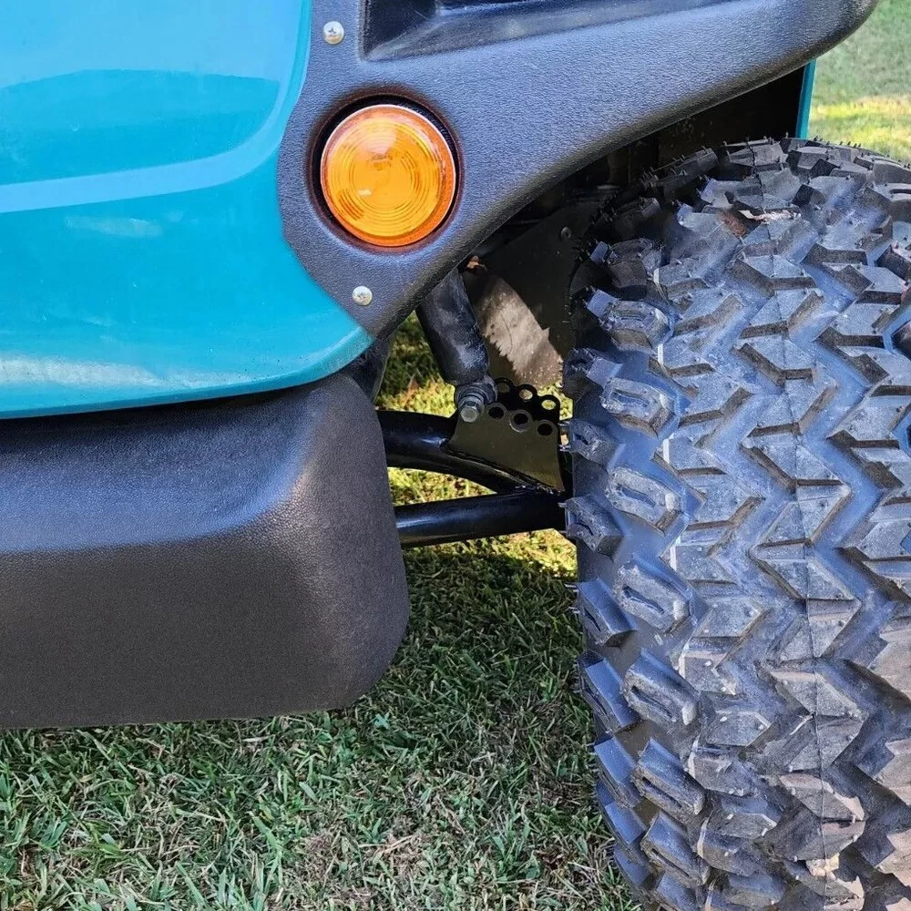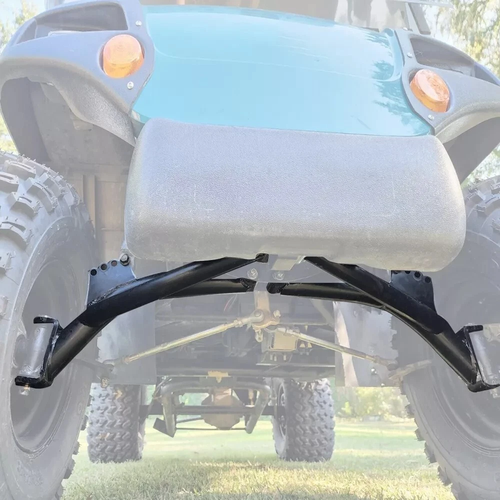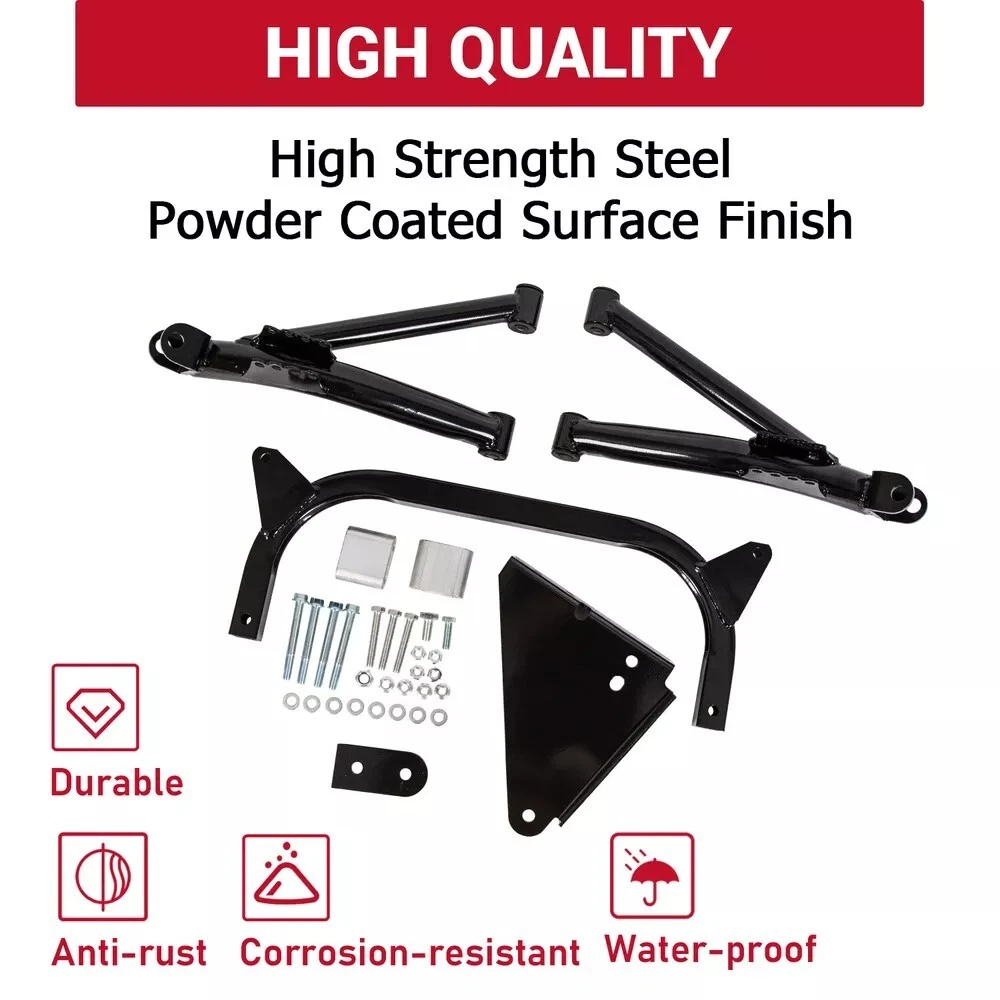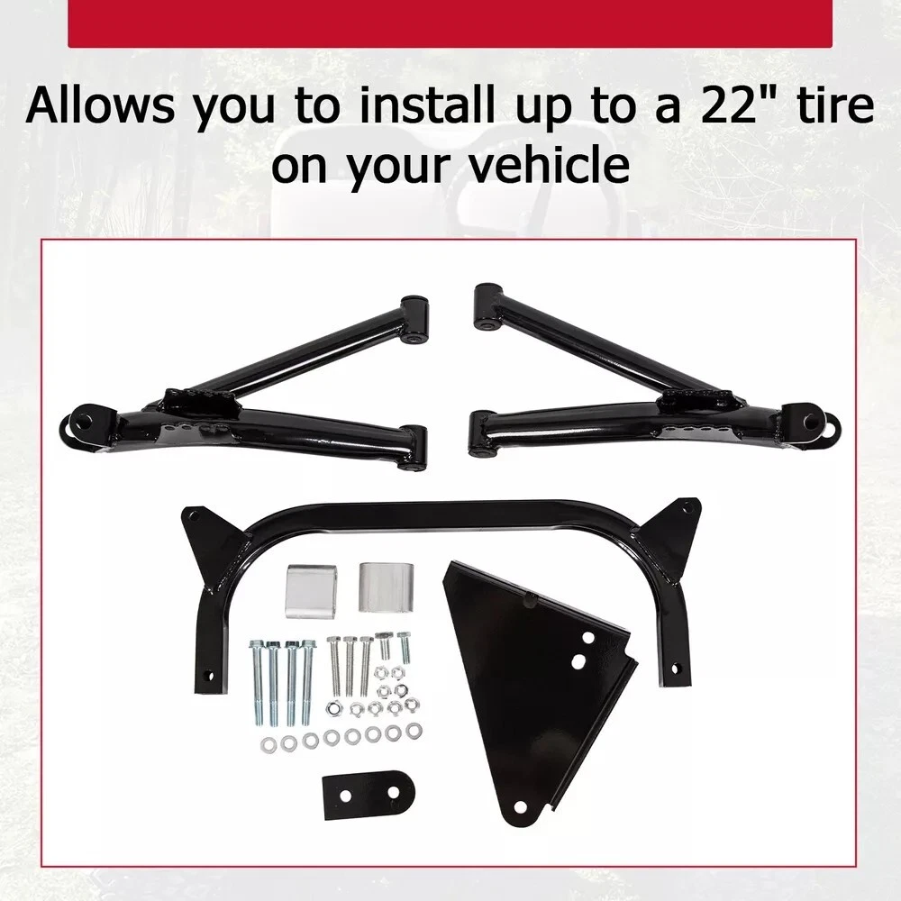 6" A-Arm Lift Kit for Yamaha G8-G14, G16, G19 G20 1995-02 Golf Cart Electric/Gas Description This lift kit will give your Yamaha G-Series cart a smooth riding 6" lift so you can fit on that brand new set of (up to) 22" all terrain golf cart tires on your cart. Specifiction Condition: 100% Brand New Finish: Black Powder Coating (not paint/no wear) Lift Kit Height: 6 inch lift (fits up to 22" tires) Tire Size Fitment: Up to 22" Proof load: 85,000psi Features This golf cart lift kit is forged from good steel for greater efficiency and durability. The black powder coating makes it durable and rust resistant. It can improve the overall performance of the golf cart. A-arms replace the previous front axle, making your Yamaha G series lift smoother and safer. Tire size fitment: Up to 22". Proof load: 85,000 psi. Heavy duty rear springs are recommended if the cart is heavily weighted to prevent rubbing with 22" tires. All Alloy Class 8.8 high strength hardware. The 6" lift kit is made of heavy duty alloy steel. Not easy to bend or break. Fits All Yamaha G Series model golf carts from 1995 thru 2002 (G8, G14, G16, G19, G20) Electric or Gas cart PLEASE NOTE : THIS LIFT KITS CANNOT BE MOUNTED ON G2/G9 OR G29(DRIVE) MODELS. Package Include 1 Set Of Front & Rear 6 inch A-Arm Lift Kit Includes spacers and adapter plates as required, can be installed with existing hardware.