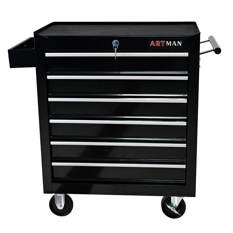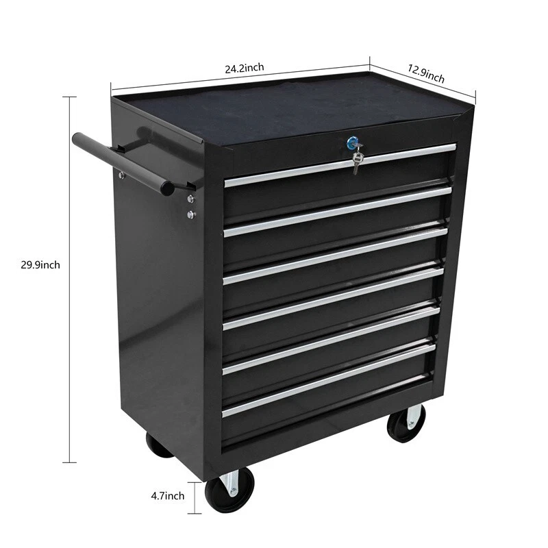 6 Drawers Tool Cart Workshop Rolling Tool Box Chest Storage Cabinet w/Lock & Key Features and Details: 6 Drawers multifunctional tool cart with wheels The tool box is also lockable and can be used as a removable, attachable and mobile case The opening and closing of the drawers of the tool cabinet is very gentle thanks to the ball-bearing drawers The robust and powder-coated steel construction is used for high wear resistance. This assembly trolley has 4 steering wheels, 2 of which with parking brakes, so you can move the trolley freely in the garage, but also stop in one place Specification: Color: Black Material:Cold Rolled Steel Product Dimensions:24.25"L12.99"W29.33"H Surface Finish :Powder Coating Powder Coating:4" Casters (2PCS with brake and 2PCS without brake) Drawers Dimension : 540*300*85 Weight (lbs.): 48.50