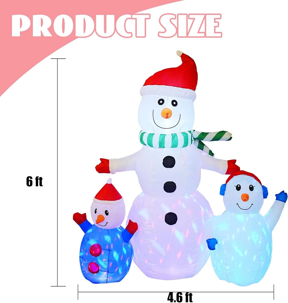Store New Arrivals Add to Favorite View Feedback Contact Fast deliveries to the customer's home Quality customer service John Make the customers happy! 6 FT Christmas Inflatable Snowman Outdoor Decorations, Blow up Snowman Built-In Colorful Rotating LED, Waterproof Christmas Decoration for Yard Garden Lawn Xmas Holiday Decor Description Warm Embrace Design: Our trio of inflatable snowmen exudes a welcoming charm with outstretched arms, as if offering a warm hug. The base is adorned with rotating LED lights that cast a beautiful glow, enhancing the snowman's presence and making the night view enchanting. Colorful Rotating LED Lights: The interior of the inflatable snowman houses bright, colorful LED lights that create a mesmerizing atmosphere, especially during the evening hours. The lights dance around the snowman, evoking a sense of wonder and magic. Robust and Secure: Equipped with built-in 4 stakes and 2 tethers, our inflatable snowman is designed for stability and ground security. Crafted from high-strength, waterproof polyester that resists fading, it stands up to light rain and is suitable for both indoor and outdoor festivities. Effortless and Safe Inflation: Our snowman comes with a powerful built-in blower for quick inflation. Simply zip up the closure at the bottom, connect it to a power source, and watch as the inflatable expands to full size in under a minute, ensuring a safe and user-friendly experience. Ultimate Christmas Charm: This inflatable snowman is the epitome of winter joy and the quintessential outdoor Christmas decoration. It's perfect for adorning gardens, yards, and indoor spaces, creating a festive atmosphere that brings happiness and warmth to the holiday season. Product Description The video showcases the product in use. The video guides you through product setup. The video compares multiple products. The video shows the product being unpacked. Whimsical Design Trio of snowmen with welcoming outstretched arms. LED Light Base Adorned with rotating LED lights for a beautiful nighttime glow. Durable Material Crafted from high-strength, waterproof polyester that resists fading and is suitable for light rain. 1 Whimsical Design 2 LED Light Base 3 Durable Material Warm Embrace Inflatable Snowmen Our Inflatable Snowmen Trio brings a warm embrace to your Christmas decor, standing ready with outstretched arms to welcome friends and family. This charming group creates an enchanting night view with their rotating LED lights, perfect for spreading holiday cheer. Perfect for gardens, yards, and indoor spaces. Brings happiness and warmth to the holiday season with its iconic winter joy. MERRY CHRISTMAS Add to Cart Add to Cart Add to Cart Add to Cart Customer Reviews 4.3 out of 5 stars 1,038 3.9 out of 5 stars 296 3.4 out of 5 stars 285 3.9 out of 5 stars 296 4.1 out of 5 stars 284 4.2 out of 5 stars 15 4.5 out of 5 stars 225 Price $24.99 $ 24 . 99 $39.99 $ 39 . 99 $39.99 $ 39 . 99 $105.99 $ 105 . 99 $23.99 $ 23 . 99 $49.99 $ 49 . 99 $20.79 $ 20 . 79 Size 7.5" x7.5" x7.1"(Large) 20.5"L x 9"W x 29.5"H 24"L x 6"W x 16"H 24 "L x 9.7"W x 52"H 7.5" x7.5" x7.1"(Large) 6 FT 16.9"H x 10.8"W Power Supply Plug In Plug In Plug In Plug In Plug In Adapter / Lights ✔ ✔ ✔ ✔ ✔ ✔ ✘ Waterproof ✔ ✔ ✔ ✔ ✔ ✔ ✔ Outdoor ✔ ✔ ✔ ✔ ✔ ✔ ✔ Item Dimensions 3 x 4 x 5 inches Color White Light Color Multicolored Material Polyester Material Type Polyester Theme Christmas Occasion Christmas Additional Features Lighted ABOUT US We offer the best prices around on high quality products. Our E-store includes media such as books, movies, music and games while offering electronics, toys, sporting apparel, clothing, tools, general home, garden items and more. SHIPPING We are always working hard to ensure your package arrives as soon as possible. Please understand that some factors like weather, high postal traffic, and the performance of shipping companies are outside of our control. We offer free shipping to the lower 48 states and ship within 2 business days of payment, usually sooner. We do not accept P.O. Boxes. Please provide a physical address. For shipping outside of the continental USA, we only use eBay's Global Shipping Program. The item is shipped to KY and then sent to the rest of the world. International customers are responsible for all duties and taxes. Continue to 'check out' to calculate costs for shipping the item to your country. Messages regarding eBay's Global Shipping Program MUST be directed at eBay EXCLUSIVELY. RETURNS We offer a 30-Day Return Policy on items in which you are not completely satisfied with. You have the option of a full-refund or an exchange of the item. No returns are available on items shipped outside of the USA PAYMENT We accept PayPal. CONTACT US This page content is yet to come Please ad us to your favorite seller and visit again later Thank You CUSTOMER SATISFACTION We try our very best to make sure every customer is completely satisfied. If there's a problem, message us! We're happy to help. WE ACCEPT
