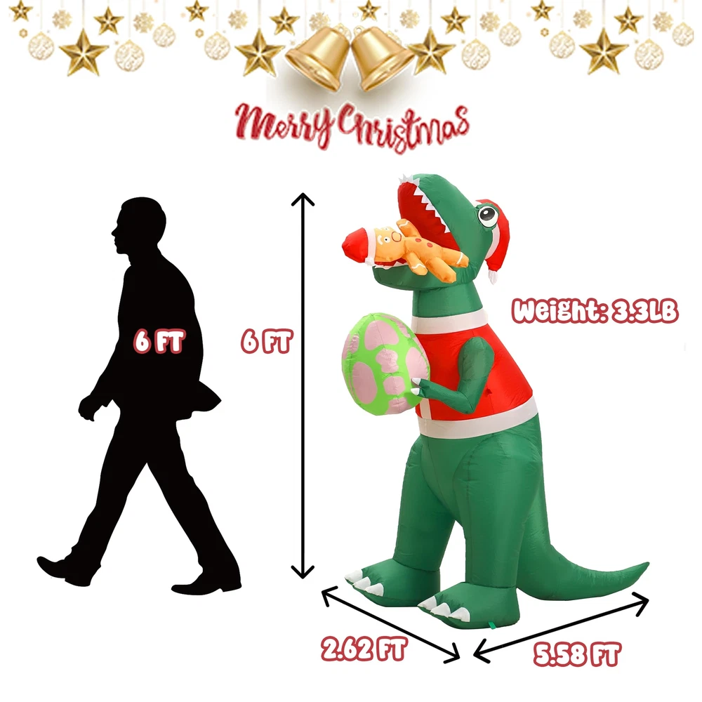 IMPRESSIVE SIZE: Standing at 6 feet tall, this Christmas inflatable dinosaur is sure to make a statement and capture the attention of all who pass by. The outdoor Christmas decorations add a touch of magic to your holiday decorations. VIBRANT AND FESTIVE: The dinosaur christmas decorations with its colorful and festive design, this inflatable dinosaur is a cheerful addition to any Christmas display. The Christmas inflatables outdoor decorations bright LED lights illuminate the decoration, creating a joyful and captivating sight day and night. DURABLE AND WEATHER-RESISTANT: Crafted from waterproof durable polyester material materials, this funny Christmas inflatable is built to withstand the elements. Whether it's rain, snow, or wind, you can rest assured that your holiday decor will remain in excellent condition throughout the season. EASY SETUP AND STORAGE: Setting up this blow up dinosaur is a breeze. Simply plug Christmas yard inflatables into an electrical outlet, and the dinosaur Christmas decorations will inflate within minutes. When the holiday season comes to an end, The xmas inflatables deflate quickly and can be easily folded and stored until the next year. VERSATILE DISPLAY OPTIONS: With its versatile design, this inflatable dinosaur can be placed in various locations. Whether you want to brighten up your front yard with the Christmas Inflatables dinosaur gingerbread Man, spruce up your garden, or add a touch of holiday spirit to your living room, this Christmas outside inflatables fits seamlessly into any space.