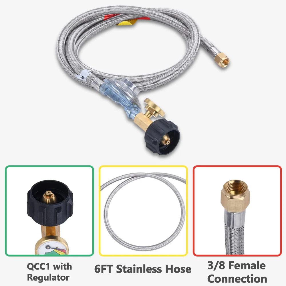 Stainless braided hose prevents whatever animals from chewing through it . The attached propane gauge can detect dangerous leaks and read fuel level at glance for Weber Genesis 300-series gas grills, Genesis Silver C, Genesis Gold ,Genesis Platinum , Spirit E-210/E-310 etc. and most of Char-broil gas grill with side burner,Dyna-Glo dgp350snp-d,mfa350bnp/mfa350cnp ge530bsp-d, dge486ssp-d, dge486gsp-d etc.,Uniflame GBC873W-C, GBC873W, GBC940WIR, GBC940WIR-C, GBC976W, GBC956W1-C, GBC1076WE-C, BH12-101-001-02 etc., most of Kenmore gas grill and most of Easy installation - No tools required, tool-less attachment to tank. It is normal if you hear noise in the regulator, it is the resonance of the gas in the regulator. Connects to QCC1/Type1 LP tanks and cylinders,fits to gas grills, heaters ,fire pit table and most QCC1/Type 1 low pressure gas application.Great for BBQ, camping, tailgating, heating needs or having an outdoor cookout. Provides secure, air-tight connection between grill or fire pit and tank, no gas leaks, ensures safety while using grill, no issues with regulator or gas, air flow is kept stable and at appropriate levels