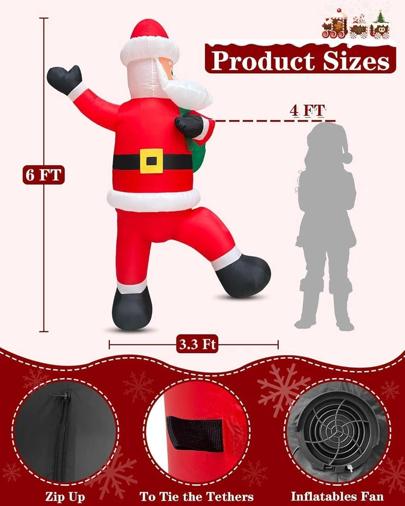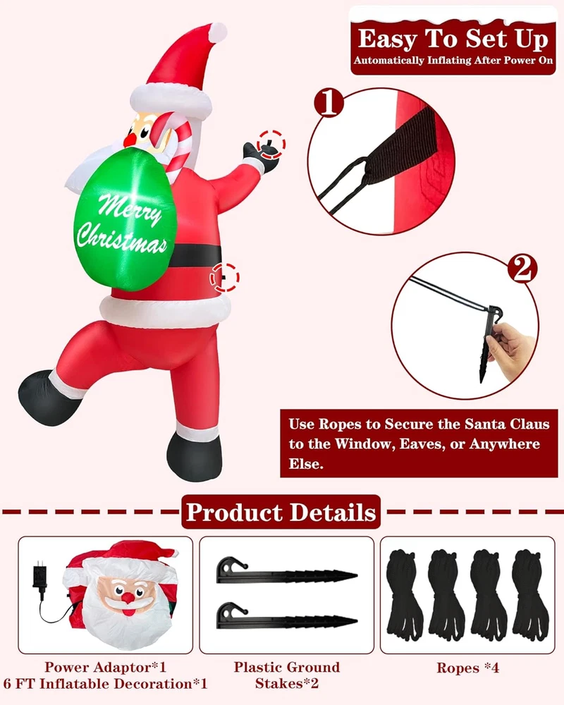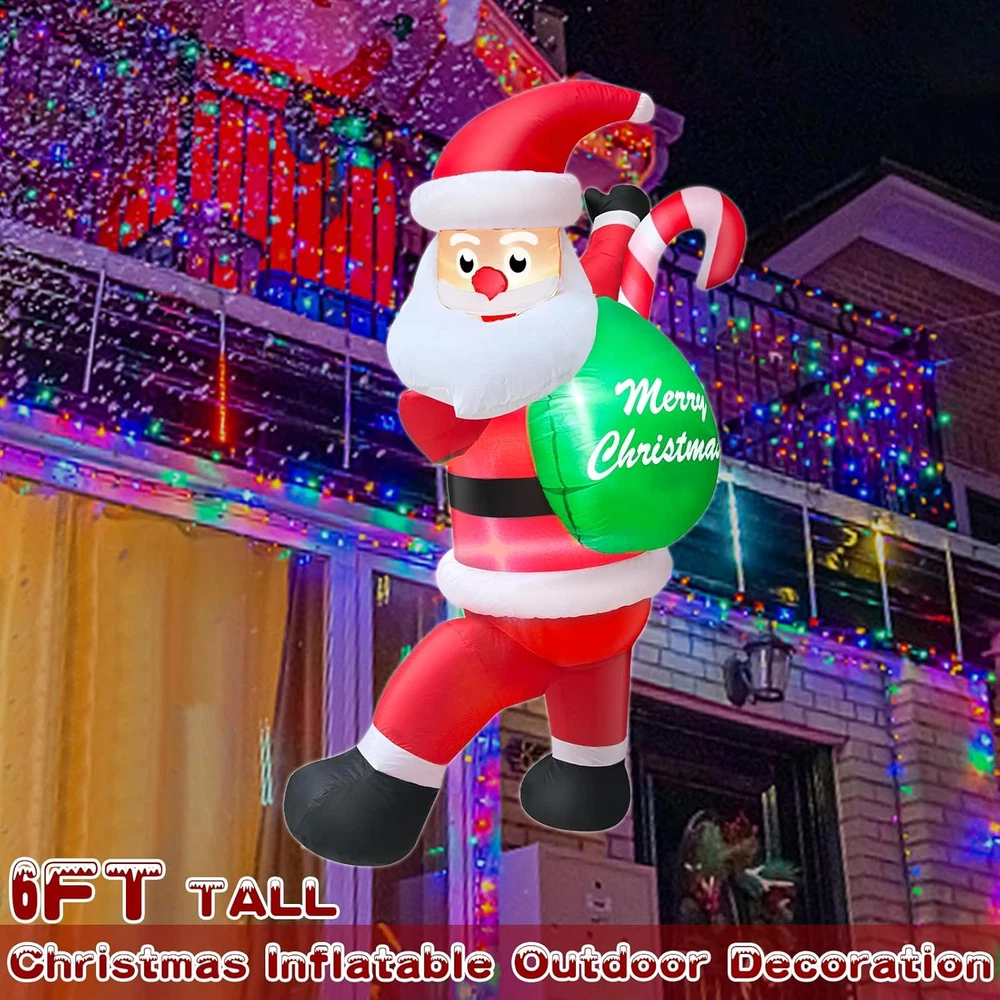 Store New Arrivals Add to Favorite View Feedback Contact Fast deliveries to the customer's home Quality customer service John Make the customers happy! 6 FT Tall Christmas Inflatables Climbing Santa Claus Outdoor Decorations, Funny Hanging Santa Inflatable with Gift Bag Build-In LED Lights Blow up Yard Inflatable for Xmas Holiday Party Winter Decor Description 6 FT Climbing Santa Claus Inflatable: Santa holding a large gift bag, climbing the wall to bring blessings and surprises to your family; Equipped with built-in LEDs lights, it can be hung on windows, doors and any other corner of house to add atmosphere Built-in Brightening LEDs Lights: Climbing Santa inflatables comes with 3 LEDs lights, making the image of Santa Claus climbing to deliver gifts at night vivid and interesting, adding charm and attractiveness, making your yard the focus of neighborhood Quick Inflation and Deflation: With a built-in air pump and adapter, just connect to the power source, Christmas decorations outdoor can be quickly inflated; Zipper design for quick deflation, easy to tidy up and store, preparing for the next party use Easy to Install and Secure: Hanging Santa inflatables comes with 4 ropes; 2 ropes at its top can be used to hang it on poles, eaves, or other places, and 2 ropes at waist can be used to secure the Christmas inflatables; Even in wind, it can keep stability Multi-functional Decoration: Christmas blow up yard decorations outdoor is suitable for home, parties, classroom, Christmas event decorations, Christmas night events, Christmas Eve, New Year's Day, indoor and outdoor; Waterproof polyester is long-lasting Product Description Item model number RH-120-1000U4-1 Item dimensions L x W x H 1 x 1 x 1 inches Light Color Bright White Color Multicolor Material Oxford cloth Country of Origin China Style 6 Ft Inflatable Santa Item Weight 1.83 pounds Theme Christmas Occasion Christmas, Yard, Malls, Walls Special Feature Climbing Santa Claus with Gift Bag, Hanging Santa Inflatable, Build-in LED Lights Product Dimensions 1 x 1 x 1 inches Cartoon Character Climbing Santa Claus ABOUT US We offer the best prices around on high quality products. Our E-store includes media such as books, movies, music and games while offering electronics, toys, sporting apparel, clothing, tools, general home, garden items and more. SHIPPING We are always working hard to ensure your package arrives as soon as possible. Please understand that some factors like weather, high postal traffic, and the performance of shipping companies are outside of our control. We offer free shipping to the lower 48 states and ship within 2 business days of payment, usually sooner. We do not accept P.O. Boxes. Please provide a physical address. For shipping outside of the continental USA, we only use eBay's Global Shipping Program. The item is shipped to KY and then sent to the rest of the world. International customers are responsible for all duties and taxes. Continue to 'check out' to calculate costs for shipping the item to your country. Messages regarding eBay's Global Shipping Program MUST be directed at eBay EXCLUSIVELY. RETURNS We offer a 30-Day Return Policy on items in which you are not completely satisfied with. You have the option of a full-refund or an exchange of the item. No returns are available on items shipped outside of the USA PAYMENT We accept PayPal. CONTACT US This page content is yet to come Please ad us to your favorite seller and visit again later Thank You CUSTOMER SATISFACTION We try our very best to make sure every customer is completely satisfied. If there's a problem, message us! We're happy to help. WE ACCEPT