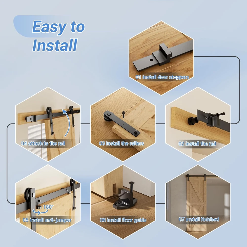 Store New Arrivals Add to Favorite View Feedback Contact 6 Feet Heavy Duty Sturdy Sliding Barn Door Hardware Kit -Smoothly and Quietly -Easy to Install Fit 36" Wide Door Panel (I Shape Hanger) Description Item model number A06SYP3-FBA Part Number YP2-Parent Style Modern Size 6 Feet Assembly Required Yes Item Package Quantity 1 Color I Style Hanger Material Metal Country of Origin China Batteries Required? No Item Weight 4.1 Pounds Batteries Included? No Special Features Easy to Install Installation Method Wall-Mounted Is Discontinued By Manufacturer No Product Dimensions 2 x 4 x 11 inches Included Components Tracks, Rollers Durability and Weight Capacity: Solid steel roller hanger and High strength industrial grade flat tracks hold MAX. 330LB/150KG door, anti-corrosion and little wear and tear for years of repeated use. Quiet and Smooth Operation: Super silently nylon wheels and Spring damping door stoppers provide soft close sliding when opening and closing, move quietly and smoothly. Save Space: For space-saving benefit, ccjh sliding barn door hardware kit is a great option for both homes, offices, narrow hallways and as well as smaller apartments, blending modern design with rustic appearance. Easy to Install: ccjh barn door hardware offers professional instruction and customer service to solve all installation problems in time, needs MIN. 6" space above the door, fits 1-3/16"-2" thick door. Well Complete Package: barn door kit-NO DOOR(6ft spliced rails, rail spacers, 2x rollers, 2x door Stops, 2x anti-jump disks, 1x floor guide), 6ft barn door track fits a max. 36" wide door, and gap from wall to door is 2-3/16" minus door thickness. Product Description ABOUT US We offer the best prices around on high quality products. Our E-store includes media such as books, movies, music and games while offering electronics, toys, sporting apparel, clothing, tools, general home, garden items and more. SHIPPING We are always working hard to ensure your package arrives as soon as possible. Please understand that some factors like weather, high postal traffic, and the performance of shipping companies are outside of our control. We offer free shipping to the lower 48 states and ship within 2 business days of payment, usually sooner. We do not accept P.O. Boxes. Please provide a physical address. RETURNS We offer a 30-Day Return Policy on items which you are not completely satisfied with. You have the option for a full-refund or an exchange of the item. No returns are available on items shipped outside of the USA. PAYMENT We accept PayPal. CONTACT US This page content is yet to come Please ad us to your favorite seller and visit again later Thank You CUSTOMER SATISFACTION We try our very best to make sure every customer is completely satisfied. If there's a problem, message us! We're happy to help.