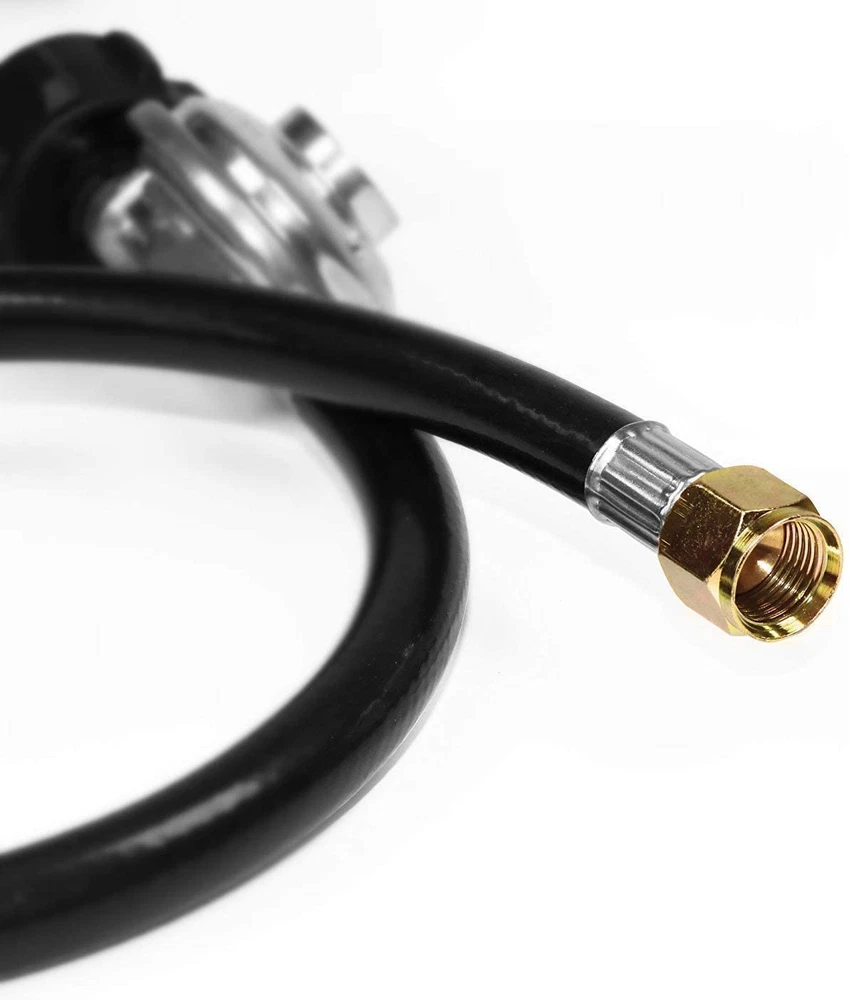 High Quality Material:100% solid brass can be effective corrosion protection. Ensure Your Safety:Our propane regulator with hose has excess flow protection for your safety and will automatically shut off. Convenient Installation: Installs quickly and easily tool-less attachment to propane tanks and cylinders. Apply to: Gas grills ,heaters, lanterns, camp stoves, tabletop grills, fire pit table and more. Great for: BBQ, camping, tailgating, heating needs or having an outdoor cookout. Product Specification: Type:Low pressure(Parallel) Inlet Pressure:25-250 PSI Outlet Pressure:11" W.C. Flow Capacity: 95000 BTU/Hour Certificate:CSA Length:6 feet (length of rubber hose only) For your safety, please read before using the hose. Attention: 1.FULLY TIGHTENED at both propane tank side and grill side before using on your propane appliances. 2.Check and make sure the hose is away from the OPEN FIRE before installing it to your appliances. 3.Keep the hose away from HIGH TEMPERATURE. Equipped with propane tank gauge. Type-1 (QCC-1) tank (cylinder ) connect - fits all appliances with a type 1 connection. 3/8" Female Flare.Nut Thread 5/8"-18UNF. Swivel Nut.5/16" diameter LP hose. Replacement for Weber Genesis 300 series gas grills, Genesis Silver C, Genesis Gold, Genesis Platinum, Spirit E-210/E-310, etc. , Camp Chef Flat Top Griddle, Camp Chef 2-Burner Stove and Blackstone 28in & 36in Griddle, Dyna Glo dgp350snp-d, mfa350bnp/mfa350cnp ge530bsp-d, dge486ssp-d, dge486gsp-d, etc. , Pitboss portable grills and Royal Gourment portable and flat top grills. Easy installation - No tools required, tool-less attachment to tank. It is normal if you hear noise in the regulator, it is the resonance of the gas in the regulator. Safety & corrosion resistant - CSA certificated - Pass CSA certificate for your safety. Provides secure, air-tight connection between grill or fire pit and tank, no gas leaks, ensures safety while using grill, no issues with regulator or gas, air flow is kept stable and at appropriate levels Fits most gas grill, heater, fire pit, lp generator, lantern, two burner camping stove, side burner, and used for most low pressure gas propane application. Fits for Weber, Char-broil, Nexgrill, Monument, Dyna-Glo, Brinkmann grill and other outdoor propane grills with 3/8" male flare fittings.