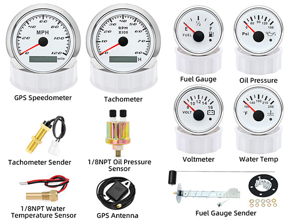 6 Gauge Set 85mm GPS Speedometer 120MPH Tachometer 8000RPM with Senders for Boat 85mm GPS Speedometer 120MPH&Tacho 8000RPM/52mm Fuel/Temp/Oil/Volt with Sensor Features: Suitable for all cars,tractors,vans,vessels,boats,yachts,etc. The signal comes directly from the satellite signal receiver (GPS Speed Sensor) The gauge has the advantages of high precision, quick location confirmation and short start up time. IP67 waterproof and dustproof grade. Stepper motors used for full range of stepping gauges, great feature with its less power consumption,longer life,higher precision,etc. With curved glass (with anti-fogging function). With ultra-wide working voltage design( long-term operating voltage: 9-32V,Maximum up to: 36V (≤ 1 min)). Technical Data: Fixing dimension:85mm(3-3/8 inches) Indicating Range:0-120MPH Item:White&Silver Working Voltage:9-32VDC(12VDC/24VDC) 7 Backlight color:red,green,blue,white,yellow,cyan,purple Tachometer Engine hours:0.0-99999.9H Backlight:7 Color backlight Indicating Range:0~8000 RPM Signal:Pulse For Tachometer,you can substitute for different unit, please contact us before / after purchase or note on the order. Tachometer: 0-3000rpm/0-4000RPM/6000RPM/7000RPM Volt Gauge Sizes:52 mm (2-1/16") Measuring Range:8-16 (V) Backlight: 7 Colors Fuel Level Gauge Sizes:52 mm (2-1/16") Measuring Range:Empty - Full Resistance: 240 (E)-33 (F) ohms Backlight:7 Colors Water Temperature Gauge Install diameter: Φ52mm Indication range: 0~120℃/100-250℉ Input signal: 287.4~22.4 ohm Storage temperature: -40~+85 Backlight: 7 Colors Oil Pressure Gauge Install diameter:Φ52mm or 2-1/16" Indication range:0~10bar/0-145 PSI Operating temperature:-30~+75 Storage temperature:-40~+85 Backlight: 7 Colors Package Includes: 1X 85MM Digital GPS Speedometer Gauge 1X GPS Antenna 1X Tachometer 1X Voltmeter 1X Fuel level gauge 1X Water temp gauge 1X Oil pressure gauge 1x Fuel level Sending Units (240-33ohms) 1X Oil pressure Sensor (1/8NPT) 1X water temp Sensor (1/8NPT) 1X Tachometer Sensor(M16*1.5) Installation Instruction NOTES: The Sending units will be included Payment Delivery details Terms of sales About us Contact us Payment Payoneer is accepted due to payment security and customer convenience concern. To accelerate the shipping process, please clear your payment ASAP after auction closure or placing the order. Delivery details 1. Orders will be processed and dispatched within the handling time after payment is clear, normally it will be handled within 1-2 days. 2. We only ship to confirmed eBay address while you paid. 3. If you have not received your shipment within estimated delivery date from payment, please contact us and we will offer a solution. Please do not worry about the estimated delivery time. Since eBay expands the delivery time to protect the buyer's right. The exact delivery time will take 9-12days, 15-18days. Hope it is OK for you Terms of sales 1. Please contact us within 30 days t from the date you receive your order if you have any issues with the product 2. All returned items MUST BE in the original packaging and you MUST PROVIDE us with the shipping tracking number 3. We will refund YOUR FULL WINNING BID AMOUNT, upon receipt of the item in its original condition and packaging with all components and accessories included. International Customers Please check with your country customs office to determine what these additional costs will be prior to bidding / buying. Import duties,taxes and charges are not included in the item price or shipping charges. These charges are the buyer responsibility About us We are full-time sellers on eBay. We are committed to product quality and customer service. we have sold gauges or sending units on the market over 10 years and welcome any retailed or wholesales business here. Contact us 1.If you have any question or concern, please do not hesitate to contact our customer support team. 2.E-mails are answered Monday through Saturday. Please allow up to 24hours for a response to your message