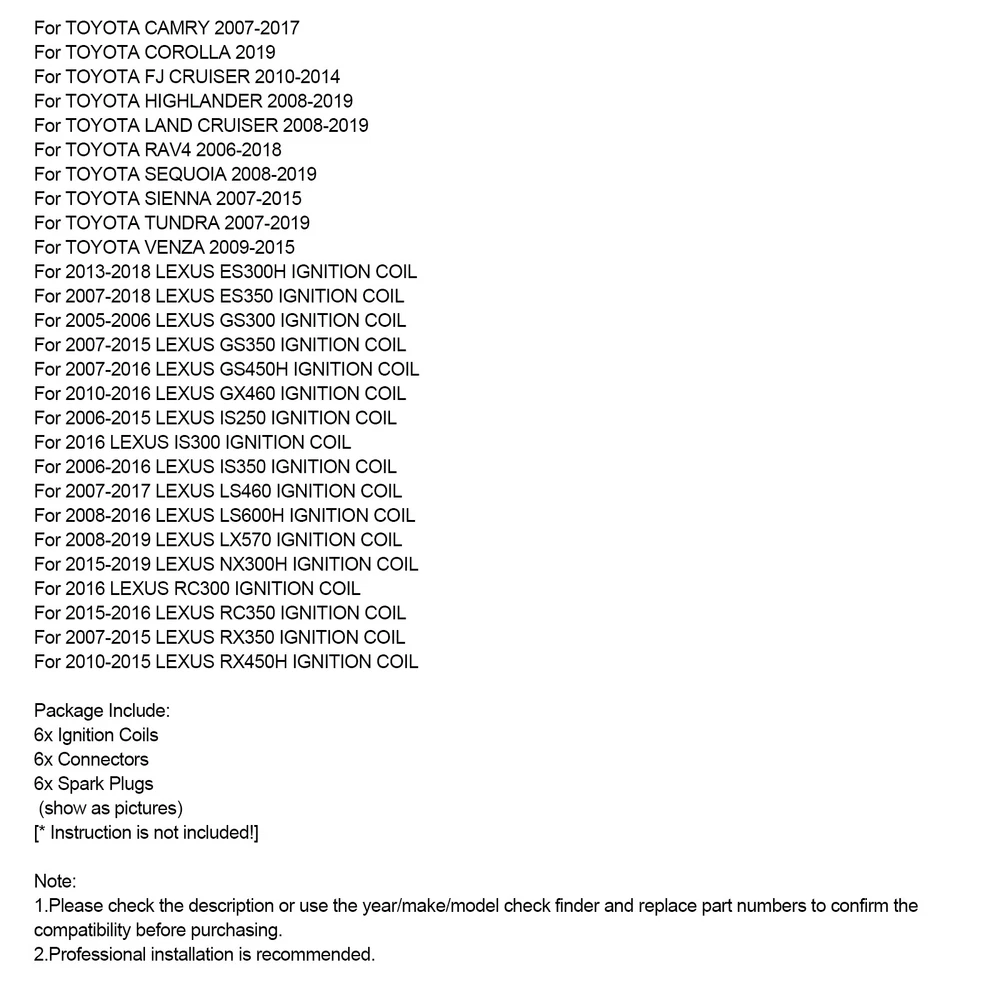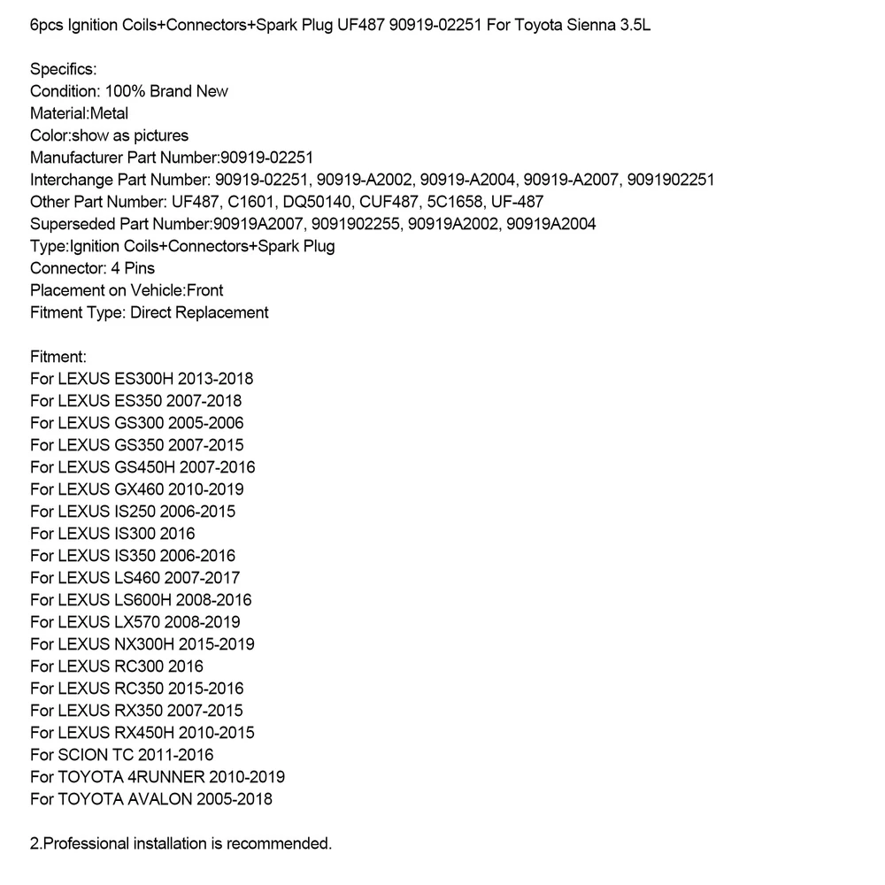 You may also like Ignition Coils+Spark Plug+Wires UF156 For Toyota Tacoma Tundra 4Runner 3.4L V6 115.85 USD Free shipping Ignition Coil 90919-02240 For Toyota Corolla Yaris Prius 1.3L 1.5L 2.4L 23.85 USD Free shipping 8Pack Ignition Coil+Spark Plug+Wires Set UF262 For Chevy Silverado 1500 2500 GMC 132.85 USD Free shipping 8X lgnition Coil +Spark Plug +Wire UF601 For Dodge Durango Dakota Ram 1500 265.86 USD 279.85 USD Free shipping 5% off 8.5MM Electronic Ignition Spark Plug Wire Set For Chevy SBC BBC 350 383 454 69.85 USD Free shipping Ignition Coil Pack 3-Pin BP4W1810XB For Mazda MX-5 1.8 MK2 MX5 1998-2000 86.85 USD Free shipping 8x Spark Plugs +Wires 10.5mm Set 19299585 For Chevy GMC 4.8L 5.3L 6.0L V8 52.11 USD 54.85 USD Free shipping 5% off 2 Ignition Coil Pack 8 Spark Plugs and Wire Set FD487 SP432 For Ford Expedition 84.85 USD Free shipping Red Ignition Coil Wiring Harness Conduit Fits Audi A6 Q5 A5 A8 10-17 A4 Q7 10-16 27.85 USD Free shipping Ignition Coil Pack 1208020 For Vauxhall Corsa 2006-2009 1.2 1.4 Petrol 66.85 USD Free shipping 4x Ignition Coils +Spark Plugs UF602 For Honda Accord CR-V Civic 120.85 USD Free shipping 8x Ignition Coil+Spark Plug+ Wire UF414 For GMC Silverado 1500 Tahoe 5.3L 185.85 USD Free shipping 6pcs Ignition Coils+Connectors+Spark Plug UF487 90919-02251 For Toyota Sienna 3.5L Feature: 1: According to the original factory specifications,perfect match for the original car. 2: Own different test machines to design exact accurate parameter for our products.All items were tested for performance. 3: Made by high quality material, lightweight, anti-rust, colorfast and durable. 4: Aftermarket product with premium quality. 5: Stable performance, high reliability,suitable for replacing your broken one. Specifics: Condition: 100% Brand New Material:Metal Color:show as pictures Manufacturer Part Number:90919-02251 Interchange Part Number: 90919-02251, 90919-A2002, 90919-A2004, 90919-A2007, 9091902251 Other Part Number: UF487, C1601, DQ50140, CUF487, 5C1658, UF-487 Superseded Part Number:90919A2007, 9091902255, 90919A2002, 90919A2004 Type:Ignition Coils+Connectors+Spark Plug Connector: 4 Pins Placement on Vehicle:Front Fitment Type: Direct Replacement Fitment: For LEXUS ES300H 2013-2018 For LEXUS ES350 2007-2018 For LEXUS GS300 2005-2006 For LEXUS GS350 2007-2015 For LEXUS GS450H 2007-2016 For LEXUS GX460 2010-2019 For LEXUS IS250 2006-2015 For LEXUS IS300 2016 For LEXUS IS350 2006-2016 For LEXUS LS460 2007-2017 For LEXUS LS600H 2008-2016 For LEXUS LX570 2008-2019 For LEXUS NX300H 2015-2019 For LEXUS RC300 2016 For LEXUS RC350 2015-2016 For LEXUS RX350 2007-2015 For LEXUS RX450H 2010-2015 For SCION TC 2011-2016 For TOYOTA 4RUNNER 2010-2019 For TOYOTA AVALON 2005-2018 For TOYOTA CAMRY 2007-2017 For TOYOTA COROLLA 2019 For TOYOTA FJ CRUISER 2010-2014 For TOYOTA HIGHLANDER 2008-2019 For TOYOTA LAND CRUISER 2008-2019 For TOYOTA RAV4 2006-2018 For TOYOTA SEQUOIA 2008-2019 For TOYOTA SIENNA 2007-2015 For TOYOTA TUNDRA 2007-2019 For TOYOTA VENZA 2009-2015 For 2013-2018 LEXUS ES300H IGNITION COIL For 2007-2018 LEXUS ES350 IGNITION COIL For 2005-2006 LEXUS GS300 IGNITION COIL For 2007-2015 LEXUS GS350 IGNITION COIL For 2007-2016 LEXUS GS450H IGNITION COIL For 2010-2016 LEXUS GX460 IGNITION COIL For 2006-2015 LEXUS IS250 IGNITION COIL For 2016 LEXUS IS300 IGNITION COIL For 2006-2016 LEXUS IS350 IGNITION COIL For 2007-2017 LEXUS LS460 IGNITION COIL For 2008-2016 LEXUS LS600H IGNITION COIL For 2008-2019 LEXUS LX570 IGNITION COIL For 2015-2019 LEXUS NX300H IGNITION COIL For 2016 LEXUS RC300 IGNITION COIL For 2015-2016 LEXUS RC350 IGNITION COIL For 2007-2015 LEXUS RX350 IGNITION COIL For 2010-2015 LEXUS RX450H IGNITION COIL Package Include: 6x Ignition Coils 6x Connectors 6x Spark Plugs (show as pictures) [* Instruction is not included!] Note: 1.Please check the description or use the year/make/model check finder and replace part numbers to confirm the compatibility before purchasing. 2.Professional installation is recommended. -About US Founded in 2012, VIPJQ have professional development and sales, and are involved in various products, providing customers with various high-quality products. Since its establishment, VIPJQ has always adhered to the service concept of "customer first" and the management concept of "pursuit of quality", and is committed to providing customers with high-quality original designs. We commit to provide you the best innovative, quality products & professional services with competitive prices. We value every customer, and we look forward to providing solutions for your business needs to help your business achieve its goals, please contact us immediately! We are all about you! We are a Japanese seller,but with large warehouse in USA. We are profesional on Auto Parts,Car Parts,Motorcycle Parts,3C,other hot sale items and so on. We aim to provide to customers high quality product and best service. -About Shipment&Returns The item usually will be dispatched within 3 days after you ordered.All are free shipping. And it usually takes 3-5 working days to delivery depends on buyers' address or other majeure on the way. If you are not satisfied with the items and want to return the item,we hope you could message us first,we will give you the return details, we think we could give you the best service to save your time and money.Thank you. -About Feedback&Customer Service If you are enjoy your shopping here,not only enjoy the items but also the service,we are appreciate you could give us a 5-star feedback. If you are not satisfied with the item,before you give us the negative feedback,we hope we could give you the best solution through our commutication. We think we could do it if you give us the chance.Thank you.
