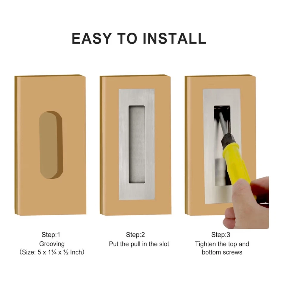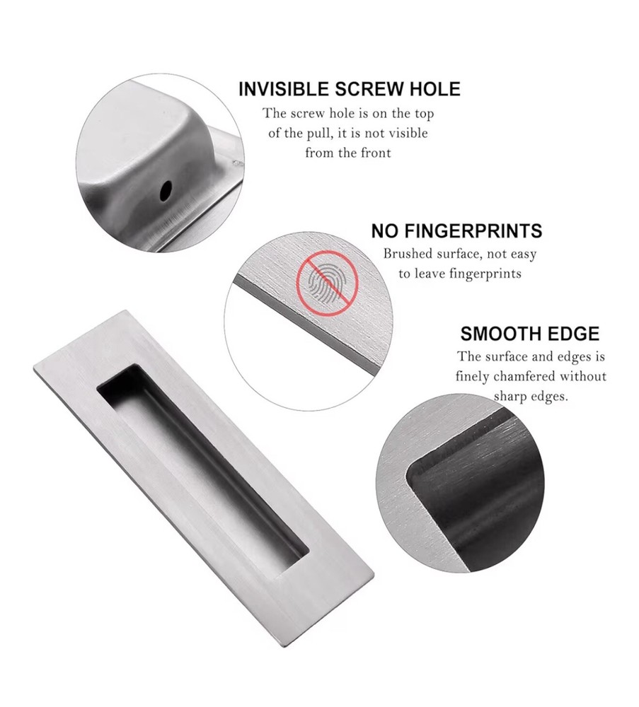 The product is a set of 6-inch recessed finger flush pulls designed for pocket doors, sliding barn doors, and bifold French patio sliding trap doors. Made of rust-resistant and durable stainless steel with a brushed stainless steel finish, these pulls feature a center to center spacing of 2 inches and a projection distance of 0.5 inches. The set includes 2 pulls and screws, making them suitable for indoor use. The heavy-duty style pull handles are designed for sliding doors and have a unique rectangular shape, providing a stylish and functional addition to any home improvement project.