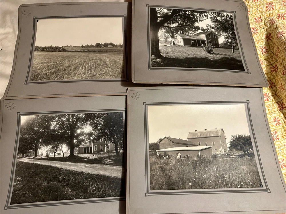Up for sale is a set of 6 vintage mounted photographs showcasing beautiful farm scenes including barns, houses and fields. Each photograph measures 12x14 inches and is printed and applied to a cardboard mount The antique photographs capture the essence of agriculture and rural living. The photographs have a pencil 1919 date. The photographs have not been modified and are in their original state. They are being sold as a lot and would make a great addition to any collection of photographic images. Don't miss the chance to own a piece of American history. Images show some wear around the edges and corners with a few minor chips on the edges. Shipping $8.50
