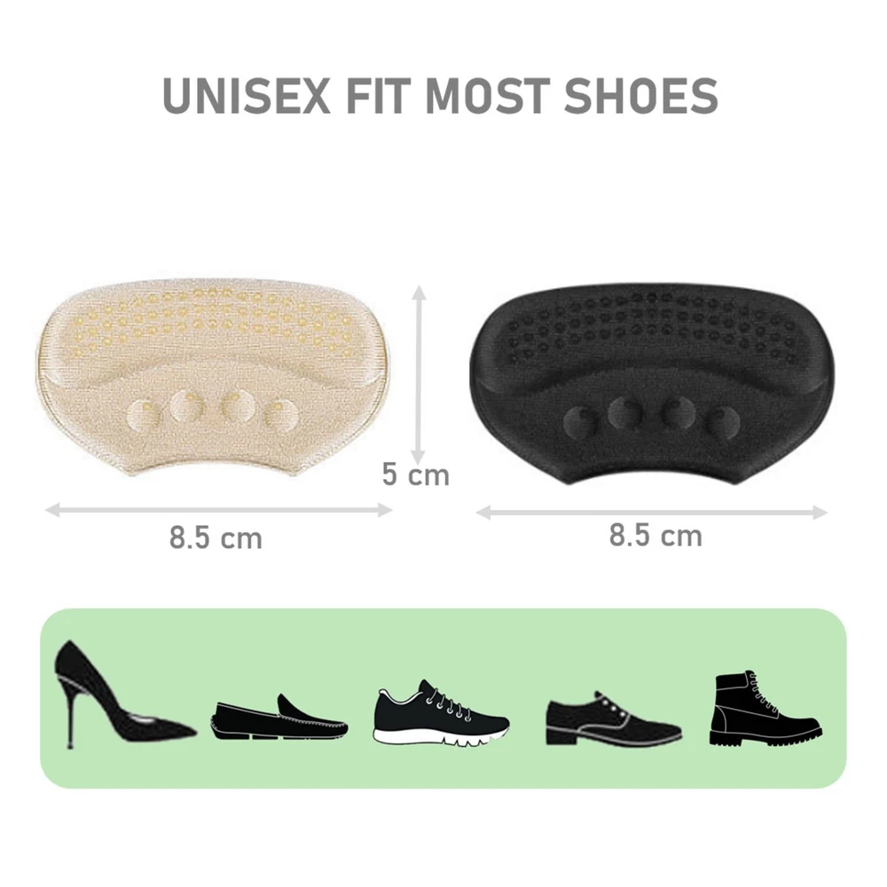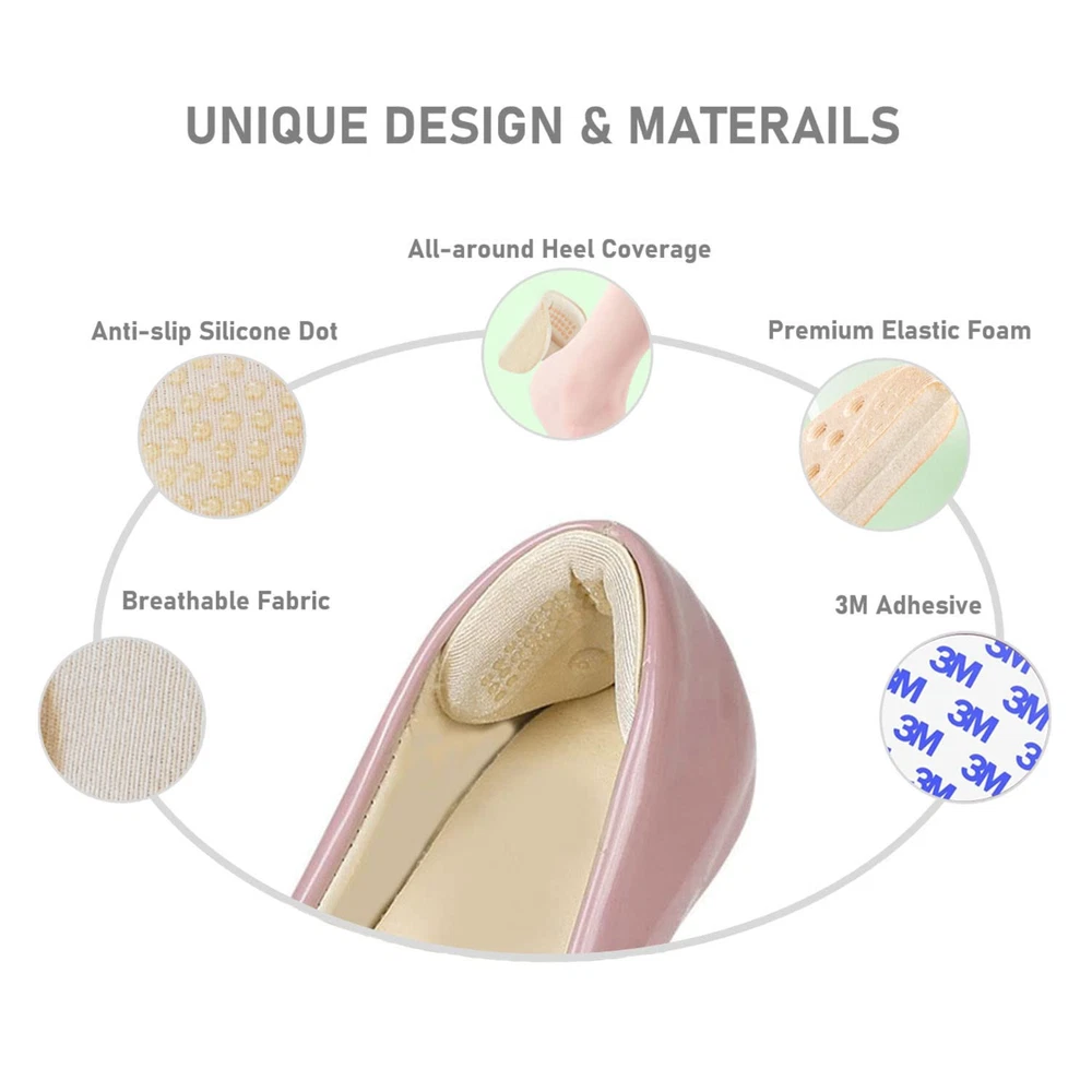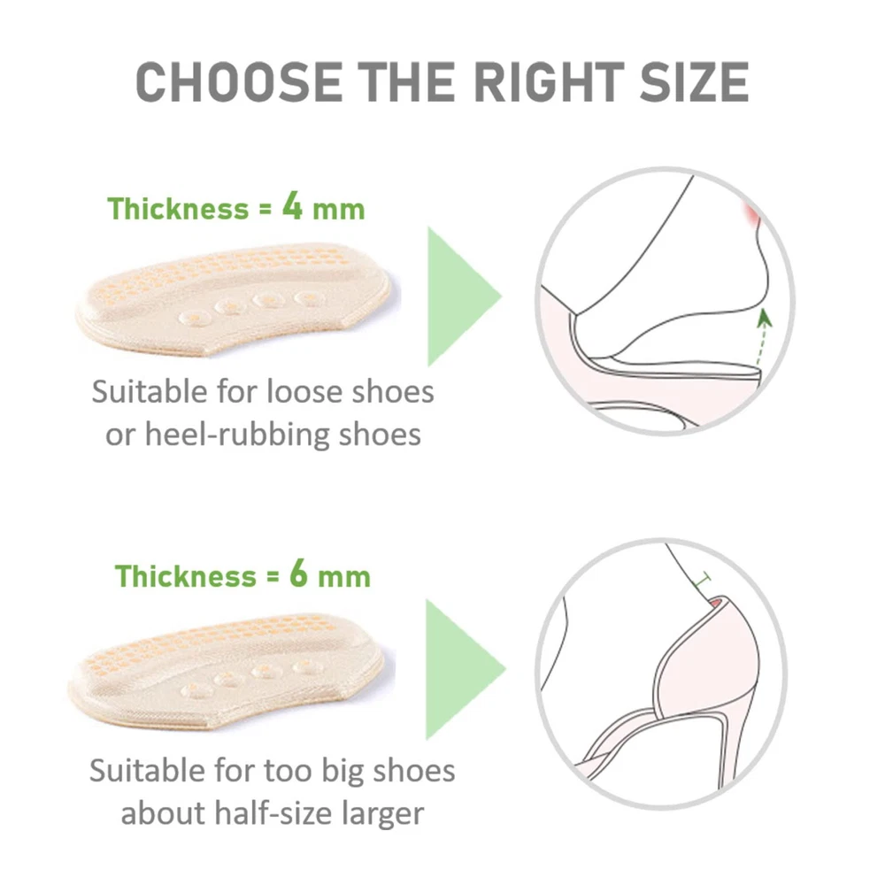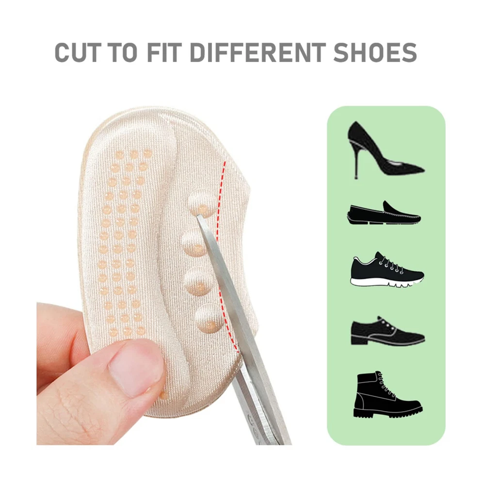 PERFECT SHOE SIZER: designed with a thickness of 6 mm, the extra padding it provides at the heels can make your big shoes fit and comfortable STRONG ADHESIVE: it is made with strong 3M adhesive that can stay firmly on your shoes so you do not have to worry about it falling off BETTER GRIP: it is made with skin-friendly anti-slip gel dots to provide better grip and keep your heels from slipping out BETTER COMFORT: with the high quality breathable fabric and thick shock-absorbing sponge, the heel cushion can provide soft padding around your heel, preventing it from rubbing , blisters or pain while walking ONE FITS ALL: it is designed to fit in any type of shoes including flats, loafers, pumps, high heels and boots etc. You can cut the lower part of it to better fit the shape of specific shoes if needed.