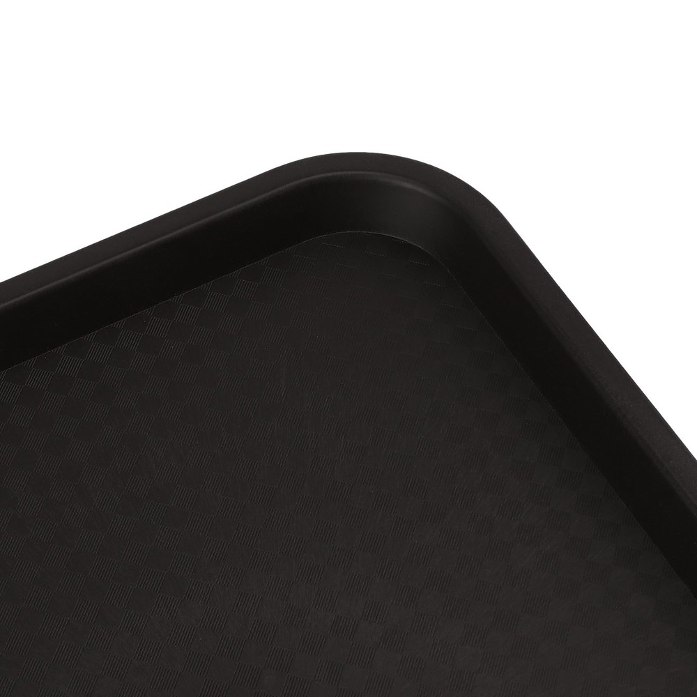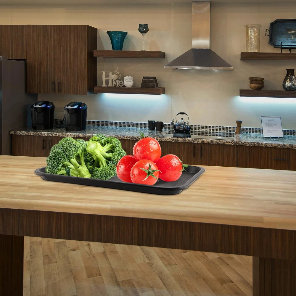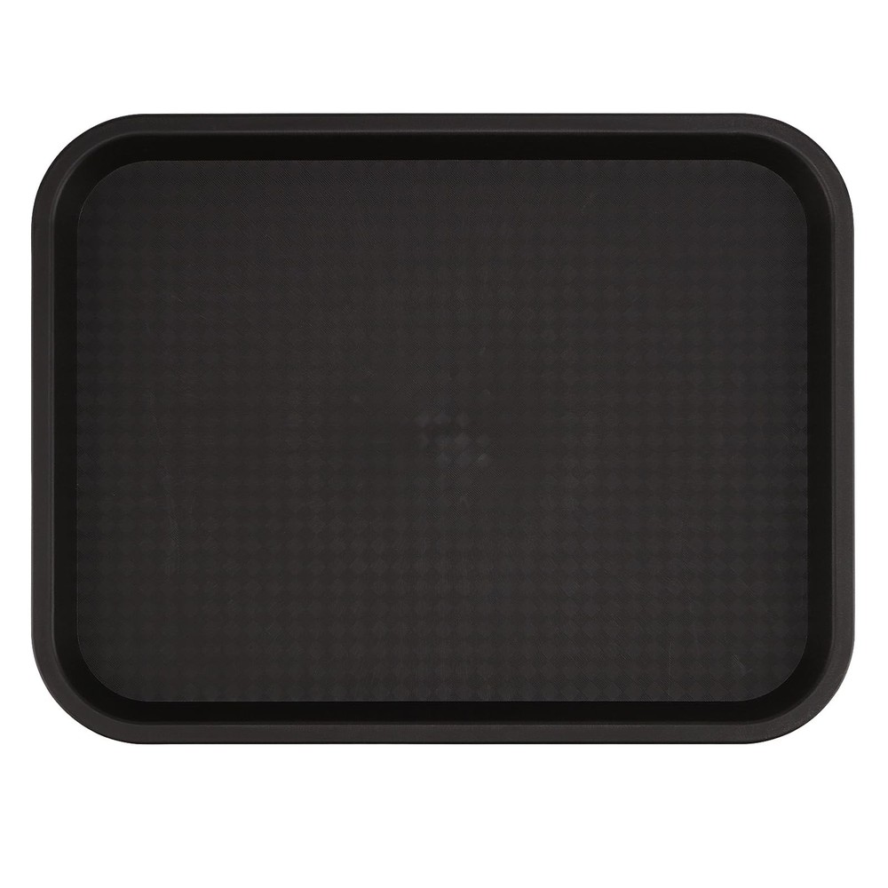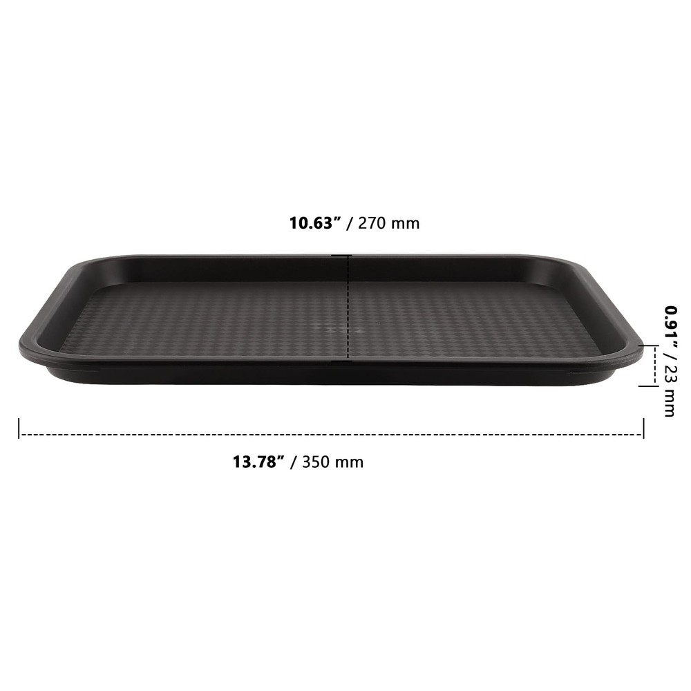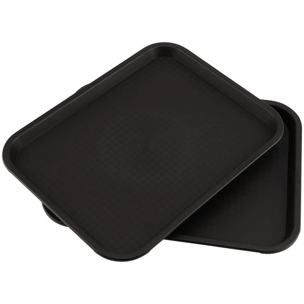 SUPERIOR QUALITY - The fast food tray is made from high impact heavy duty PP plastic, not that thin brittle stuff that breaks easy. It's thick enough, fairly sturdy and has smooth edges, will not easily break, crack or warp. ANTI SLIP DESIGN - This is a plastic rectangle plastic fast food tray with raised edges that keep your small parts from falling and your drinks spilling. The anti slip design on the interior texture surface prevents dishes and other items from sliding while moving while carrying the tray. EASY TO CARRY - Each 14 x 10 inch black plastic tray is lightweight, easy to carry, can be used in carrying and consolidating parts for crafting, assembling items, and other activities, keep items close by and help prevent messes. Also great for serving food other than in the kitchen or dining room, such as carrying meals or snacks into other rooms. DISHWASHER SAFE - The plastic cafeteria trays are easily washed up and stackable when not in use, without taking up too much space. Not only can used as fast food establishments but also for breakfast in bed, picnics, coffee shops, cafes, cafeterias, and food festivals. WORRY-FREE SHOPPING - Please do not hesitate to contact us if any issues with our plastic serving trays, 7 days of 24-hour service after receiving it. Just remember that your satisfaction is our first priority.