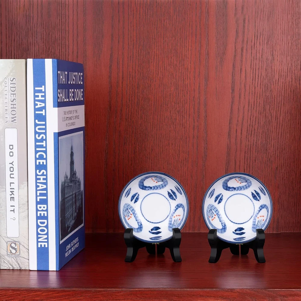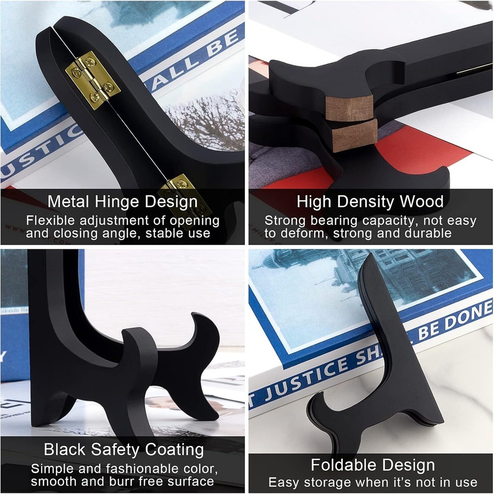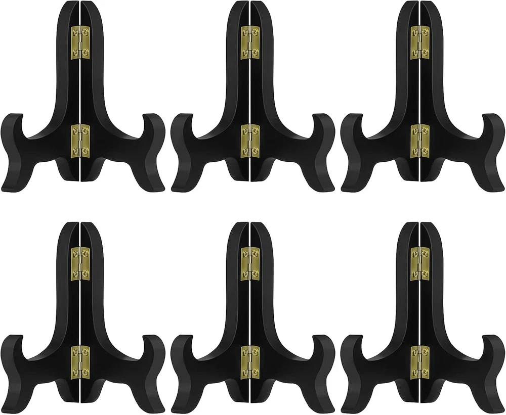 Package includes 6 pcs black wooden display stand plate easels holder, 4 inches tall. The wooden display easel is made of quality wood material, painted black with gold latch, stable and durable. The hinge design can be folded flat for easy storage. The wood plate stand is applied for holding small collectible plates, trays, saucers, tiles, plaques, awards, certificate, photo picture frames and other objects. You can also use the wooden easel stands to display your photo collection, artwork or collection plates at home or at your office desk. Please confirm whether the size and weight of your item are suitable for this 4 inch wooden display stand before purchase, bring you a perfect shopping experience. Product Description The 4 inch wooden display stand is small and lightweight, so it suitable for small item, like cookie, card and small artwork. If you want to hold a plate, 8 Inch is more suitable for plate. It depands on the diameter of the plate. If you want to hold a picture frame, 10 inch will be suitable. It depands on the hight of the picture frame. The item larger than the stand 1-3 inch is perfect.