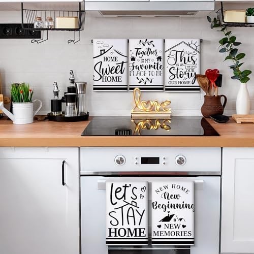Enough to Use: you will receive 6 pieces of kitchen towels in 6 different styles, good for larger kitchens or busy households where frequent towel replacement is required; The convenience of having multiple towels allows you to tackle various tasks simultaneously or have backups for when one is being washed Housewarming Gifts Theme: these black and white kitchen towels are designed with a housewarming theme, decorated with house-shaped pattern and words expressing congratulations on moving into a new home, allowing you to enjoy the joy of new home beginning together Multi Purpose and Versatile Design: our kitchen dish towels are a versatile and valuable addition to your kitchen essentials; These towels can be applied for various purposes, whether it's drying dishes, wiping countertops, cleaning spills, or as stylish kitchen decorations; The size of about 16 x 24 inches/ 40 x 60 cm makes them suitable for handling different tasks, catering to your diverse kitchen needs