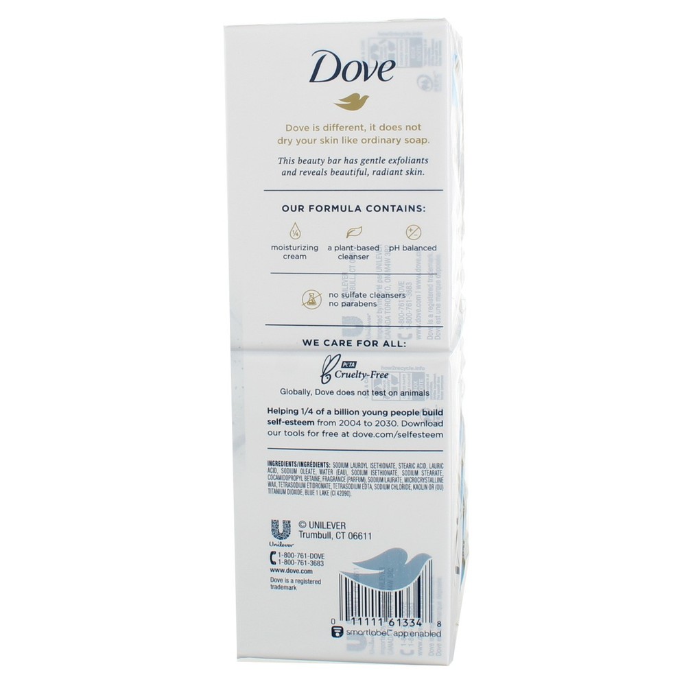 Product Description We've all been told that exfoliation is an important part of your skin care routine, but that doesn't mean being rough with your skin skin exfoliation should be gentle. Thats where Dove Gentle Exfoliating Beauty Bar comes in. It combines gentle skin cleansers with exfoliating beads to wash away dead skin, giving you soft, smooth skin. Suitable for regular use as a facial cleanser or as a gentle skin cleanser for your body and hands, the Gentle Exfoliating Beauty Bar leaves skin feeling beautiful and revitalized. For best results, rub your Dove Beauty Bar cleanser between wet hands and massage the smooth, creamy lather over your skin before rinsing thoroughly. The secret to beautiful skin is moisture, and no ordinary bar soap hydrates skin better than Dove. Formulated with mild cleansers that care for skin as you cleanse, Dove Beauty Bar helps deliver nourishment and leaves your face and body feeling soft and smooth and looking more radiant than ordinary bar soap does. Thats why we call it a Beauty Bar. And now, we are bringing you Dove's same great formula in an all-new look. At Dove, our vision is of a world where beauty is a source of confidence, and not anxiety. Our mission is to help the next generation of women develop a positive relationship with the way they look, helping them raise their self-esteem and realize their full potential. LOCK IN MOISTURE: Dove Gentle Exfoliating Beauty Bar, with exfoliating beads, nourishes and revitalizes skin to give you softer, smoother, more radiant-looking skin than ordinary bar soap. GENTLE EXFOLIATION: Dove Beauty Bar is made with exfoliating beads to wash away dead skin without drying skin like ordinary bar soaps. Its gentle enough to use every day on both body and face. #1 DERMATOLOGIST RECOMMENDED: Formulated with mild cleansers and moisturizing cream, Dove moisturizing Beauty Bar leaves skin instantly soft and smooth with lasting nourishment. RICH HYDRATION: Help maintain your skins natural moisture barrier and hydration with this Beauty Bar, ideal as a cleanser for your face and body. THOUGHTFULLY MADE: This Beauty Bar contains no sulfate cleansers and is certified Cruelty-Free by PETA, so you can feel good about switching from an ordinary soap bar to a Dove Beauty Bar. CARE AS YOU CLEAN: The cleansing efficacy and care you need, all in one skin care product. With 1/4 moisturizing cream Helps remove dull, lifeless skin Promotes soft, smooth skin Ingredients Beauty Bars Gentle Exfoliating Sodium Lauroyl Isethionate, Stearic Acid, Lauric Acid, Sodium Oleate, Water (Eau), Sodium Isethionate, Sodium Stearate, Cocamidopropyl Betaine, Fragrance (Parfum), Sodium Laurate, Microcrystalline Wax, Tetrasodium Etidronate, Tetrasodium EDTA, Sodium Chloride, Kaolin or (ou) Titanium Dioxide, Blue 1 Lake (Cl 42090) Product Description We've all been told that exfoliation is an important part of your skin care routine, but that doesn't mean being rough with your skin skin exfoliation should be gentle. Thats where Dove Gentle Exfoliating Beauty Bar comes in. It combines gentle skin cleansers with exfoliating beads to wash away dead skin, giving you soft, smooth skin. Suitable for regular use as a facial cleanser or as a gentle skin cleanser for your body and hands, the Gentle Exfoliating Beauty Bar leaves skin feeling beautiful and revitalized. For best results, rub your Dove Beauty Bar cleanser between wet hands and massage the smooth, creamy lather over your skin before rinsing thoroughly. The secret to beautiful skin is moisture, and no ordinary bar soap hydrates skin better than Dove. Formulated with mild cleansers that care for skin as you cleanse, Dove Beauty Bar helps deliver nourishment and leaves your face and body feeling soft and smooth and looking more radiant than ordinary bar soap does. Thats why we call it a Beauty Bar. And now, we are bringing you Dove's same great formula in an all-new look. At Dove, our vision is of a world where beauty is a source of confidence, and not anxiety. Our mission is to help the next generation of women develop a positive relationship with the way they look, helping them raise their self-esteem and realize their full potential. LOCK IN MOISTURE: Dove Gentle Exfoliating Beauty Bar, with exfoliating beads, nourishes and revitalizes skin to give you softer, smoother, more radiant-looking skin than ordinary bar soap. GENTLE EXFOLIATION: Dove Beauty Bar is made with exfoliating beads to wash away dead skin without drying skin like ordinary bar soaps. Its gentle enough to use every day on both body and face. #1 DERMATOLOGIST RECOMMENDED: Formulated with mild cleansers and moisturizing cream, Dove moisturizing Beauty Bar leaves skin instantly soft and smooth with lasting nourishment. RICH HYDRATION: Help maintain your skins natural moisture barrier and hydration with this Beauty Bar, ideal as a cleanser for your face and body. THOUGHTFULLY MADE: This Beauty Bar contains no sulfate cleansers and is certified Cruelty-Free by PETA, so you can feel good about switching from an ordinary soap bar to a Dove Beauty Bar. CARE AS YOU CLEAN: The cleansing efficacy and care you need, all in one skin care product. With 1/4 moisturizing cream Helps remove dull, lifeless skin Promotes soft, smooth skin Ingredients Beauty Bars Gentle Exfoliating Sodium Lauroyl Isethionate, Stearic Acid, Lauric Acid, Sodium Oleate, Water (Eau), Sodium Isethionate, Sodium Stearate, Cocamidopropyl Betaine, Fragrance (Parfum), Sodium Laurate, Microcrystalline Wax, Tetrasodium Etidronate, Tetrasodium EDTA, Sodium Chloride, Kaolin or (ou) Titanium Dioxide, Blue 1 Lake (Cl 42090) Warnings CAUTION: AVOID CONTACT WITH EYES. RINSE THOROUGHLY WITH WATER. IF YOU EXPERIENCE DISCOMFORT, PLEASE DISCONTINUE USE. Disclaimer The product descriptions and instructions provided by vitabox.com are for informational purposes only and are qualified in their entirety by the information available from manufacturers of the products. You should carefully read 