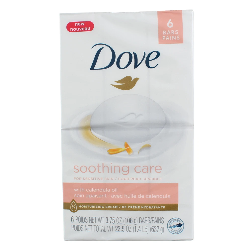 Product Description Dove is proven on sensitive skin. This cleanser provides the cleansing efficacy and care you need and is gentle on your body, face, and hands. It won't dry out your skin like ordinary soap. In fact, regular bar soap can cause the skin to feel dry and tight. But Dove is different! It’s the combination of 100% gentle cleansers and moisturizing ingredients that help to nourish and care for your whole body. You can feel confident that this beauty bar soap for sensitive skin won't dry skin or clog pores and is suitable for the whole family. That’s because Dove isn’t a soap; it’s a Beauty Bar. Start your day with Dove-soft skin. At Dove, our vision is of a world where beauty is a source of confidence and not anxiety. Dove Soothing Care Moisturizing Beauty Bar 3.75 oz 6 Bars - GENTLE ON SENSITIVE SKIN: Effectively hydrate and replenish your skin and wash away bacteria with Dove Soothing Care beauty bar. With its hypoallergenic formula, it gently cleanses for softer skin - HYPOALLERGENIC FORMULA: Dove Soothing Care Beauty Bar soap for sensitive skin is made with calendula oil, and has no sulfate cleansers or parabens - #1 DERMATOLOGIST RECOMMENDED: Formulated with 100% gentle cleansers and ¼ moisturizing cream, Dove Soothing Care Beauty Bar is proven to nourish and care for sensitive skin - MILD AND MOISTURIZING: Help maintain your skin’s natural moisture barrier and hydration with this skincare beauty bar, which is gentle enough for your face, moisturizing enough for the whole body - GENTLE CLEANSING: Lather in the luxurious feel of this beauty bar that won’t dry skin like ordinary bath soap or bar soap can. The cleansing efficacy and care you need, all in one product Ingredients Ingredients Sodium Lauroyl Isethionate, Stearic Acid, Lauric Acid, Sodium Oleate, Water (Eau), Sodium Isethionate, Sodium Stearate, Cocamidopropyl Betaine, Fragrance (Parfum), Calendula Officinalis Flower Extract, Sodium Laurate, Sodium Chloride, Tetrasodium Etidronate, Tetrasodium EDTA, Kaolin or (ou) Titanium Dioxide Product Description Dove is proven on sensitive skin. This cleanser provides the cleansing efficacy and care you need and is gentle on your body, face, and hands. It won't dry out your skin like ordinary soap. In fact, regular bar soap can cause the skin to feel dry and tight. But Dove is different! It‚Äôs the combination of 100% gentle cleansers and moisturizing ingredients that help to nourish and care for your whole body. You can feel confident that this beauty bar soap for sensitive skin won't dry skin or clog pores and is suitable for the whole family. That‚Äôs because Dove isn‚Äôt a soap; it‚Äôs a Beauty Bar. Start your day with Dove-soft skin. At Dove, our vision is of a world where beauty is a source of confidence and not anxiety. Dove Soothing Care Moisturizing Beauty Bar 3.75 oz 6 Bars - GENTLE ON SENSITIVE SKIN: Effectively hydrate and replenish your skin and wash away bacteria with Dove Soothing Care beauty bar. With its hypoallergenic formula, it gently cleanses for softer skin - HYPOALLERGENIC FORMULA: Dove Soothing Care Beauty Bar soap for sensitive skin is made with calendula oil, and has no sulfate cleansers or parabens - #1 DERMATOLOGIST RECOMMENDED: Formulated with 100% gentle cleansers and ¬º moisturizing cream, Dove Soothing Care Beauty Bar is proven to nourish and care for sensitive skin - MILD AND MOISTURIZING: Help maintain your skin‚Äôs natural moisture barrier and hydration with this skincare beauty bar, which is gentle enough for your face, moisturizing enough for the whole body - GENTLE CLEANSING: Lather in the luxurious feel of this beauty bar that won‚Äôt dry skin like ordinary bath soap or bar soap can. The cleansing efficacy and care you need, all in one product Ingredients Ingredients Sodium Lauroyl Isethionate, Stearic Acid, Lauric Acid, Sodium Oleate, Water (Eau), Sodium Isethionate, Sodium Stearate, Cocamidopropyl Betaine, Fragrance (Parfum), Calendula Officinalis Flower Extract, Sodium Laurate, Sodium Chloride, Tetrasodium Etidronate, Tetrasodium EDTA, Kaolin or (ou) Titanium Dioxide Suggested Use Read complete instructions before use Disclaimer The product descriptions and instructions provided by vitabox.com are for informational purposes only and are qualified in their entirety by the information available from manufacturers of the products. You should carefully read all product packaging, and contact the manufacturer with any questions before using a product. While we endeavor to ensure that product descriptions are current, manufacturers sometimes change their products. We are not liable for inaccuracies or misstatements about products. We do not provide medical advice or recommendations. You should not use the information provided by vitabox.com for diagnosing or treating a health problem or disease. If you have or suspect that you have a medical problem, immediately contact your health care provider. Information and statements regarding dietary supplements have not been evaluated by the Food and Drug Administration or any other government agency and are not intended to diagnose, treat, cure, or prevent any disease.