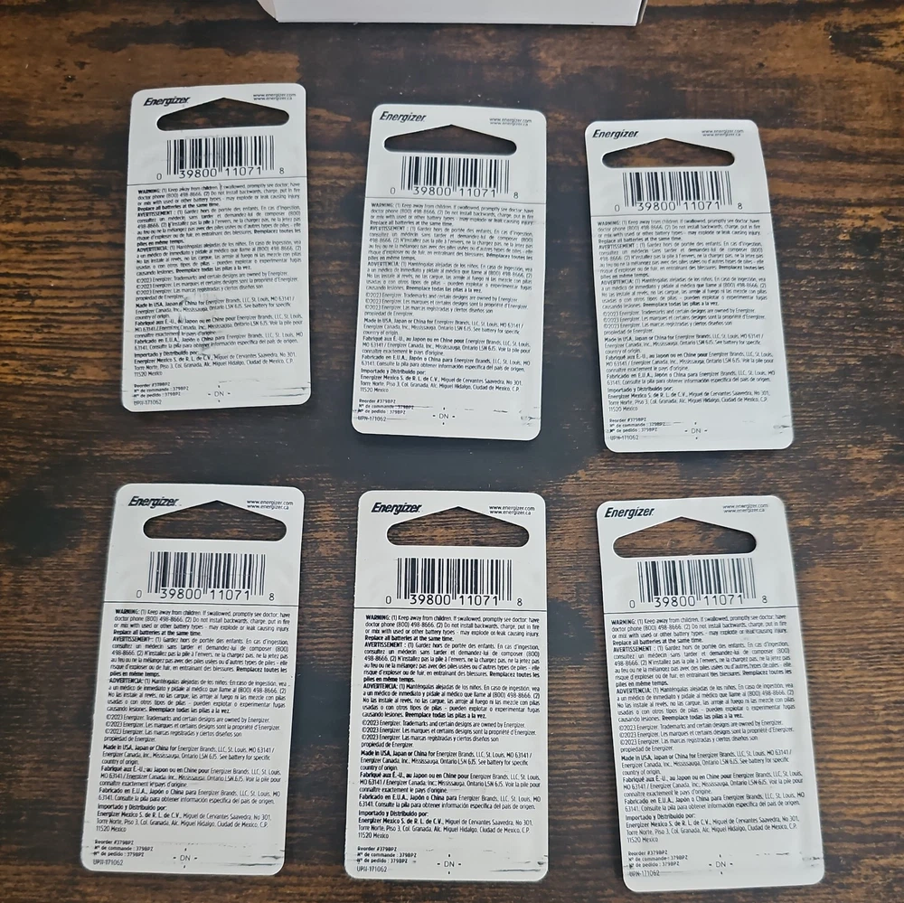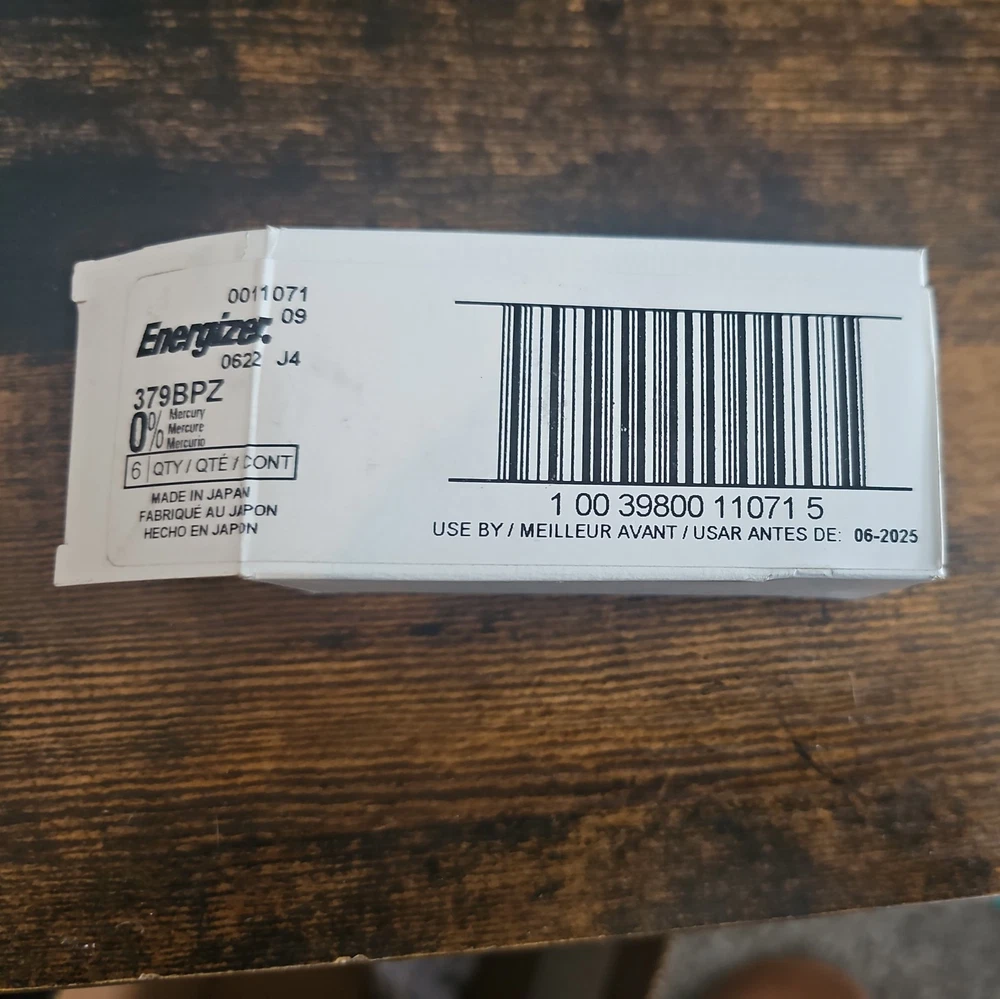 This is a 6-pack of Energizer Silver Oxide Watch/Electronic Batteries, model #379 1.5V 379BPZ. The batteries are standard size, coin/button cells ideal for use in watches and various electronic devices. They are silver in color and have a chemical composition of silver oxide, providing reliable power for consumer electronics.