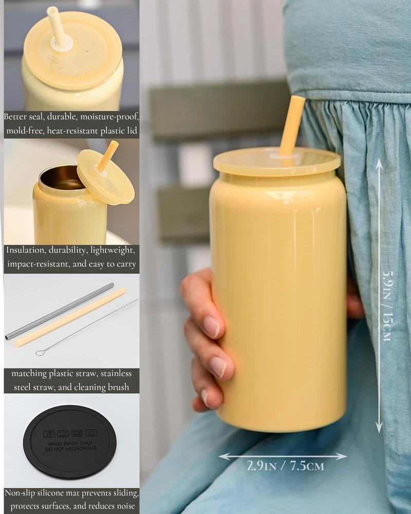 6 Pack Glass Cups with Lids and Straws, 16oz Stainless Steels Cups, Beer Cups...