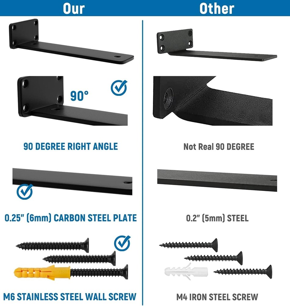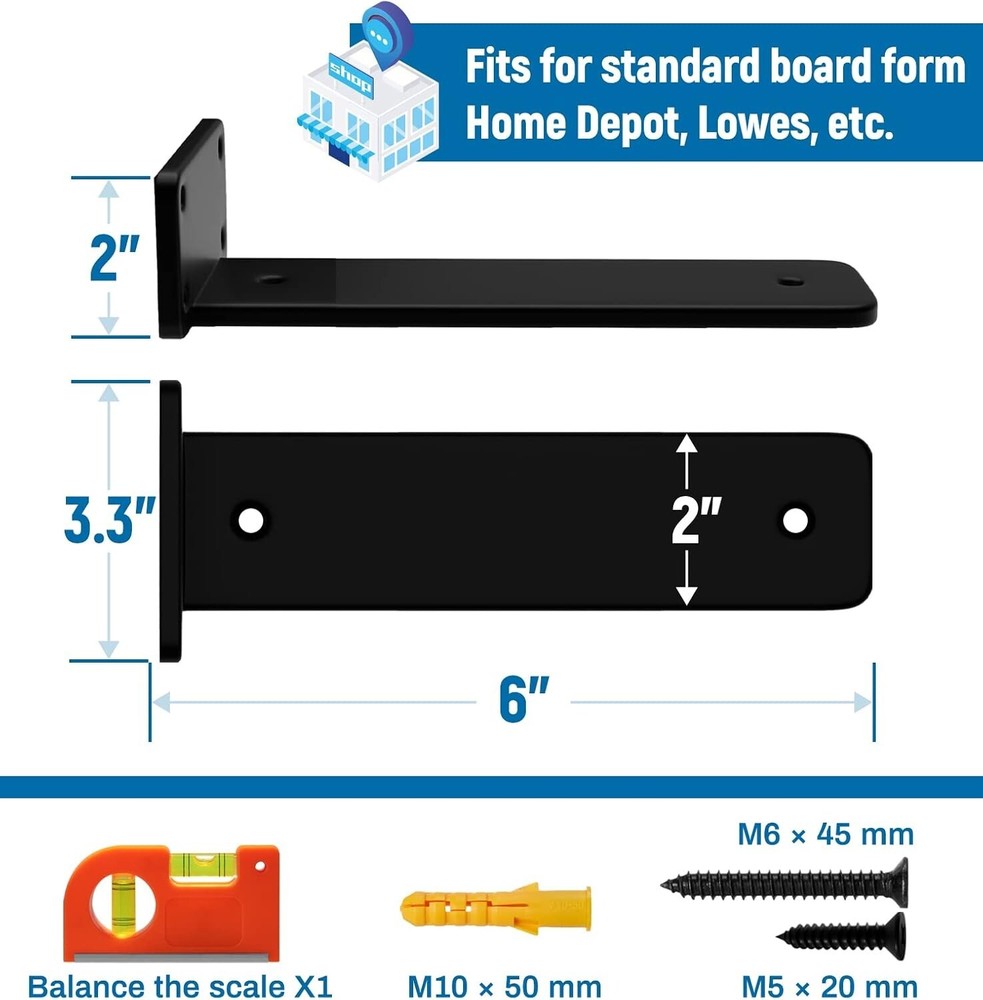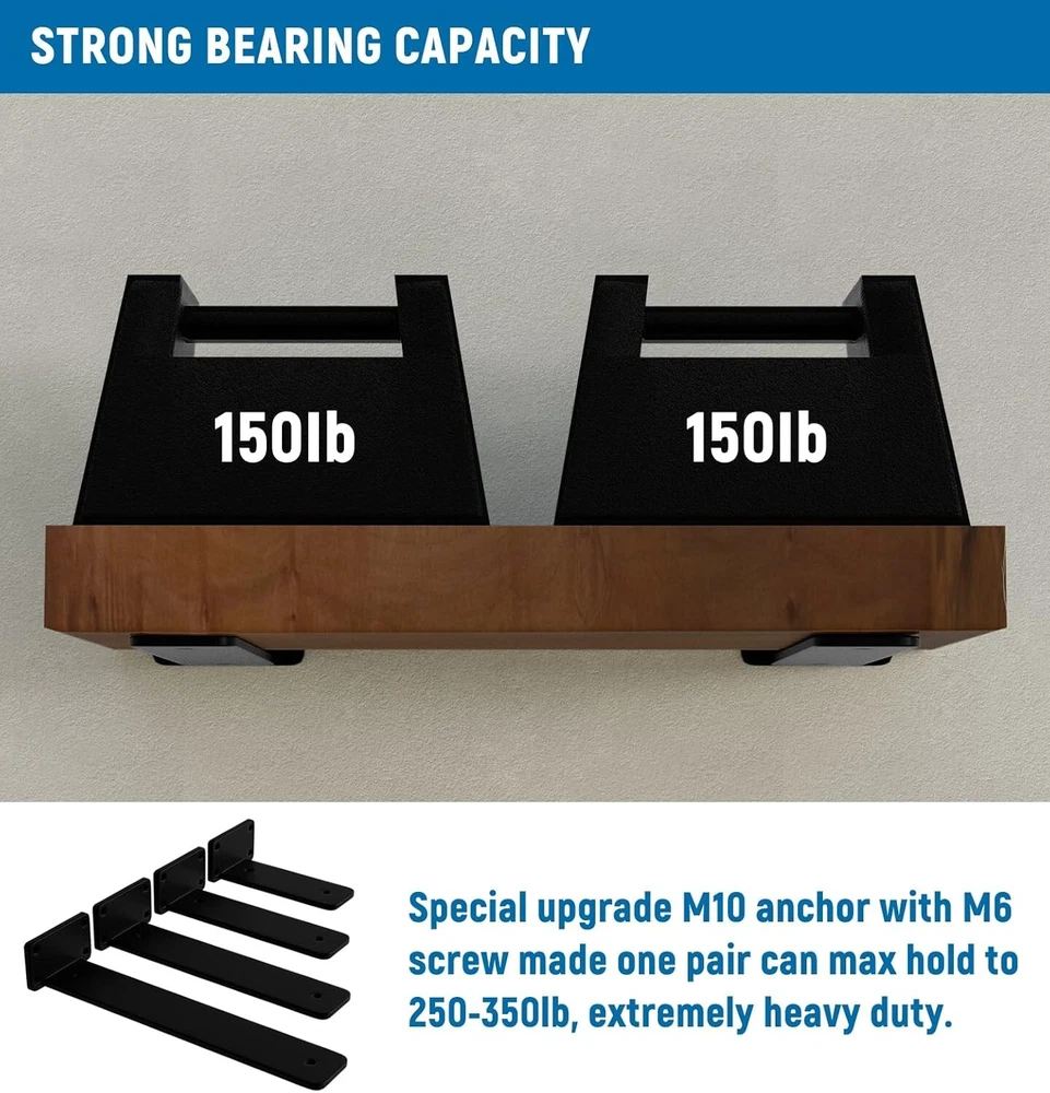 6 Inch 6 Pack Floating Shelf Bracket 1/4 Thick Heavy Duty Rustic Industrial Size: 6 Inch Color: black-6 pack Material: Carbon Steel Item dimensions L x W x H: 6 x 4 x 1.6 inches Item Depth: 6 inches Heavy duty, invisible & elegant. Three in one design concept made this sleek and contemporary LEOPO T-type shelf bracket has a neat, contemporary look and multiple uses around the house.This product is protected under U.S. Patent D1012683S. This bracket is industrial all over with measure 6” x 3” x 2.2” (wood board is not included), blends with some rustic styles and it’s versatile to fit any DIY project 1/4-inch carbon steel offers good weldability and machinability. Shelf brackets heat, treated to harden its rougher surface with galvanization, resists corrosion well. Special upgrade M10 anchor with M6 screw made one pair can max hold to 350lb, extremely heavy duty Floating invisible design adds an artful dimension to wall storage and display. It makes eye-catching wall art out of displayed books, collections, or picture frame