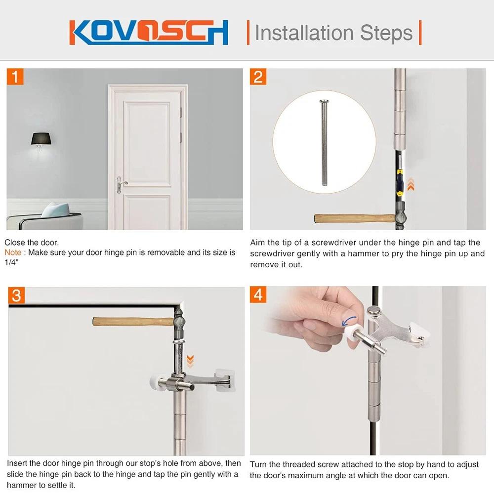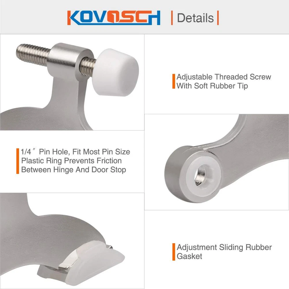 Color:Satin Nickel Are you already tired of the sudden slamming of doors, worried that the knob might knock a hole in the wall? You don't have to worry about that after you choose hinge pin door stop. door stop is easy to install. It's adjustable, turn the threaded screw attached to the stop, find the appropriate angle to keep your door away from your wall. Keep your door and wall safe and beautiful. NO more dents & holes on the wall. Dress Up Your Home With Hardware. Your Home, Your Choice! ** ADVICE ** A lot of people would paint their hinge pin stop. To avoid peeling the paint when installing a door stop, when tapping the hammer down on the top of the hinge pin, keep a towel on top of the hinge pin if your stop is painted ! It will keep the paint on the door hinge. ** WARNING ** Don't set the door's maximum angle of travel to less than 90 degrees. NO MORE DENTS & HOLES: Sturdy door stops prevent doors from slamming into walls, stopping them when you choose. EASY TO INSTALL: Installation of a door stop won't take more than 1-3 minutes. HIGH QUALITY: hinge pin door stop is made of hard metal-zinc alloy. Meanwhile, it has high quality rubber bumper - shoulder on stub supports rubber through entire body for engineered cushioning. MULTIPLE COLORS:Available in 5 colors: Satin Nickel, Black, Oil Rubbed Bronze, White, Bright Brass. RELIABLE:If there is any quality problem, please feel free to us. or for any quality problem.